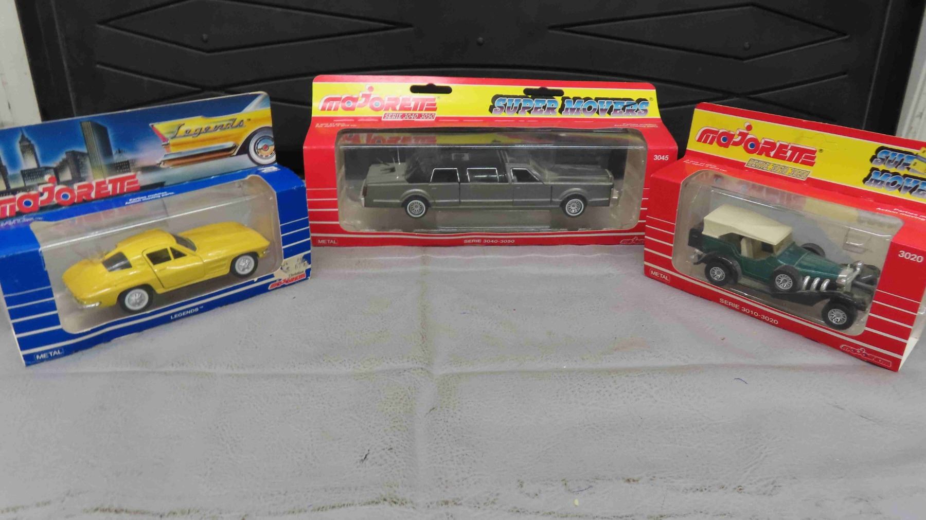 3 Majorette Die Cast Metal With Plastic Parts Cars ; 3020 Excaliber, Corvette, Lincoln Stretch Limo New in Package
