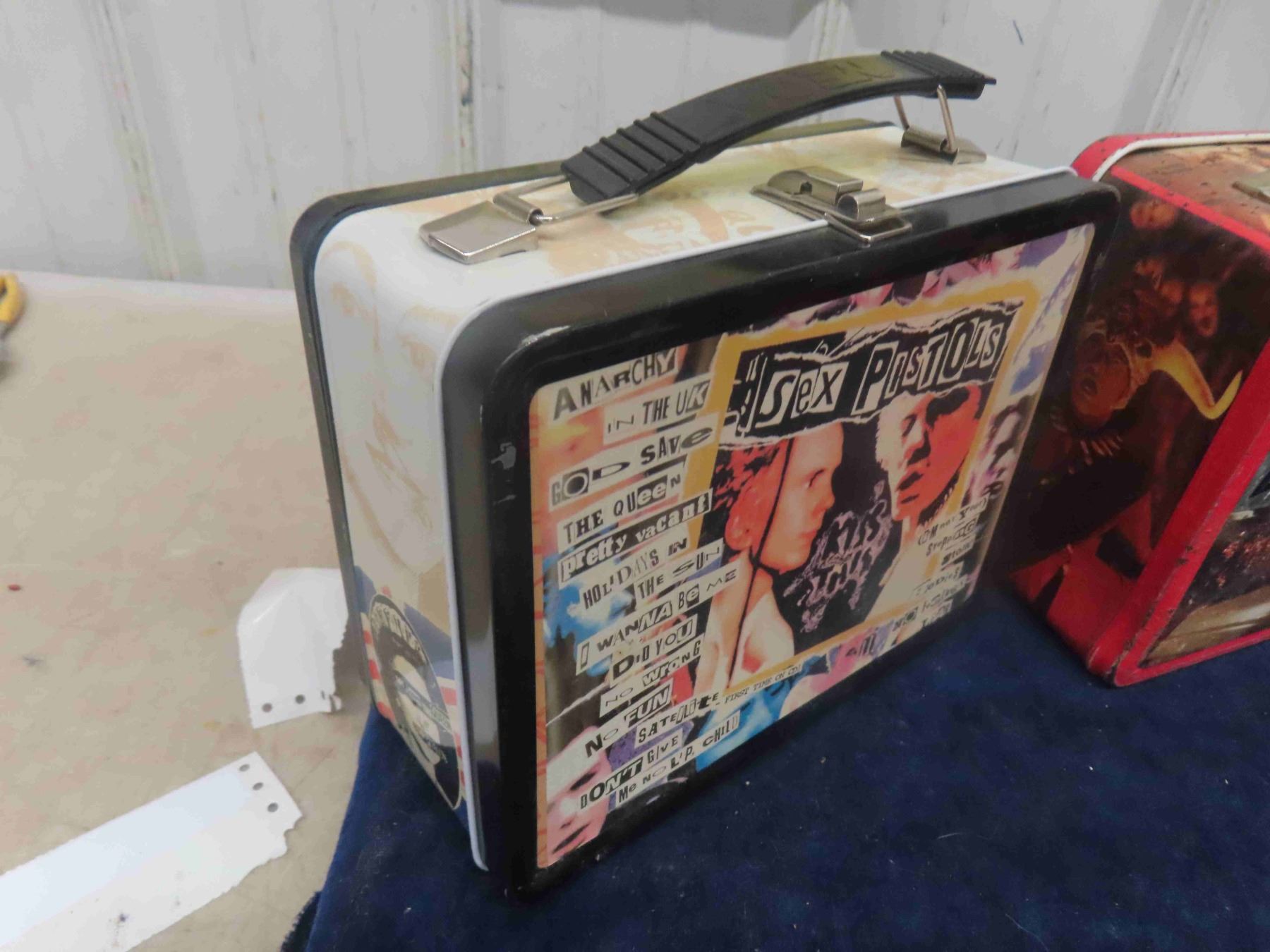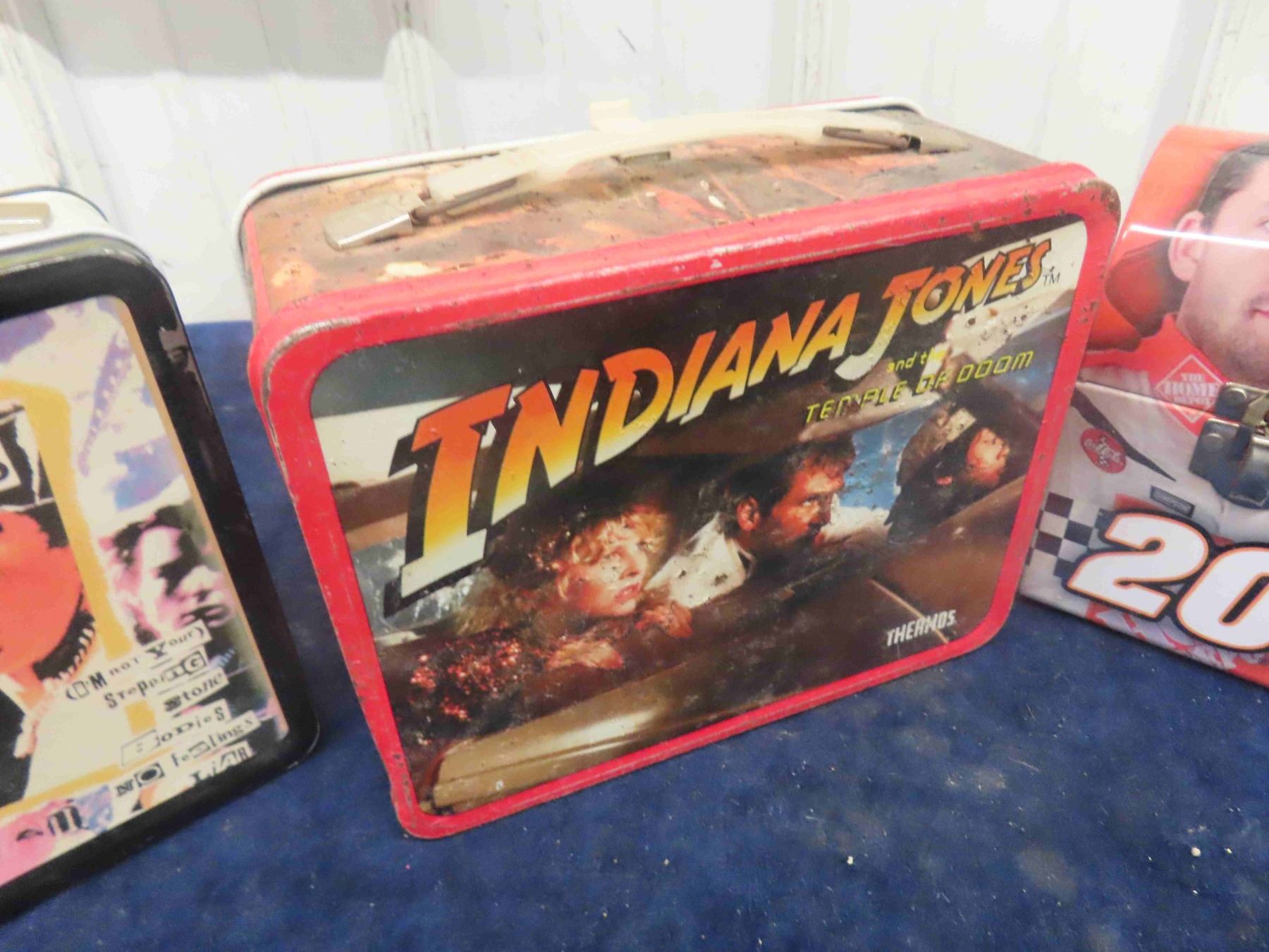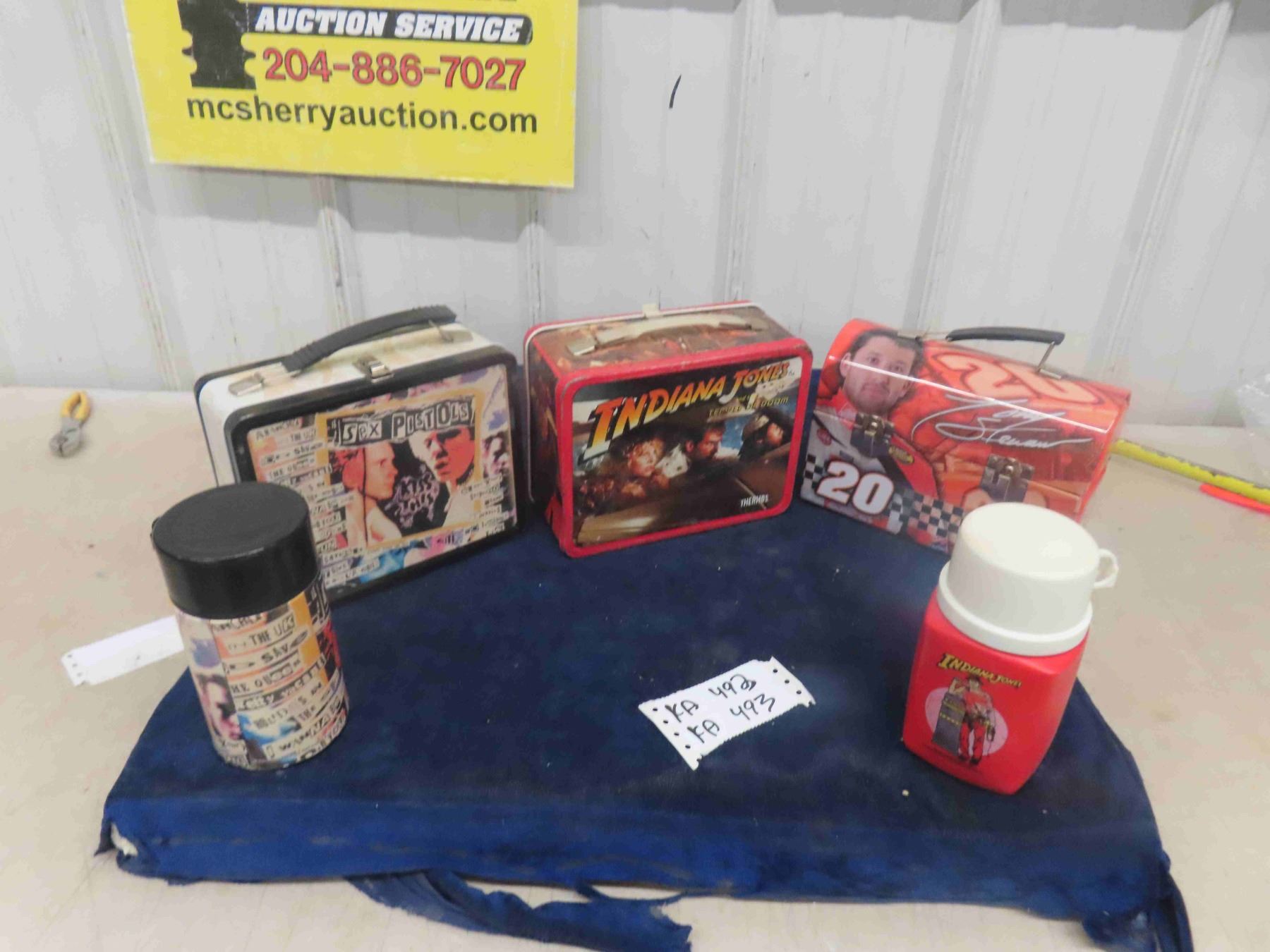 3 Metal Lunch Kits ; Sex Pistols + Thermos, Indiana Jones + Thermos & Nascar