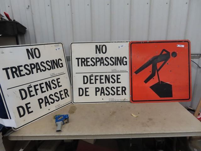 3 Metal Signs - 2 Are No Trespassing - Minister of Transportation, and 1 Men Working - Construction
