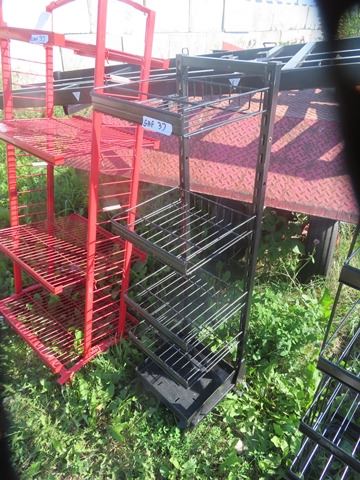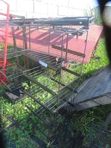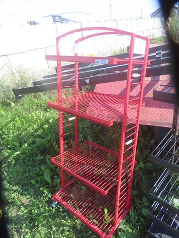 3 Metal Store Shelving Units - red one missing 2 castors
