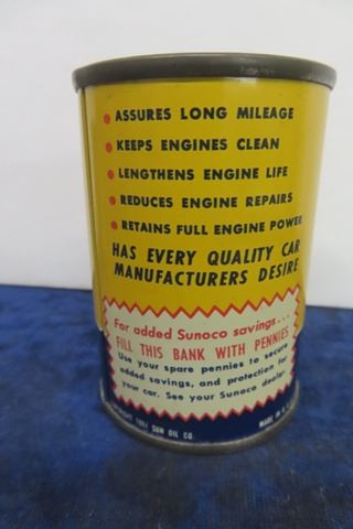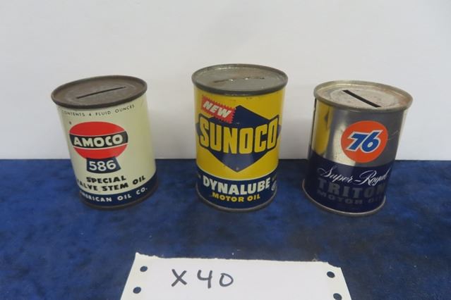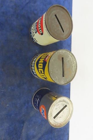 3 Miniature Oil Tin Promo Banks ; Amaco Valve Stem Sunoco Dynalube, 76 Triton