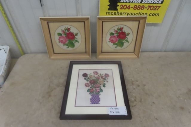 3 Needlepoint Floral Pictures- Largest 15.5 ×17.5