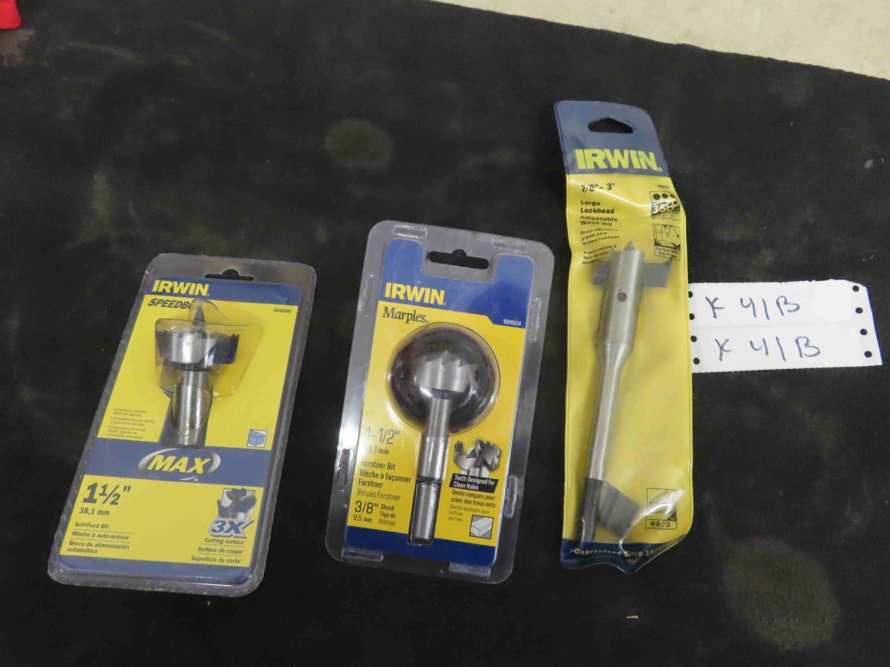3 New Irwin Wood Bits: 7/8''-3'' Large Lock Head Adjustable Table Wood Bit, 1''-1/2'' Forstner Bit, 1 1/2'' Self Feed Bit