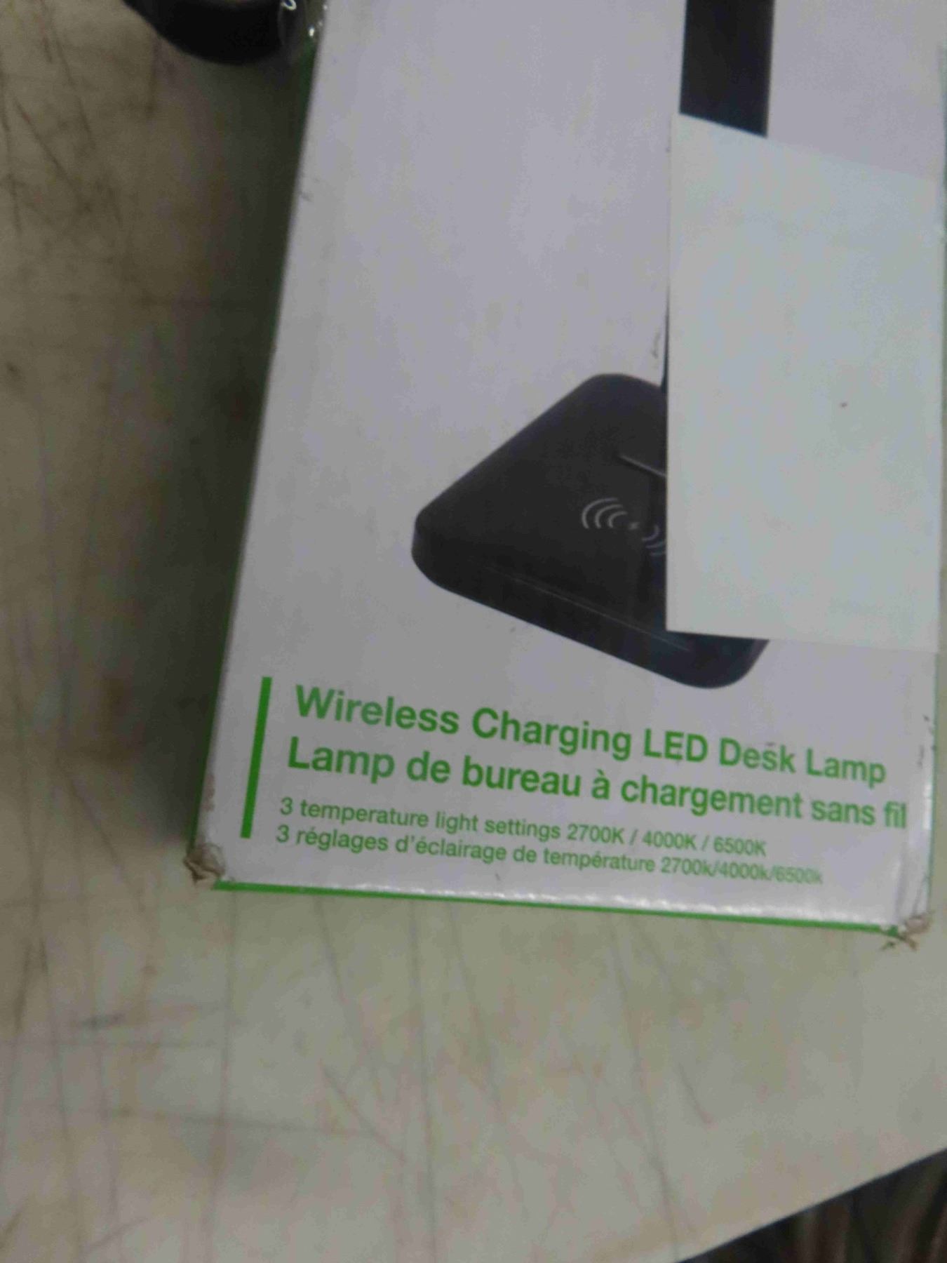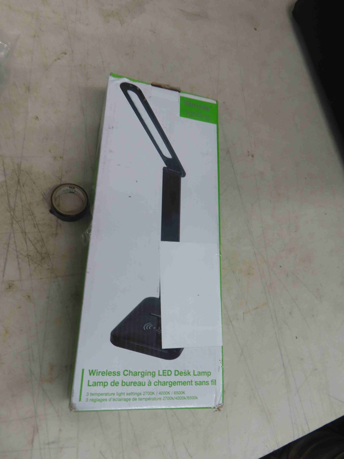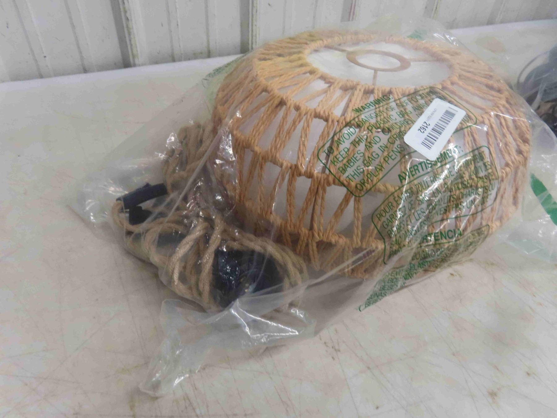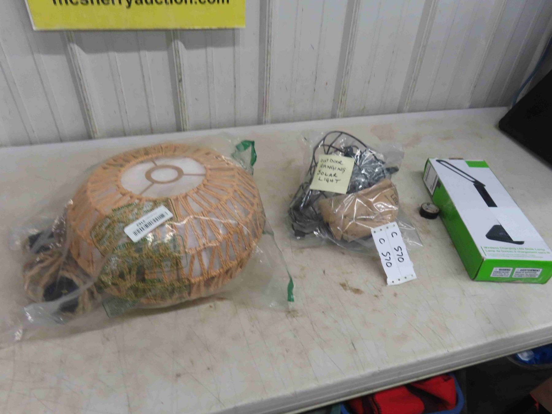 3 New Light Fixtures (1) Swag (1) Outdoor Hanging Solar Light (1) Wireless Charge LED Desk Lamp