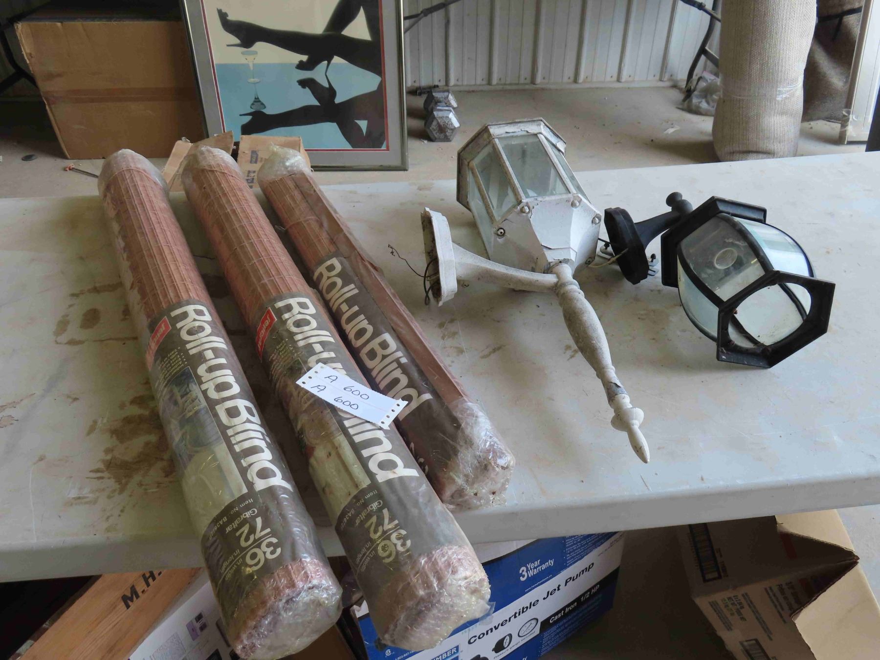 3 New Old Stock Roll-Up Blind (2) 36'' x 72'' (1) 30'' x 48'' , 2 Exterior Lamp Style Light Fixtures