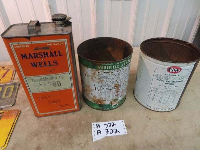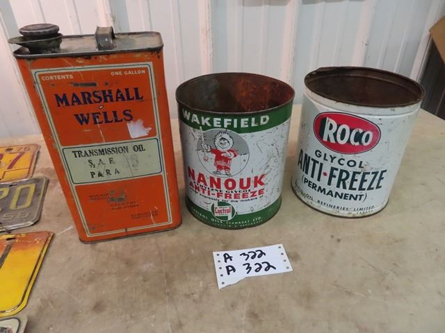 3 Oil Cans 1)Castrol Nanouk Antifreeze 1 Gal, 1) ROCO Antifreeze 1 Gal, & 1) Marshall Wells Trans Oil 1 Gal