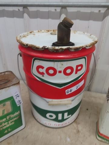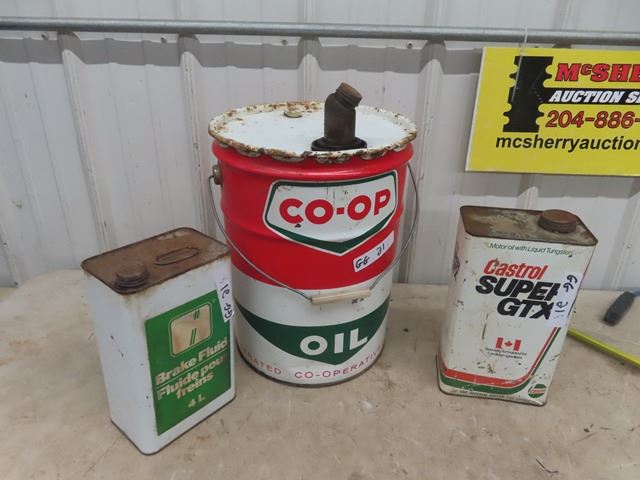 3 Oil Cans - Coop Oil 5 Gal- Castrol Oil 1 GAL- Brake Fluid 4 Litre