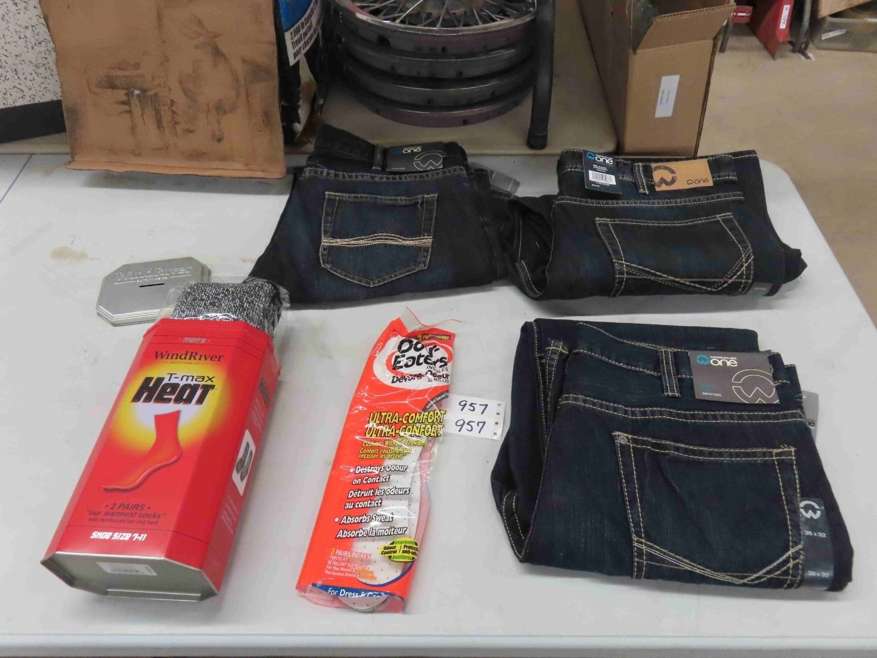 3 Pairs of Jeans - New ; (2) 36/32 + (1) 36/30 & 2 Pair Windriver Socks