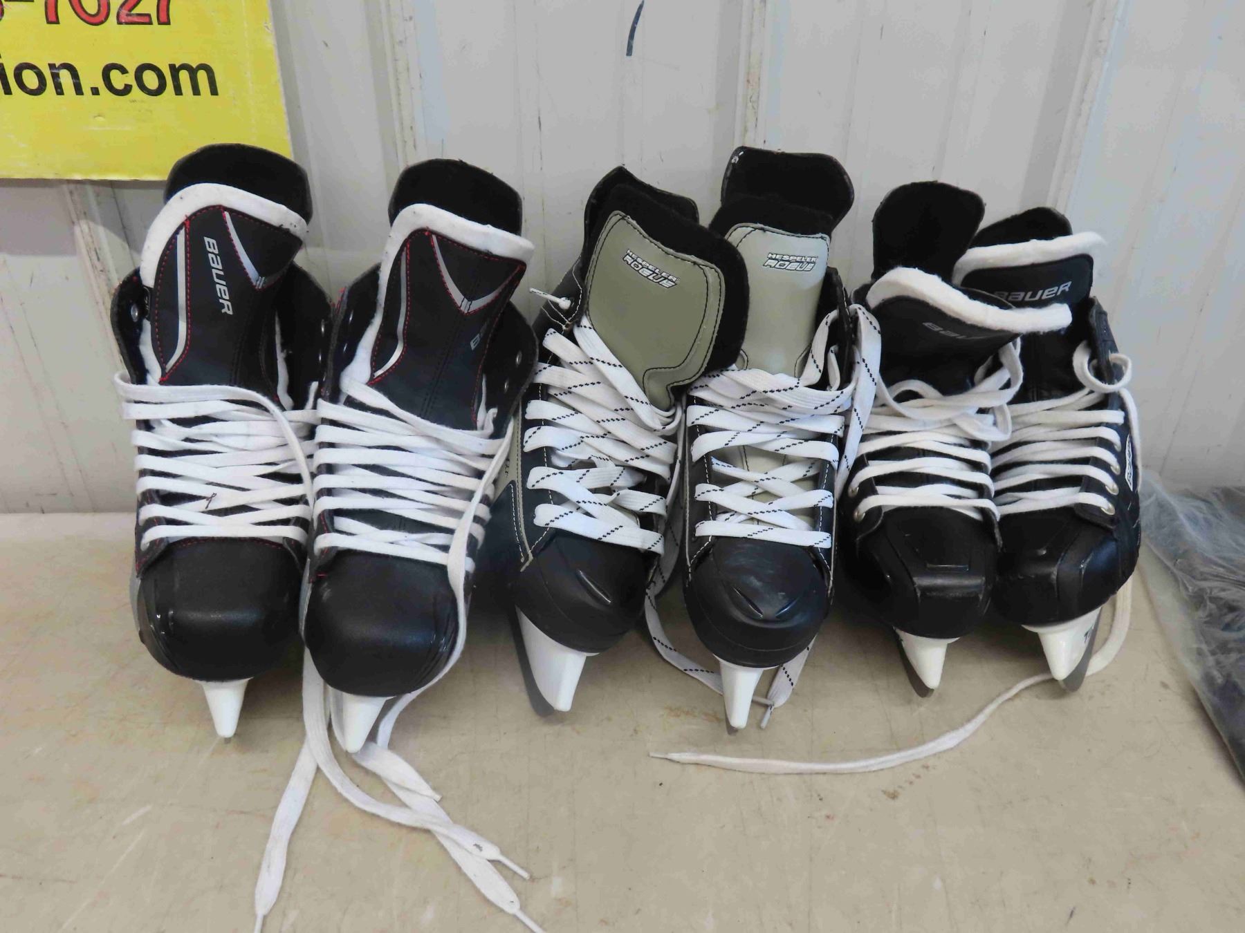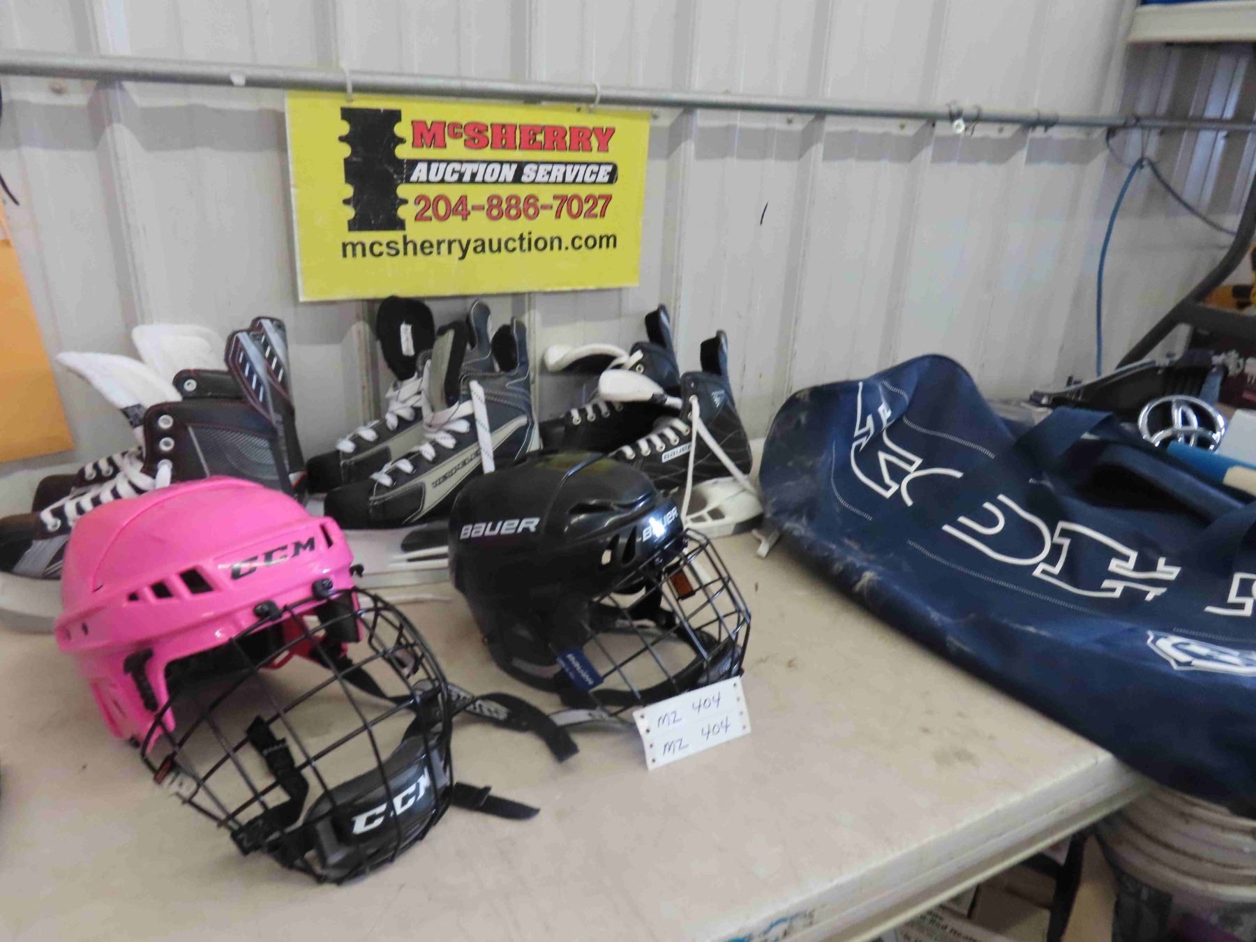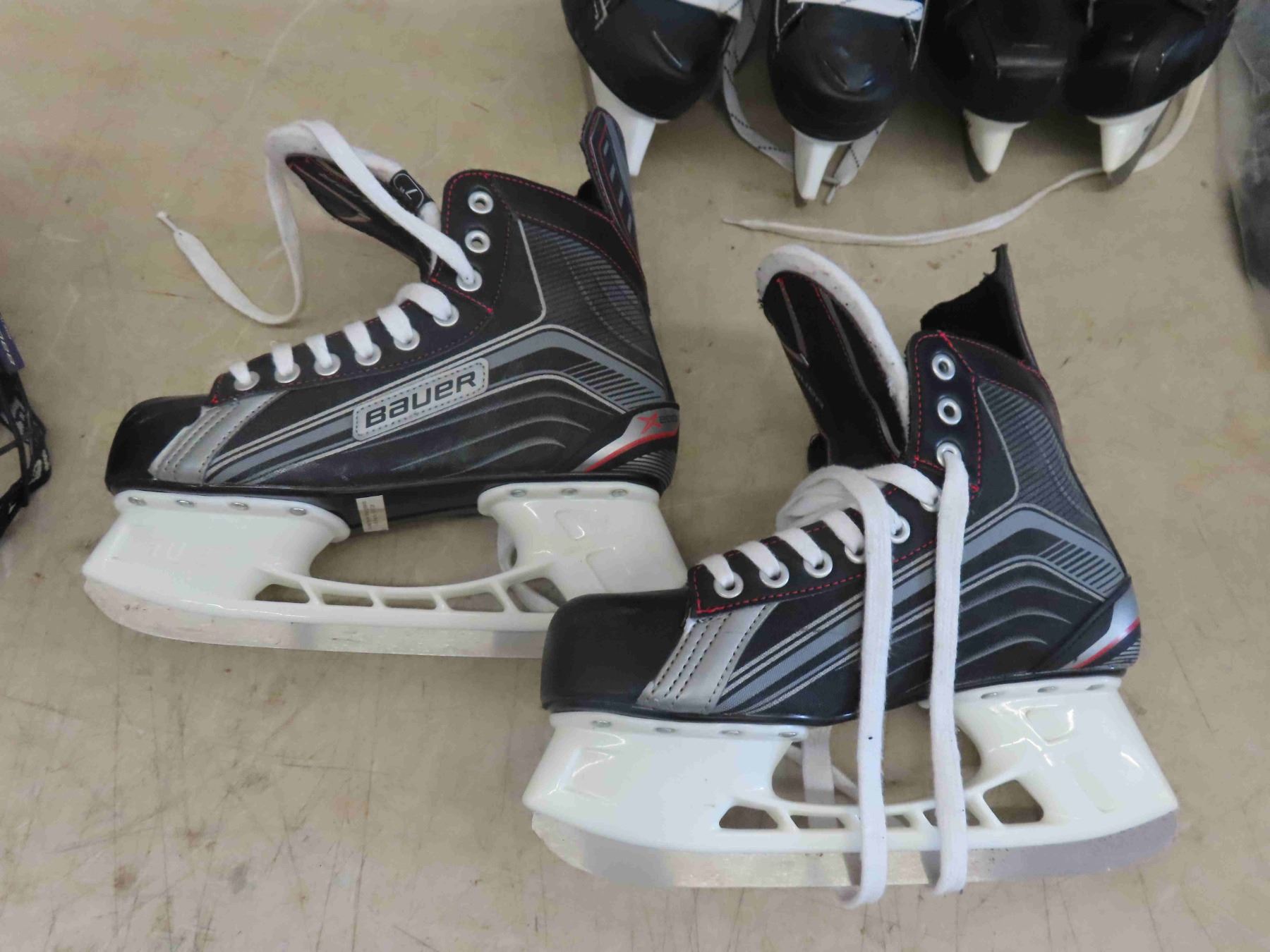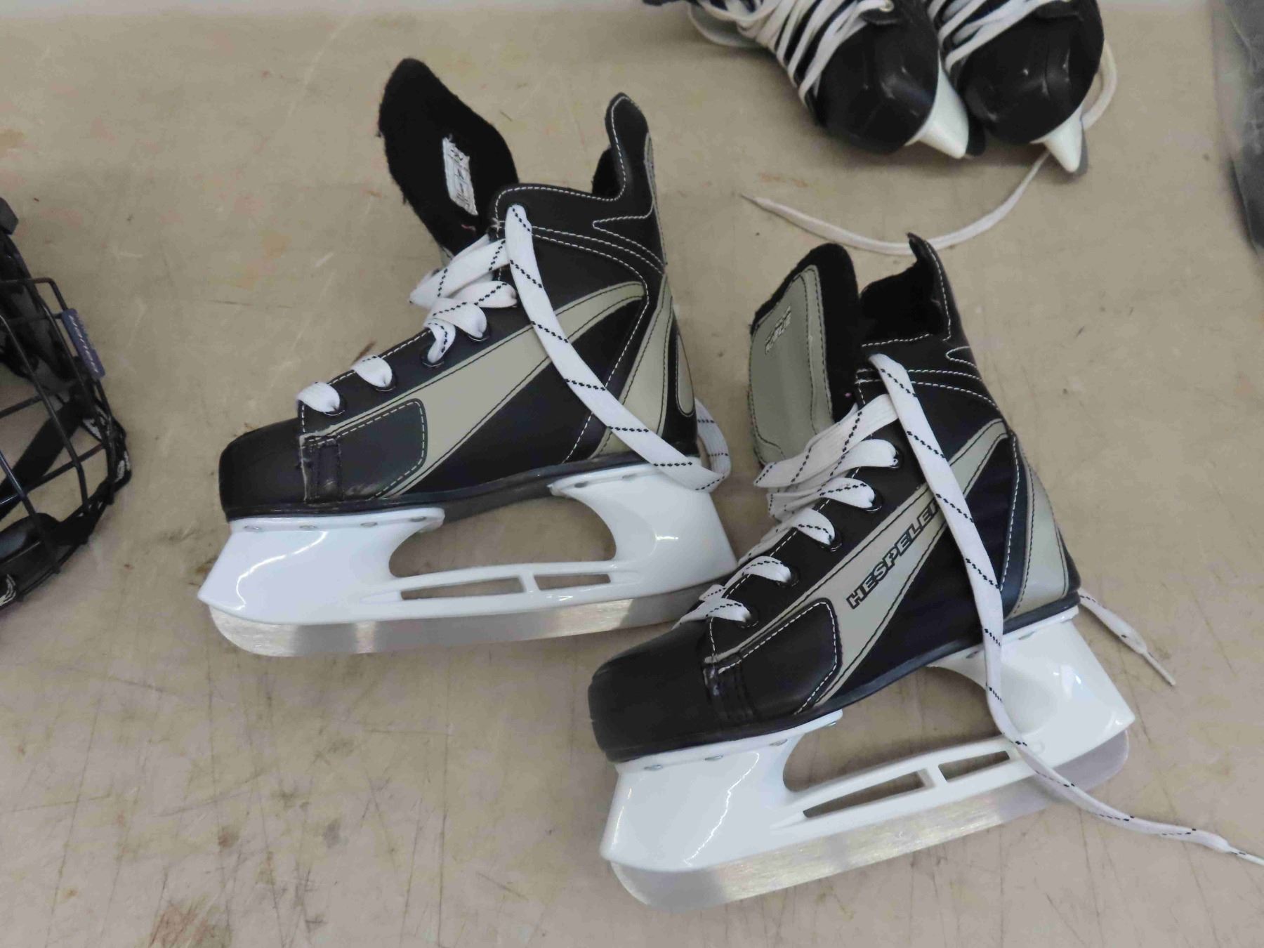 3 Pairs of Skates Size 4 , 5 , 8.5 , 2 Hockey Helmets , Sports Bag