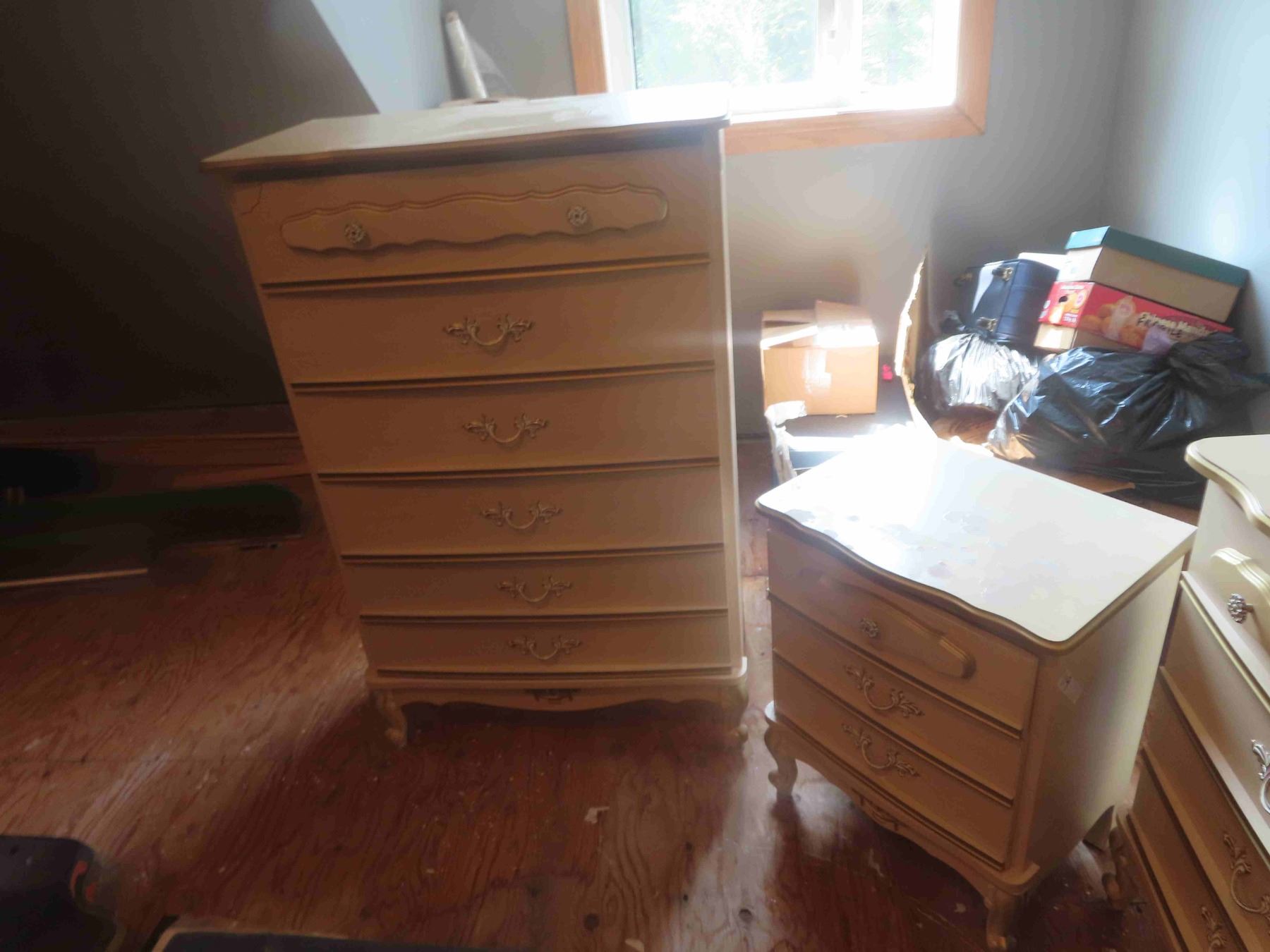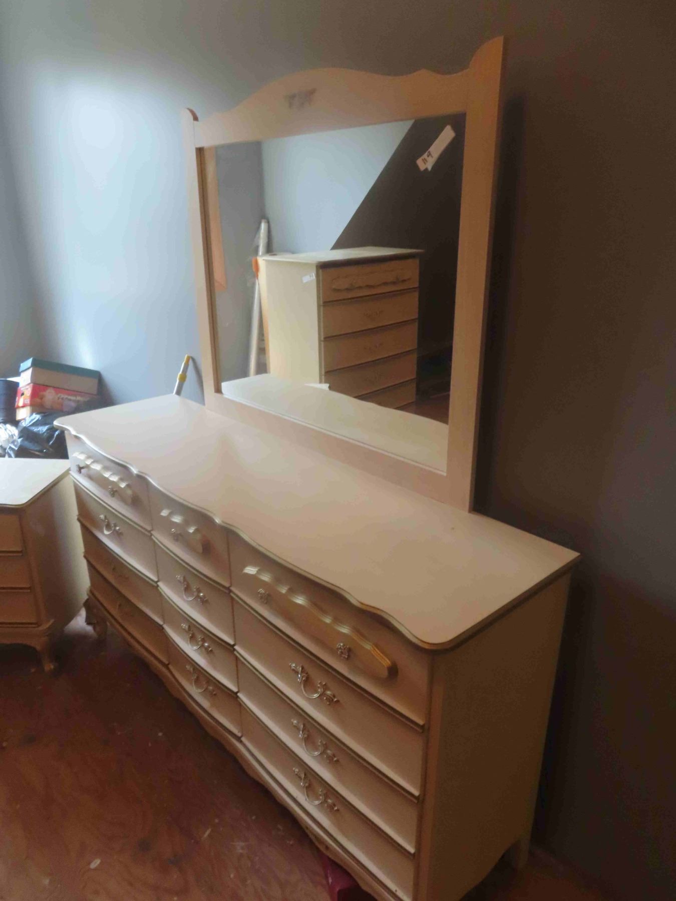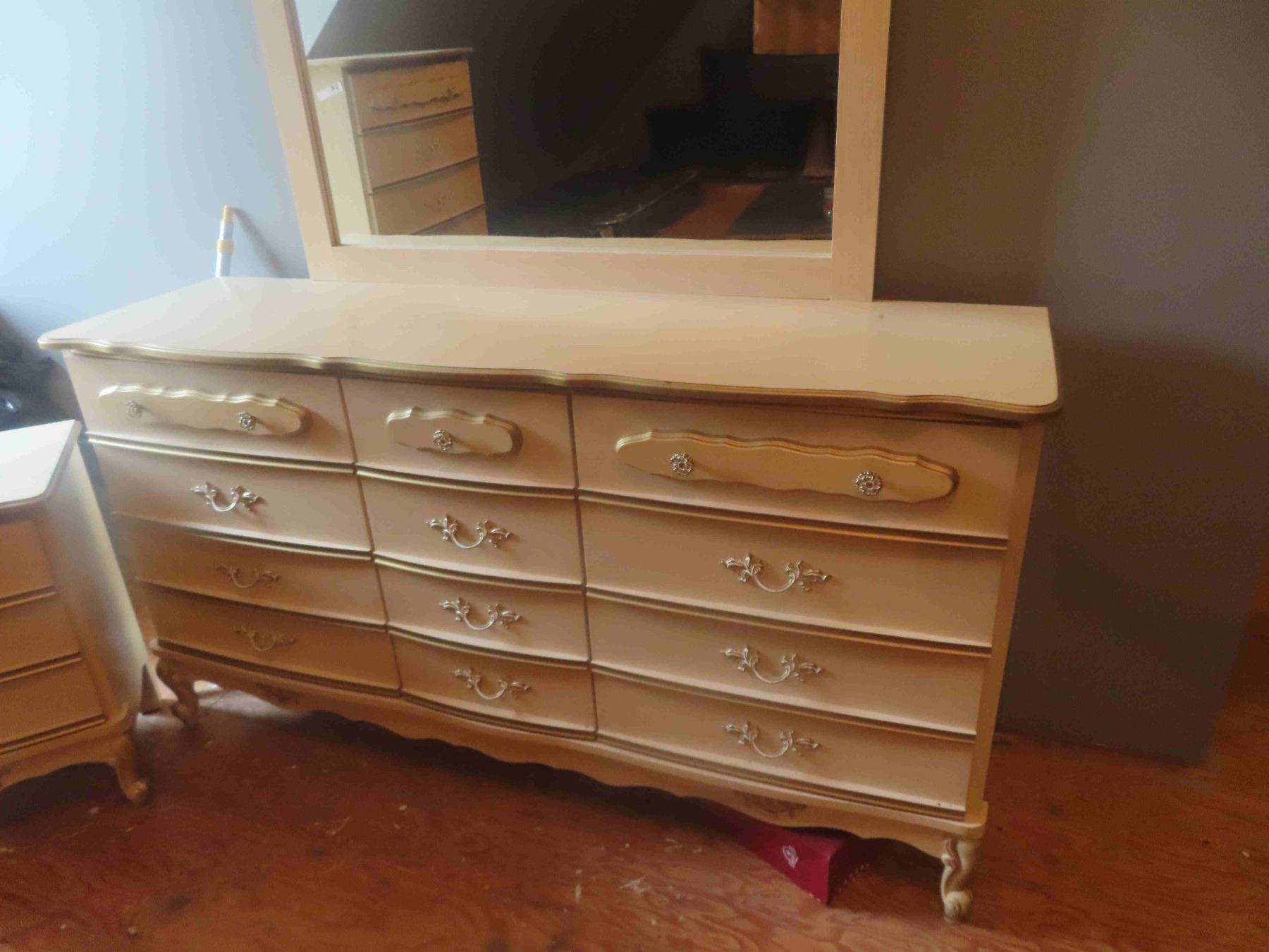 3 Piece Bedroom Suite ; Dresser 46'' x 29 1/2'' x 17'' , Dresser 32'' x 60'' x 16 1/2'' , Mirror 33 '' x 40 1/2'' , Night Table 24'' x 14'' x 19 1/2'' - Has Some Wear