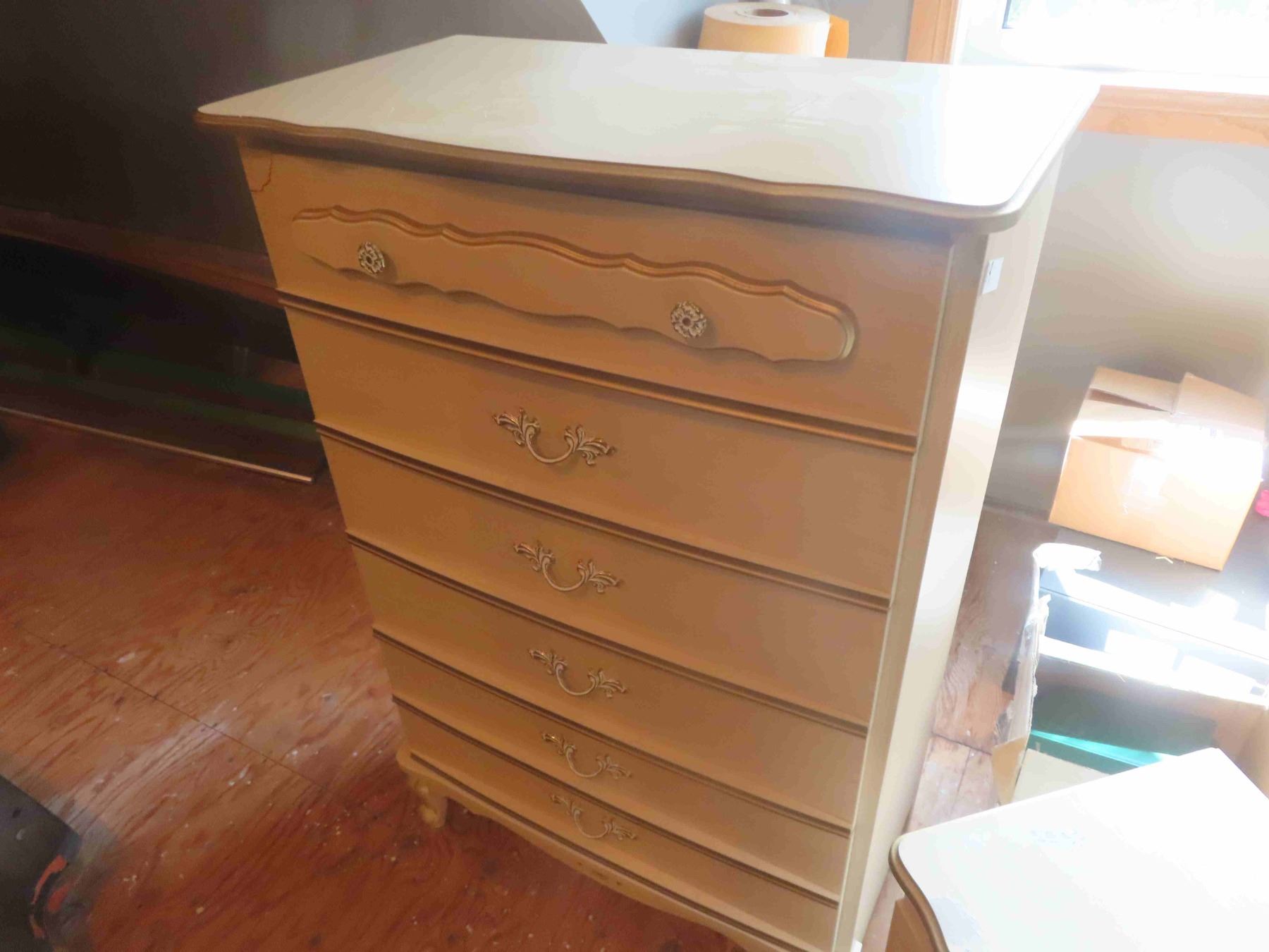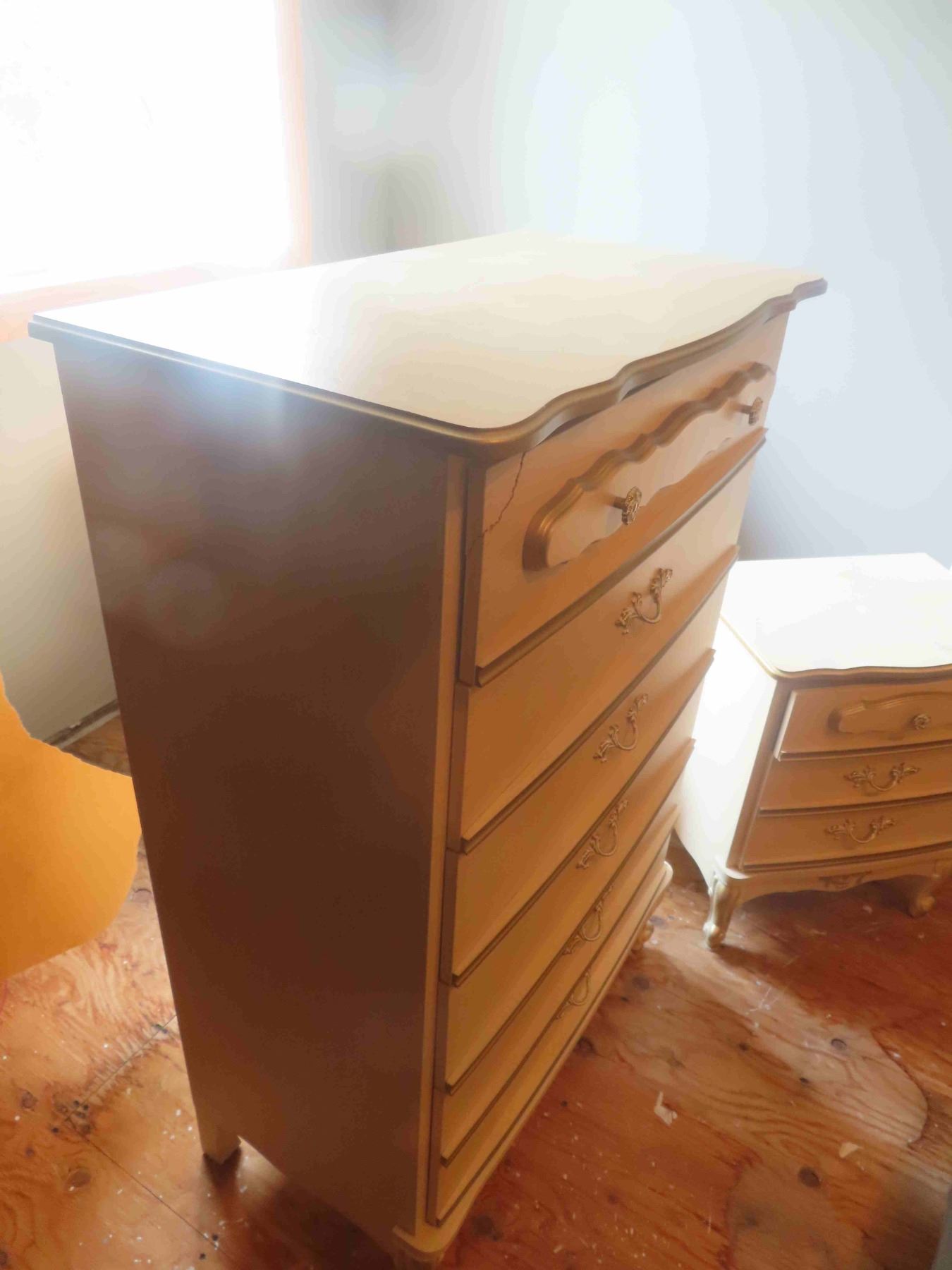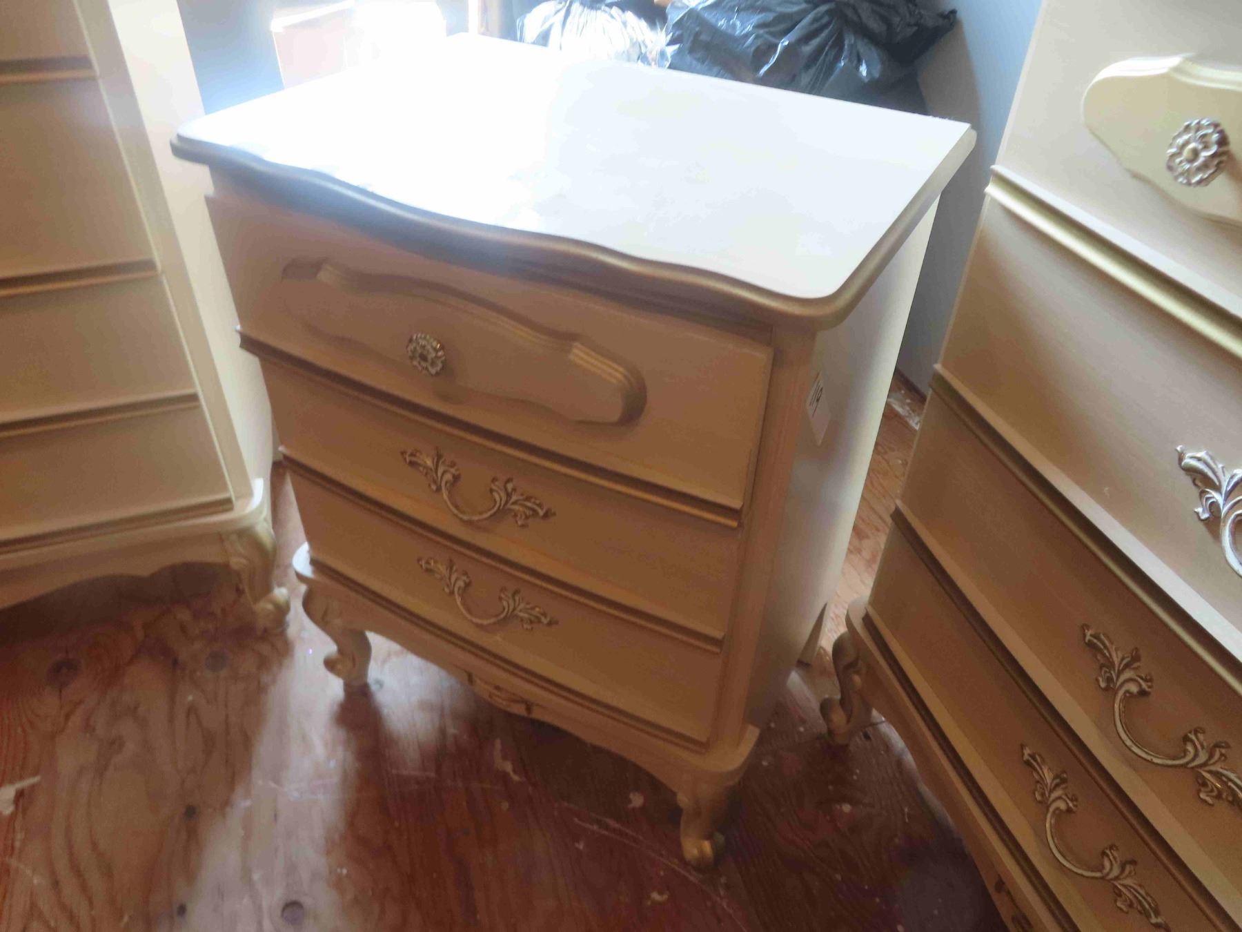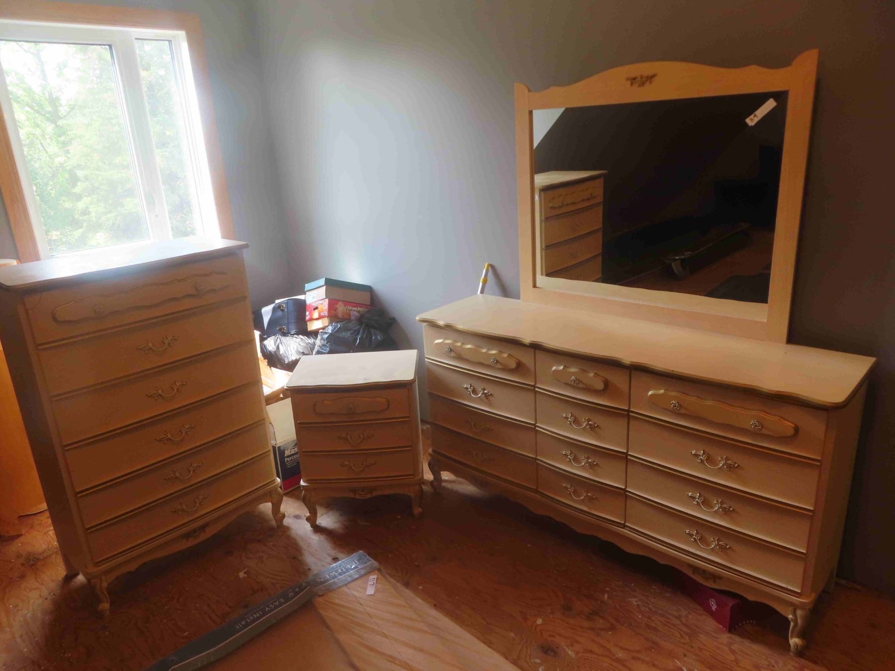 3 Piece Bedroom Suite ; Dresser 46'' x 29 1/2'' x 17'' , Dresser 32'' x 60'' x 16 1/2'' , Mirror 33 '' x 40 1/2'' , Night Table 24'' x 14'' x 19 1/2'' - Has Some Wear