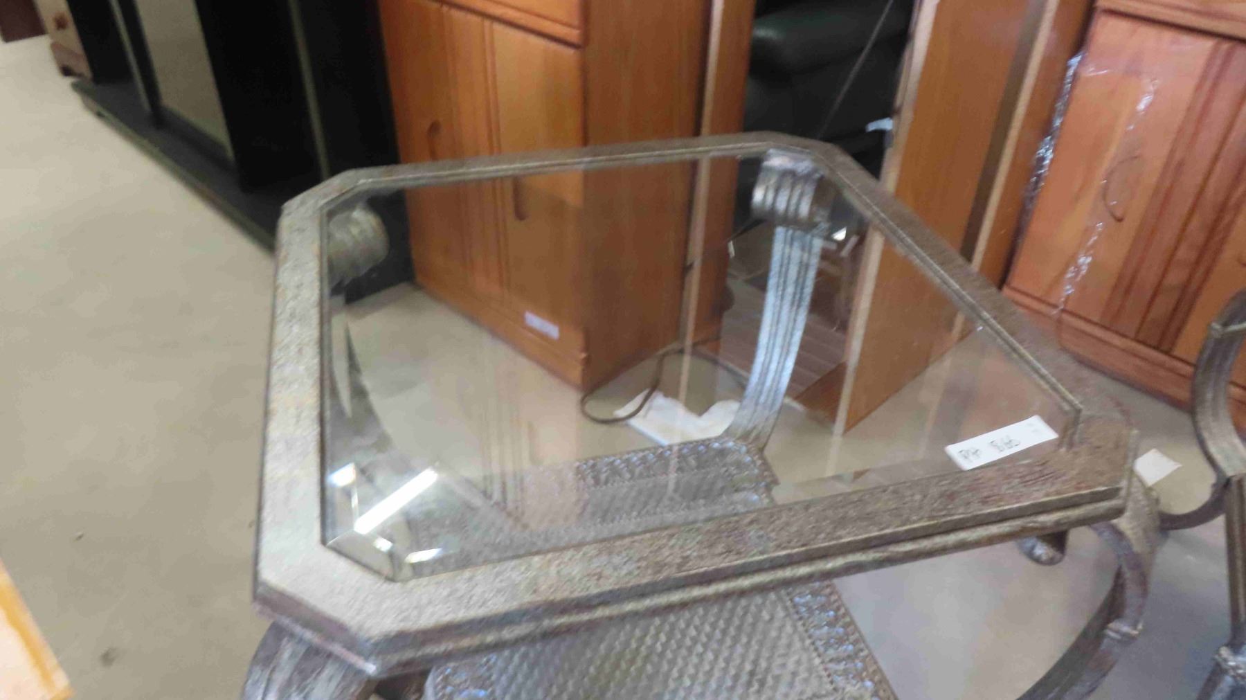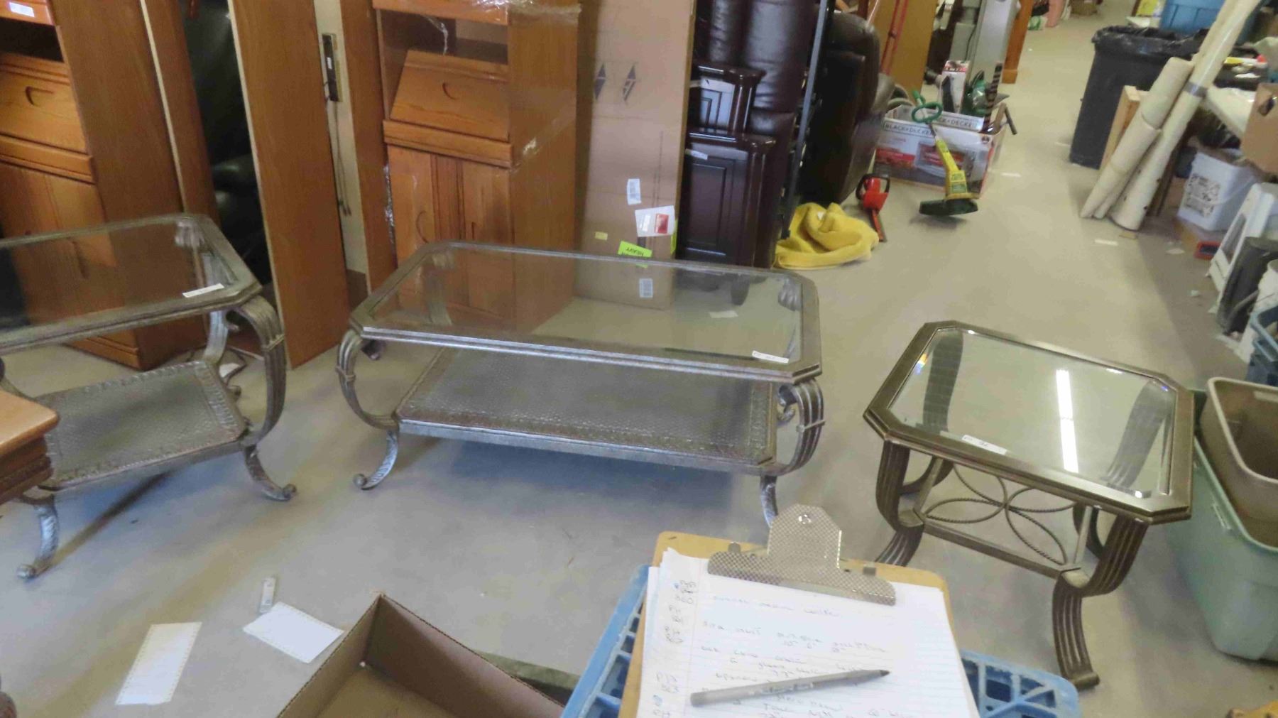 3 Piece Wrought Iron and Glass Top Table Set : Coffee Table 20'' x 27'' x 47'' , 2 End Tables 21'' x 26'' x 26''