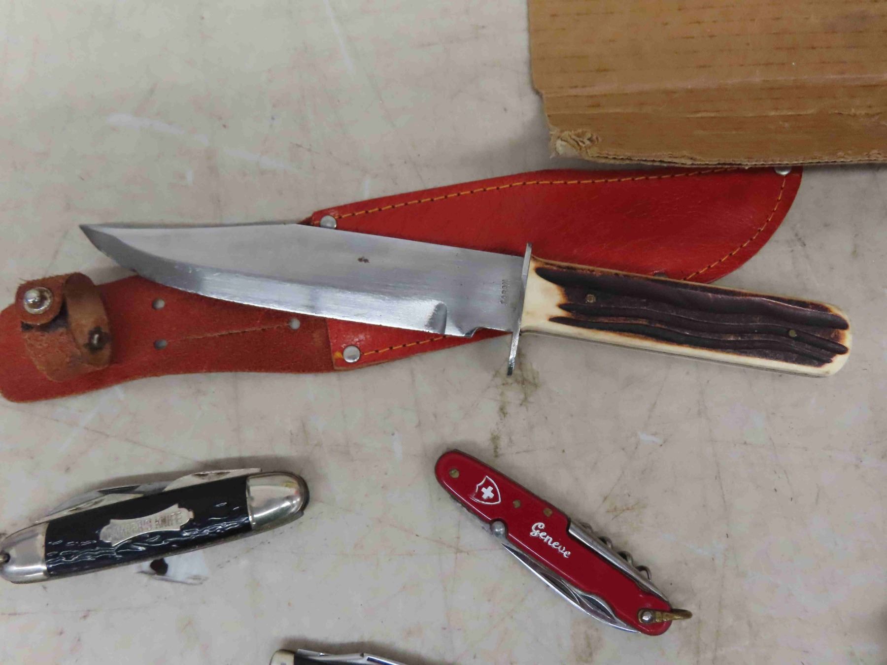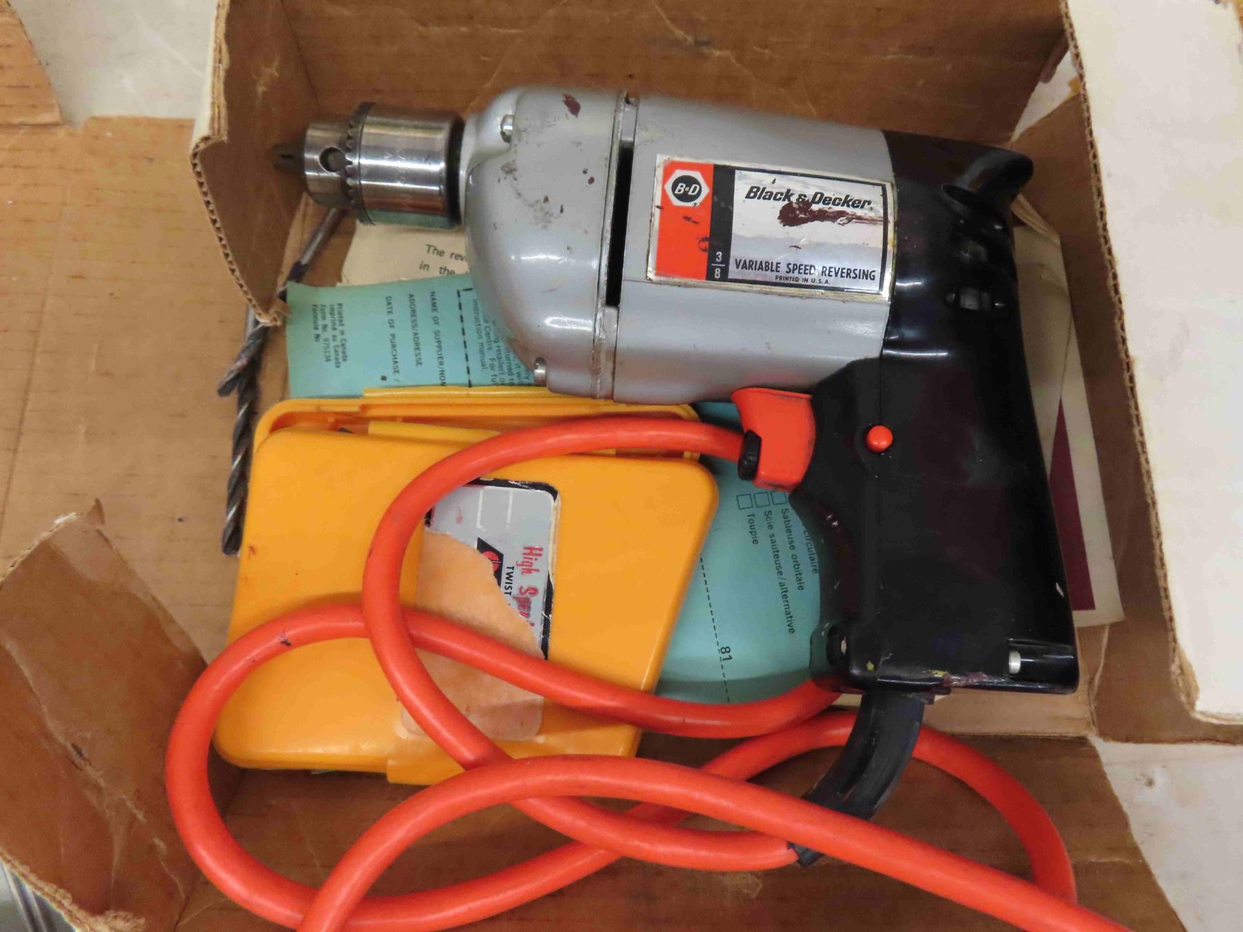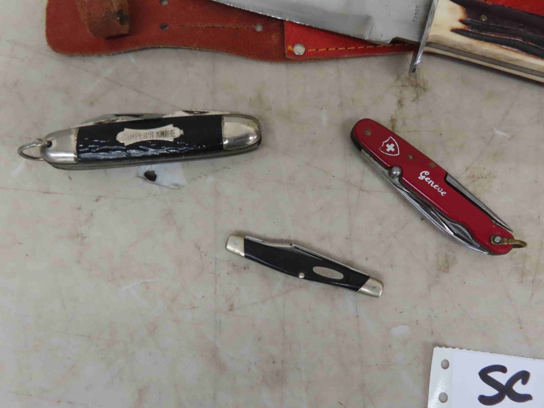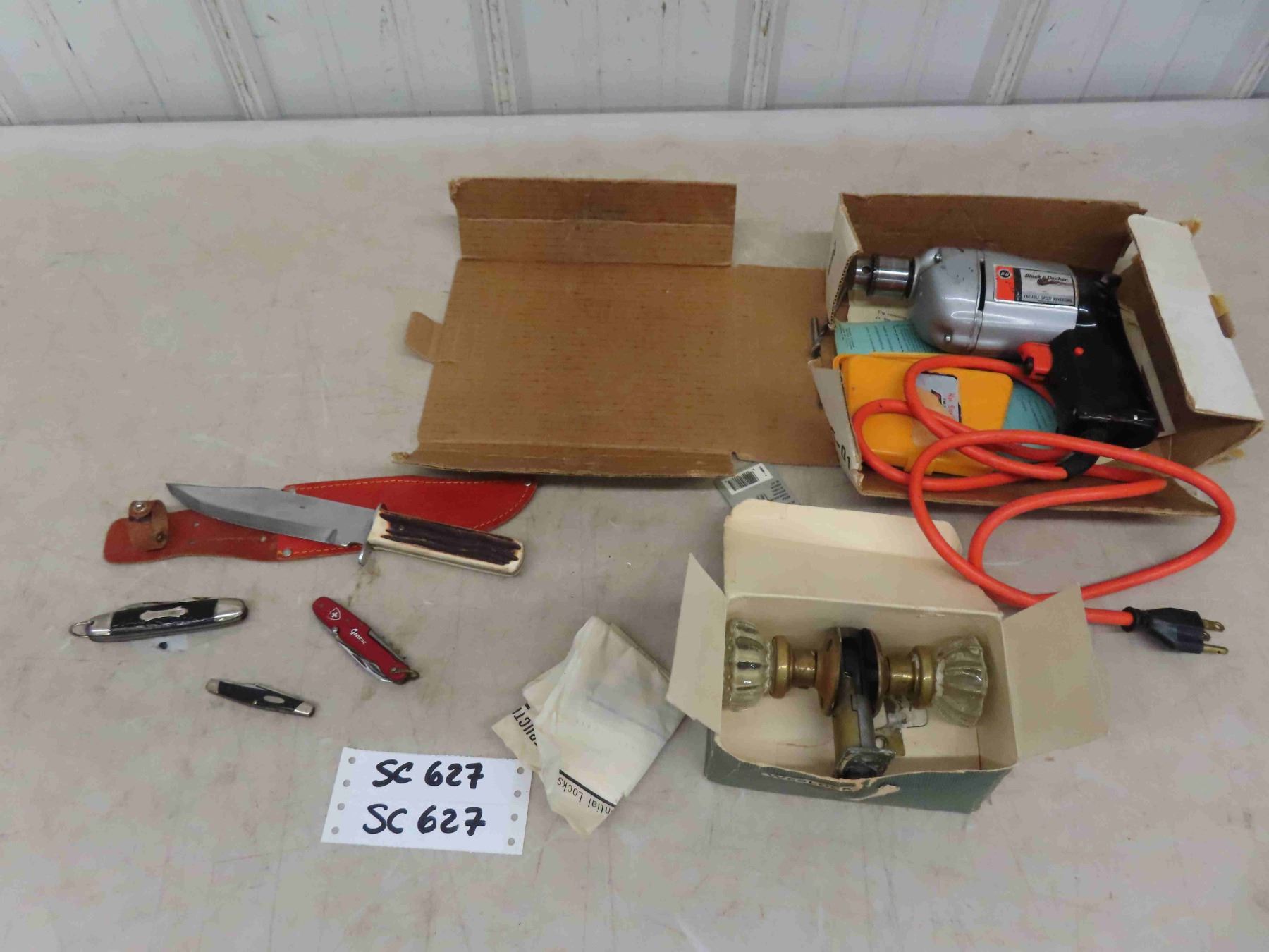 3 Pocket Knives, Hunting Knife, B+D 3/8" Drill, Drill Bit Index, Glass Handled Door Knob
