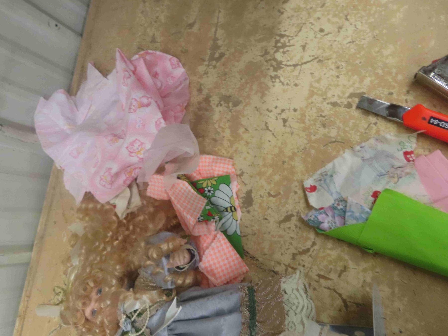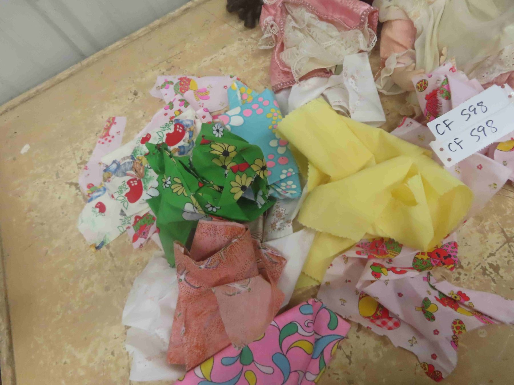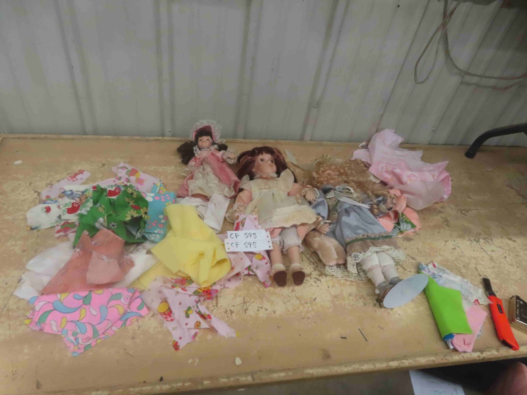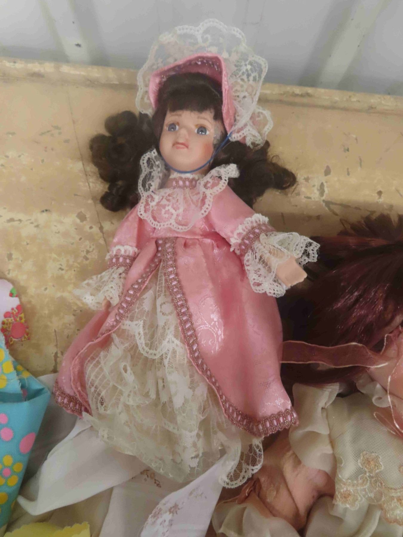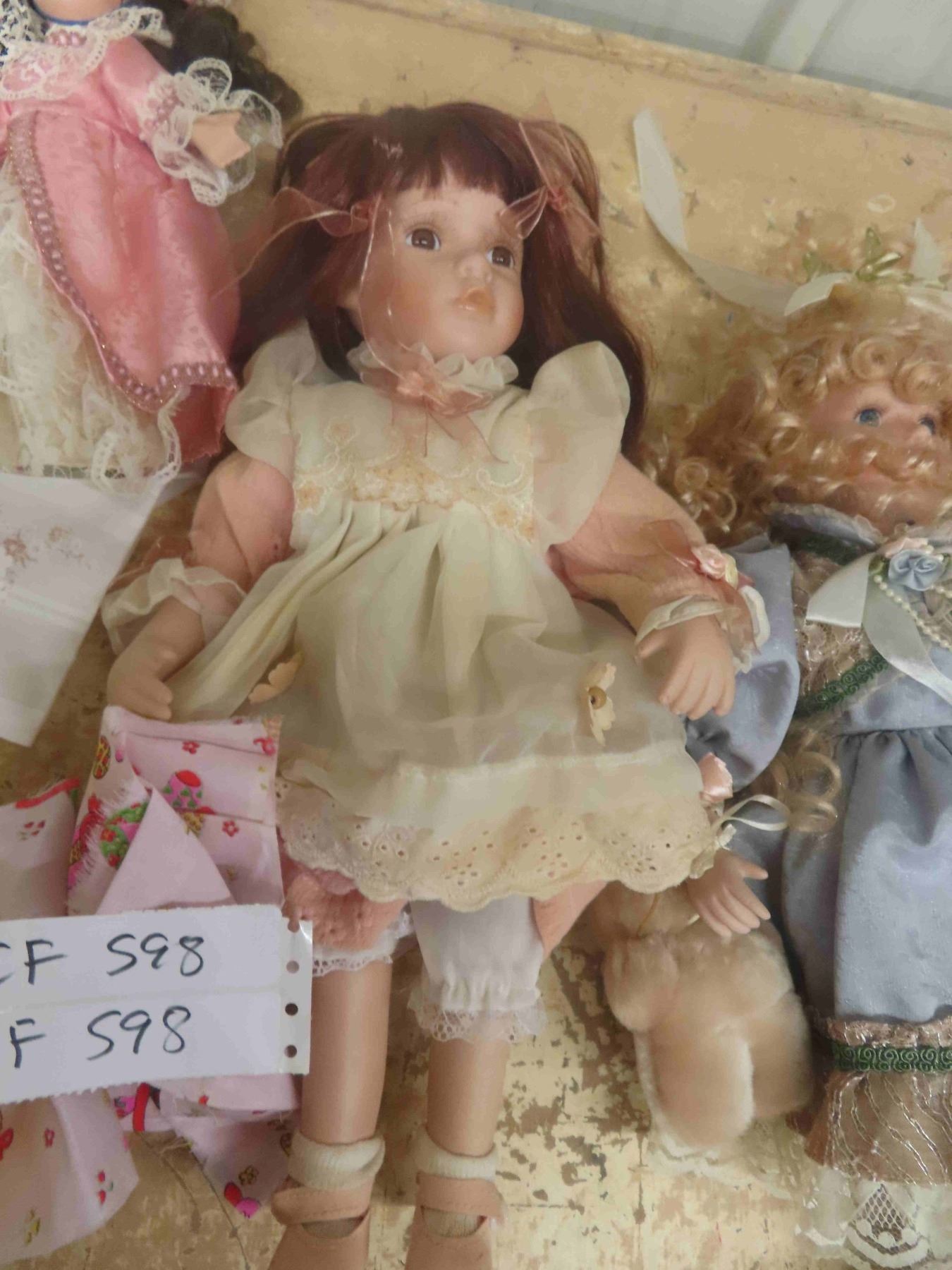 3 Porcelain Dolls, Doll Cloths, Fabric