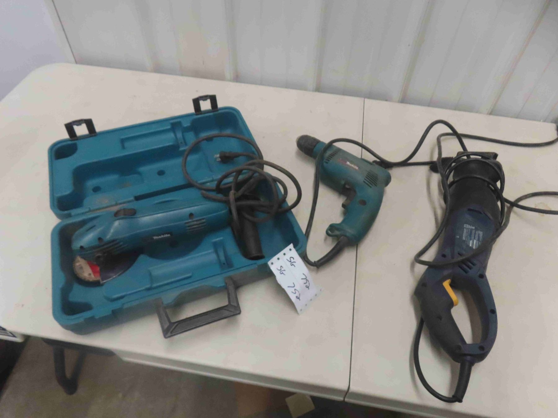 3 Power Tools : Makita Angle Grinder, Makita 4.3 Amp Drill, Mastercraft 6 Amp Reciprocating Saw