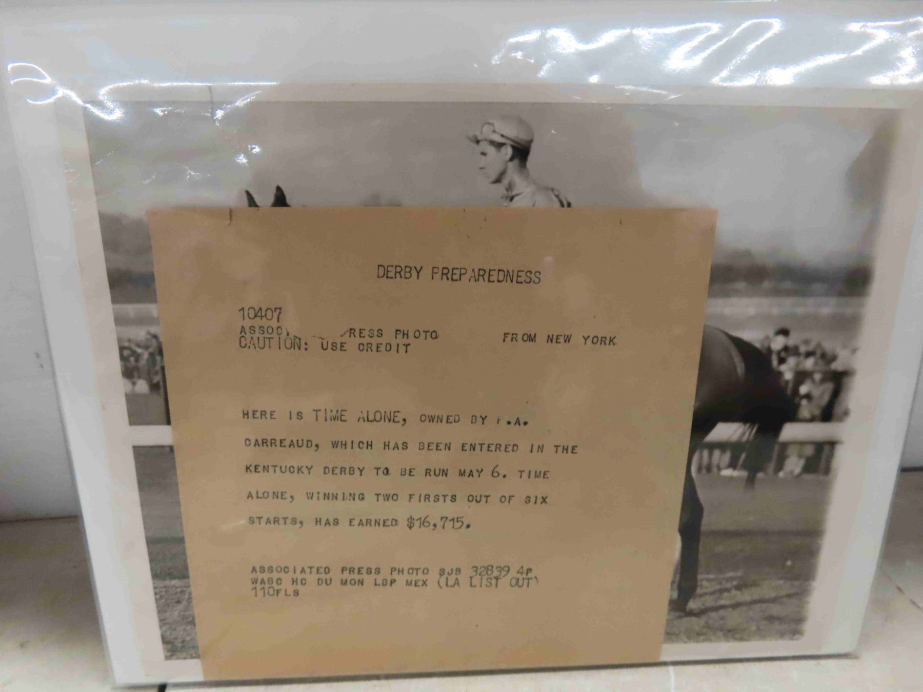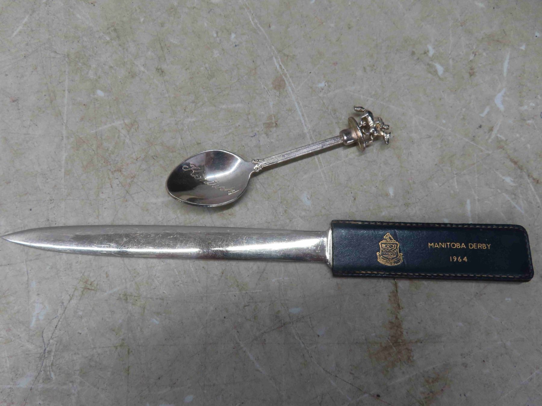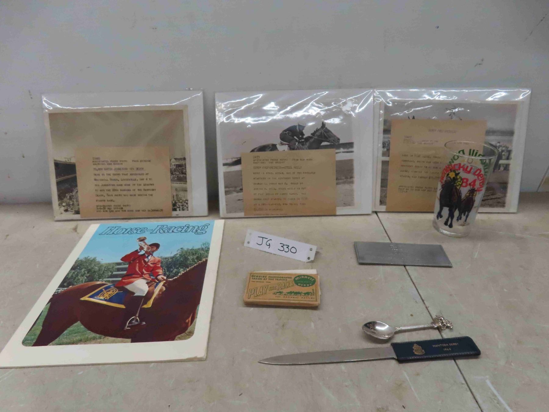 3 Press Photos of the Horse Running in the Kentucky Derbu at Churchill Downs May 6, 1930's. Booklet of Horse Racing, Manitoba Derby Letter Opener, Metal Plaque of 1974 Champion Filly Bobby Bee, Kentucky Derby Glass 1984, Kentucky Derby Spoon