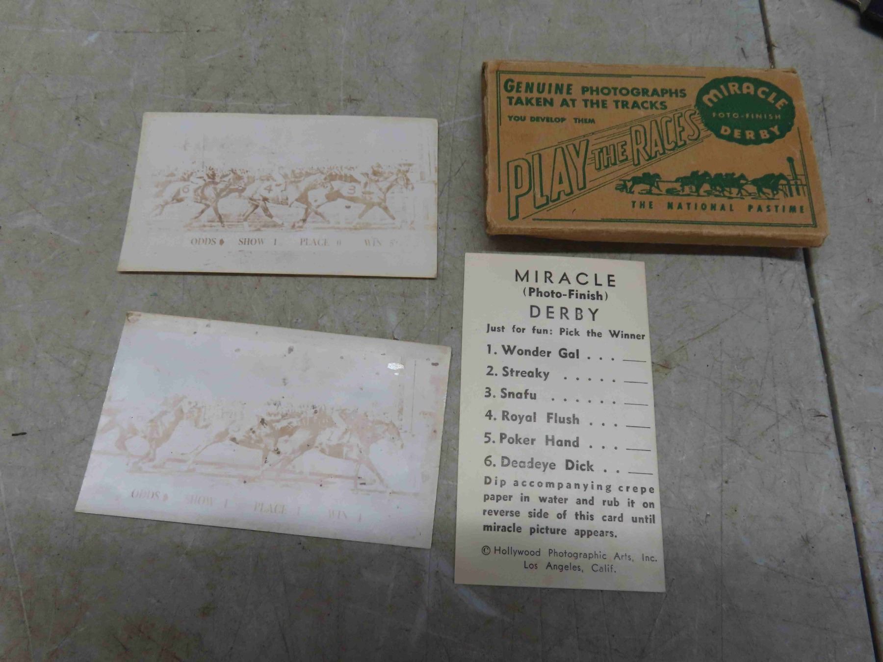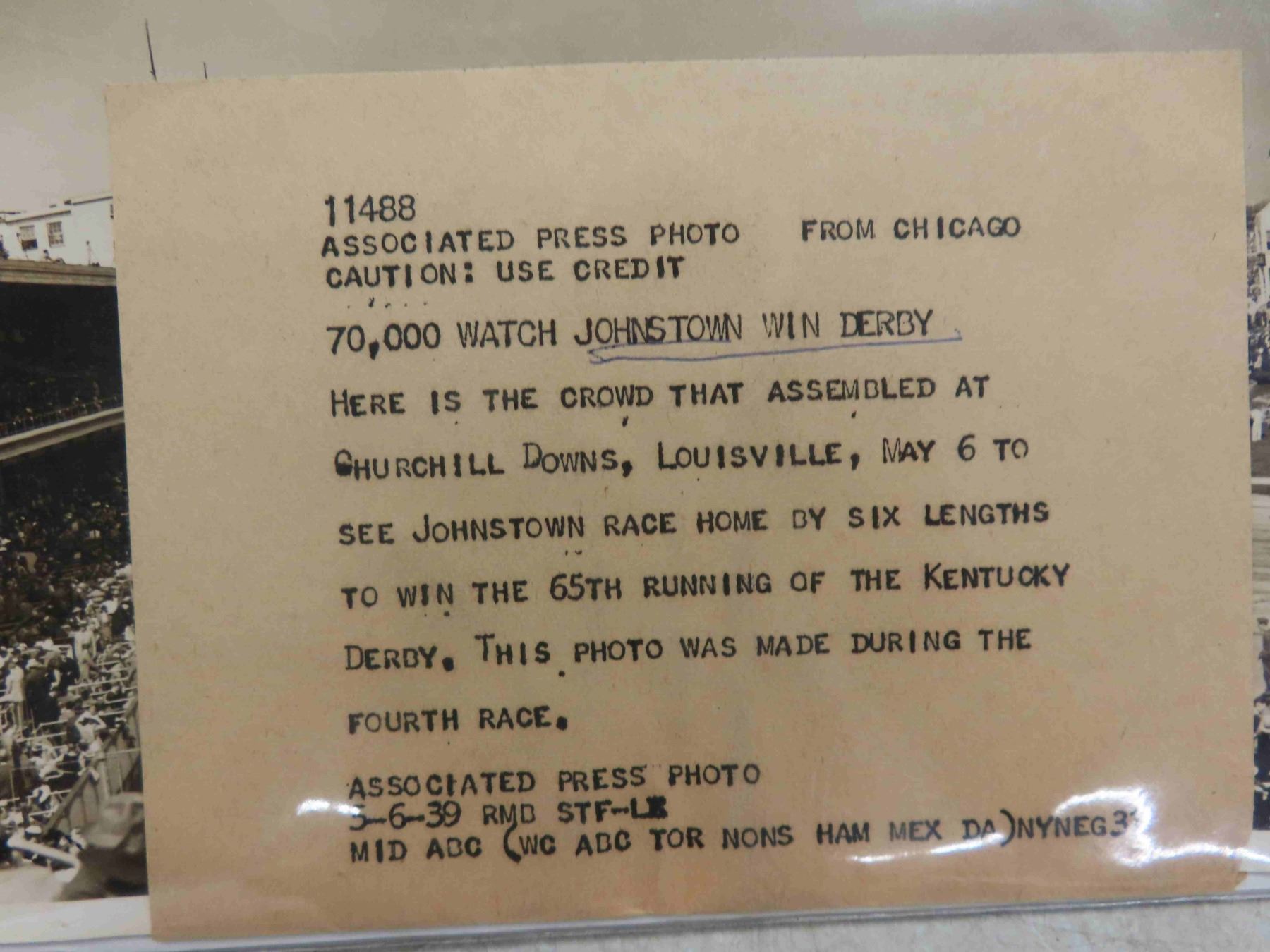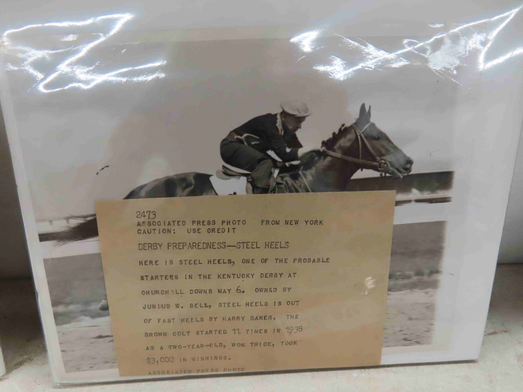 3 Press Photos of the Horse Running in the Kentucky Derbu at Churchill Downs May 6, 1930's. Booklet of Horse Racing, Manitoba Derby Letter Opener, Metal Plaque of 1974 Champion Filly Bobby Bee, Kentucky Derby Glass 1984, Kentucky Derby Spoon
