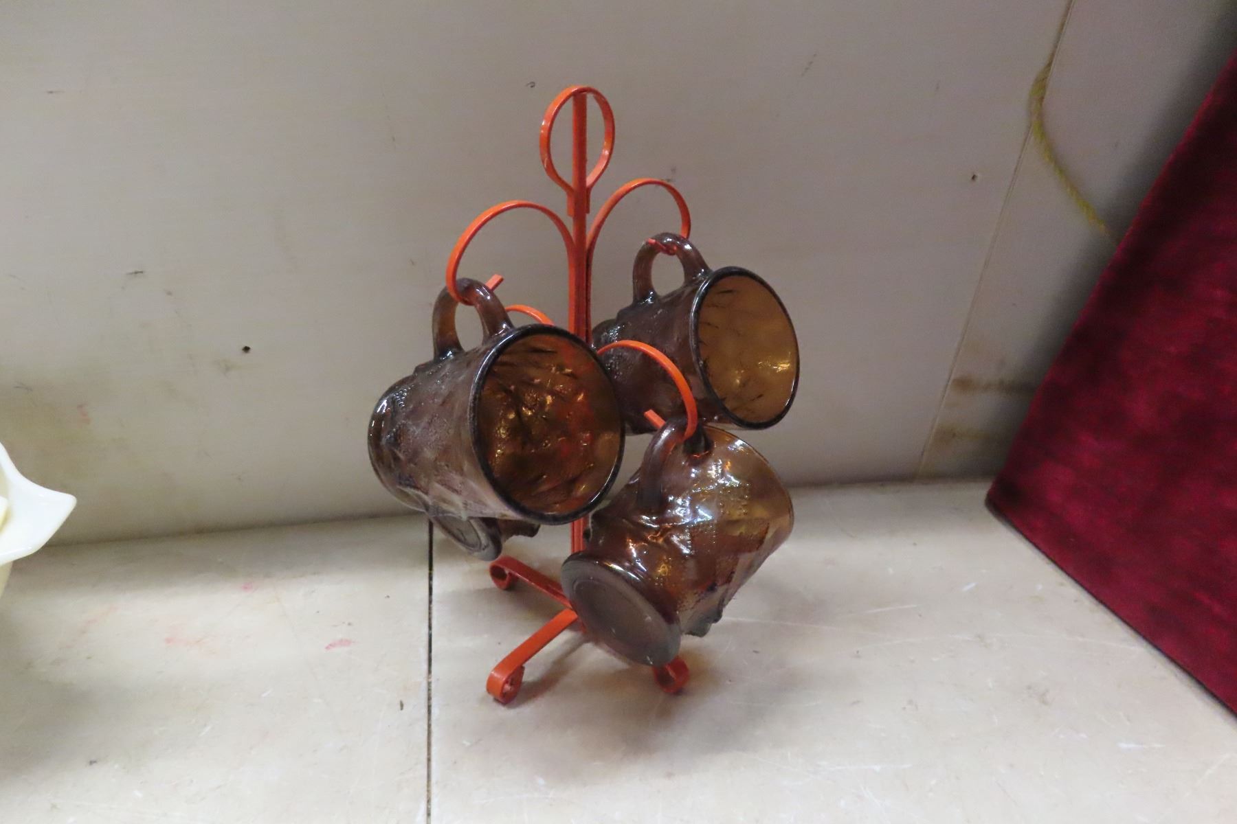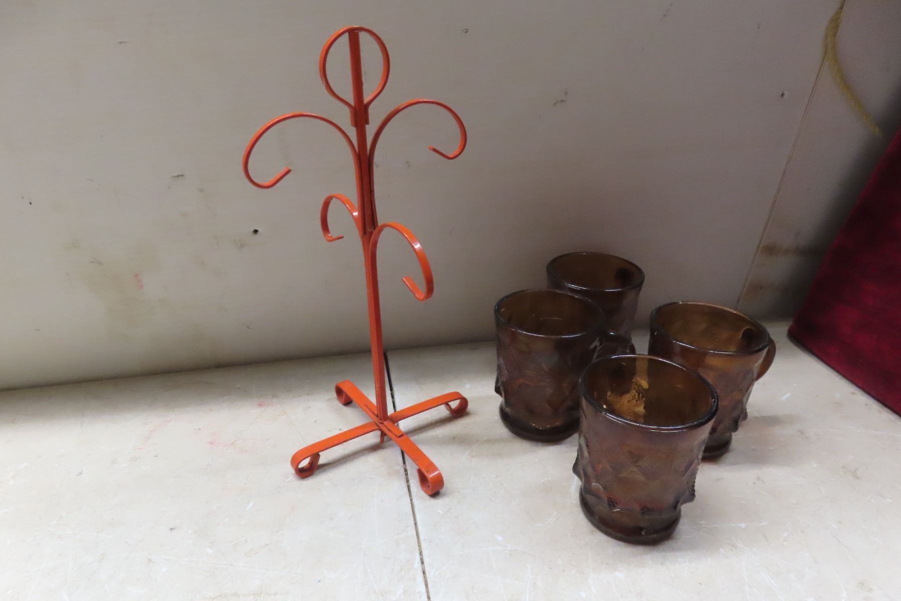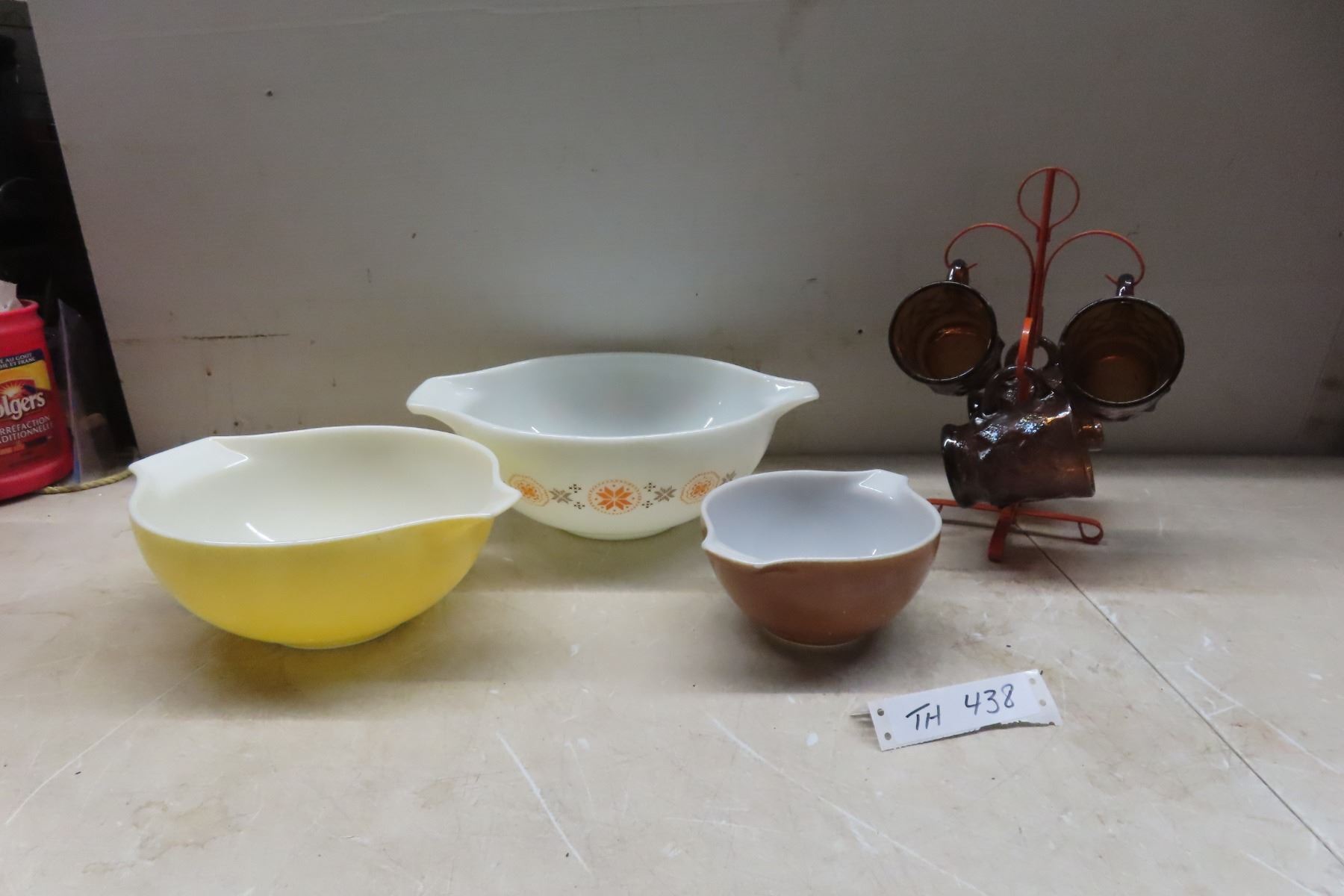 3 Pyrex Mixing Bowls and 4 Anchor Amber Coffee Mugs with Mug Tree