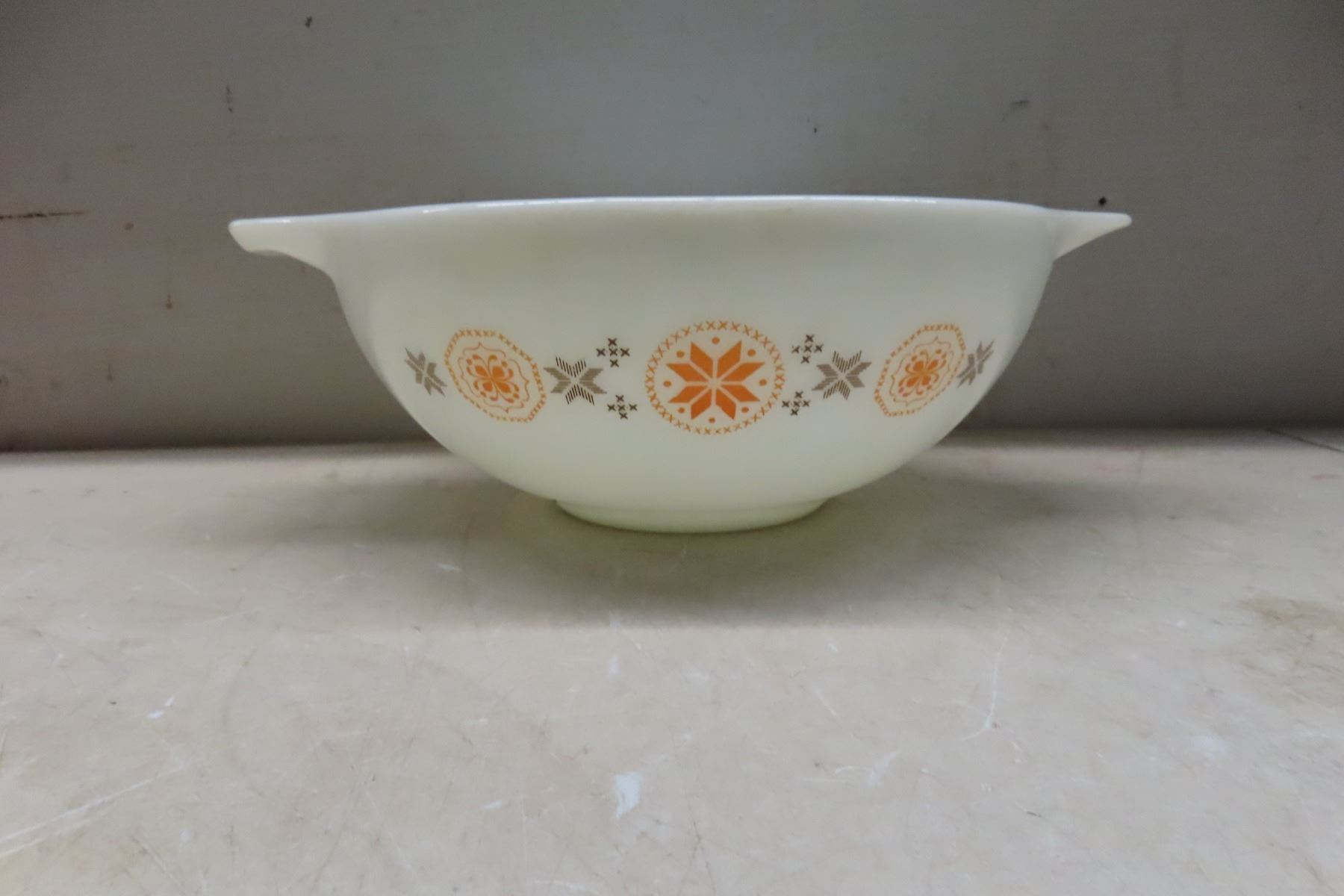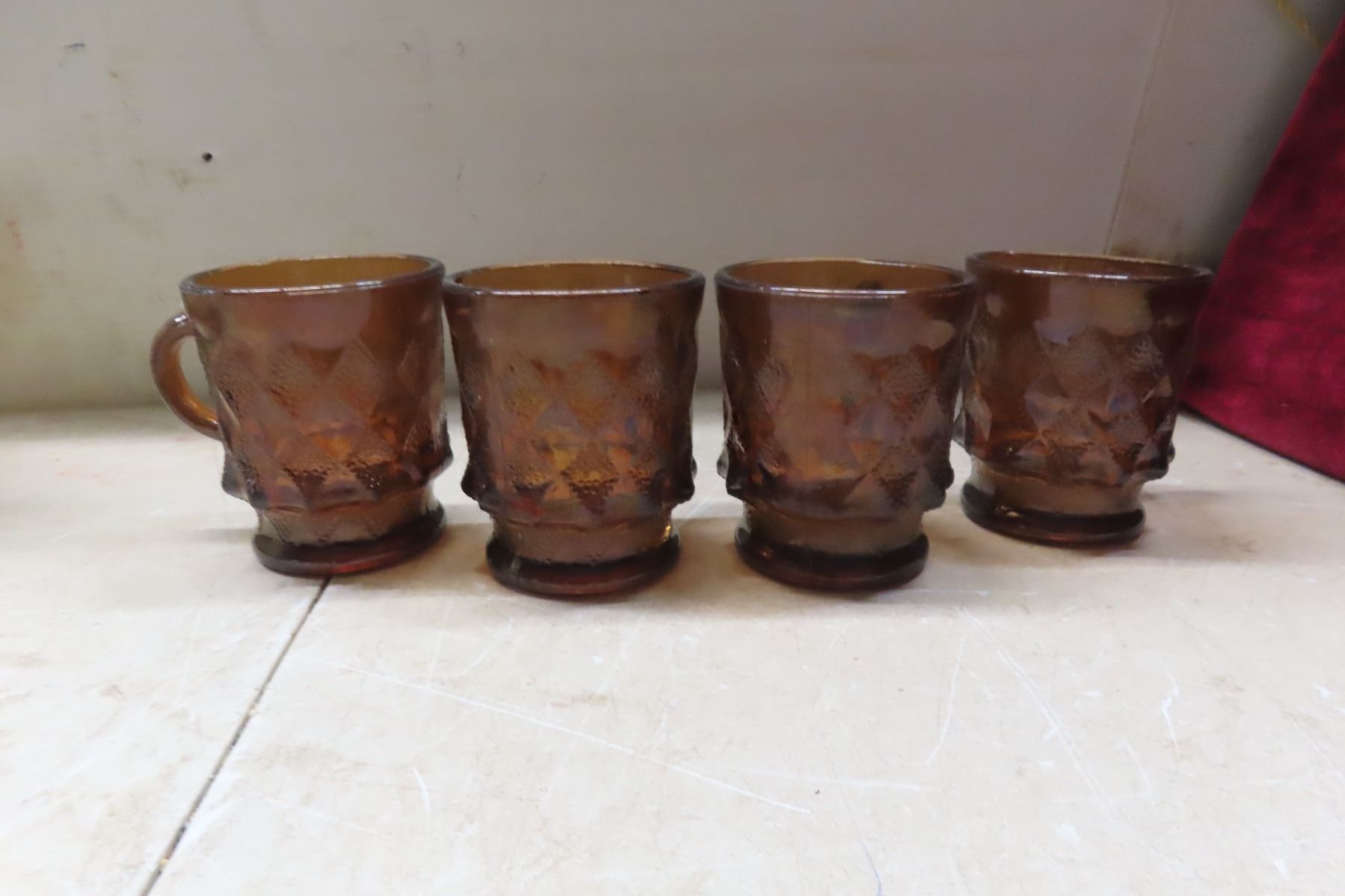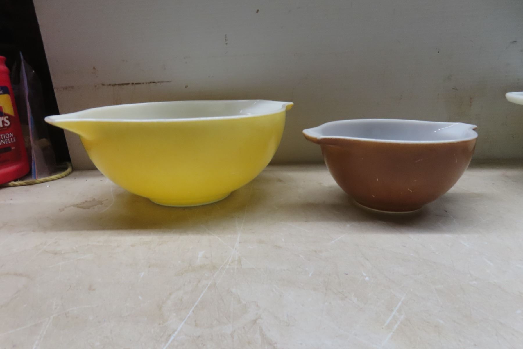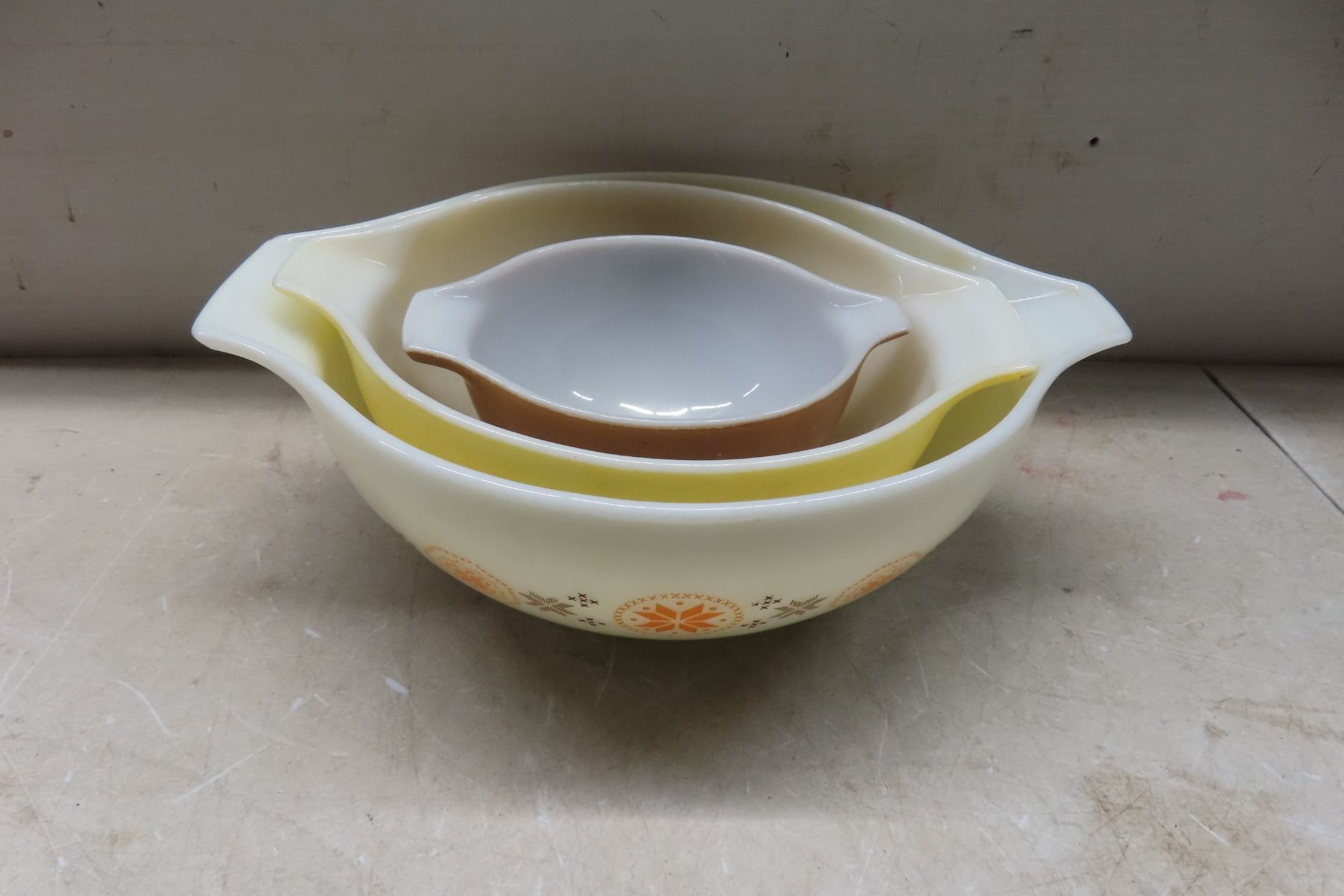 3 Pyrex Mixing Bowls and 4 Anchor Amber Coffee Mugs with Mug Tree
