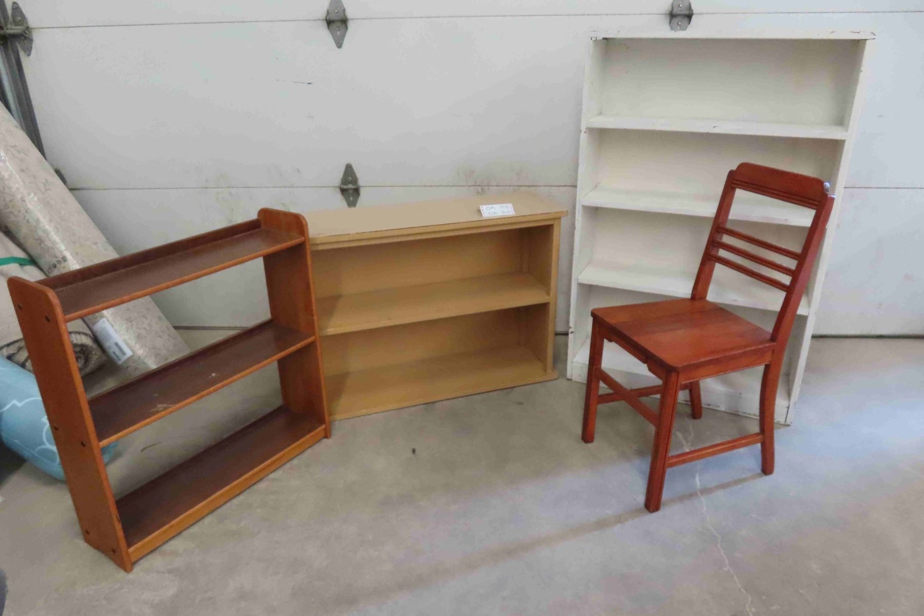 (3) Shelving Units: White Painted 47x30x8, 25x35x11, 28x27x8 + Wood Chair