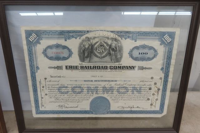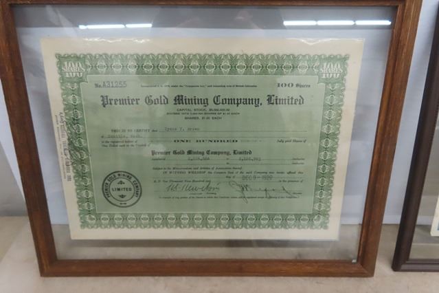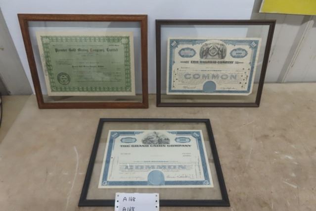 3 Stock Certificates; Premier Gold Mining, Erie Railroad, Grand Union Company - All Framed