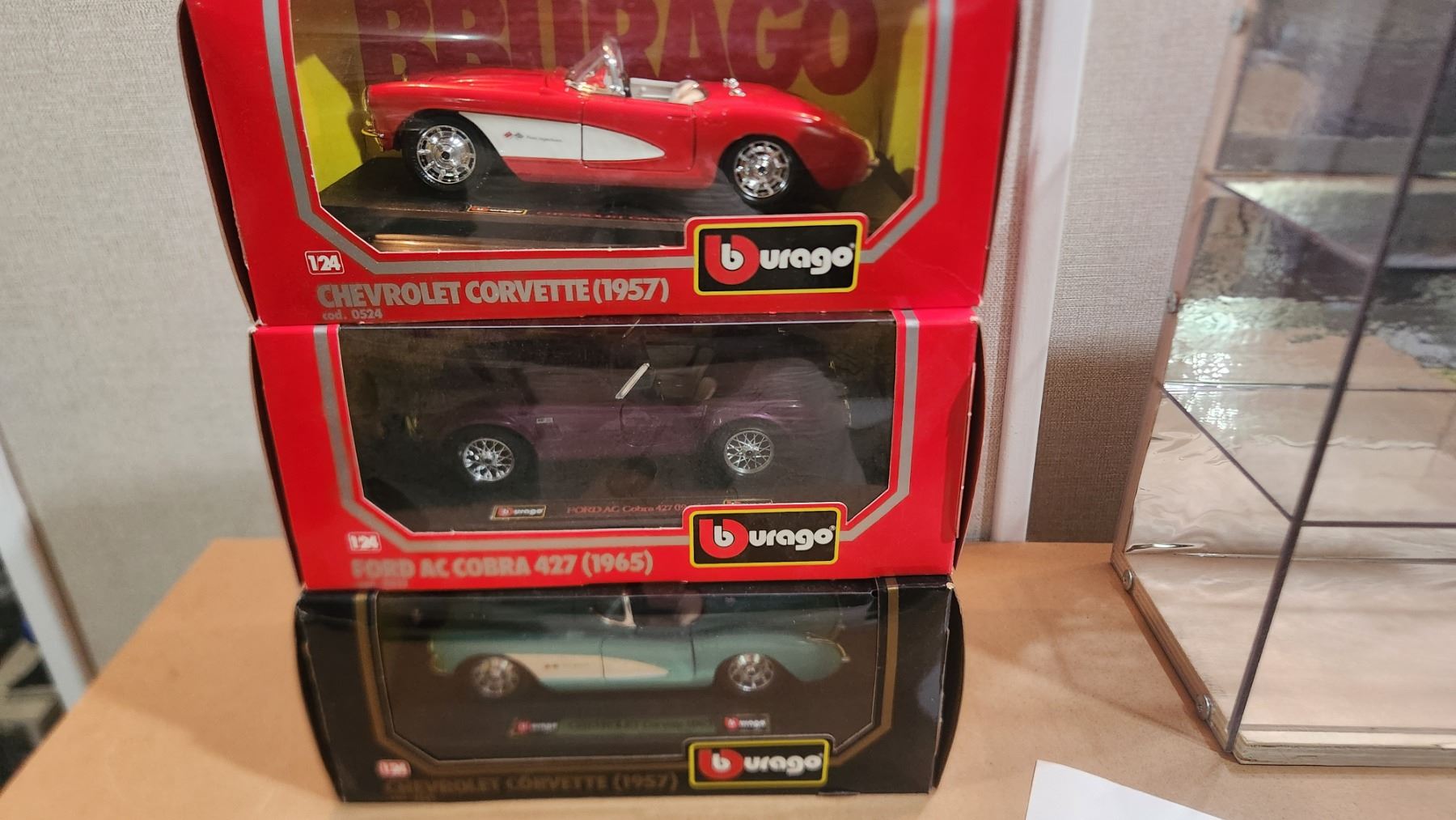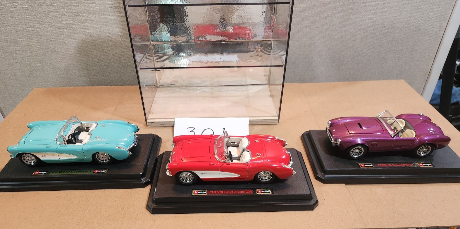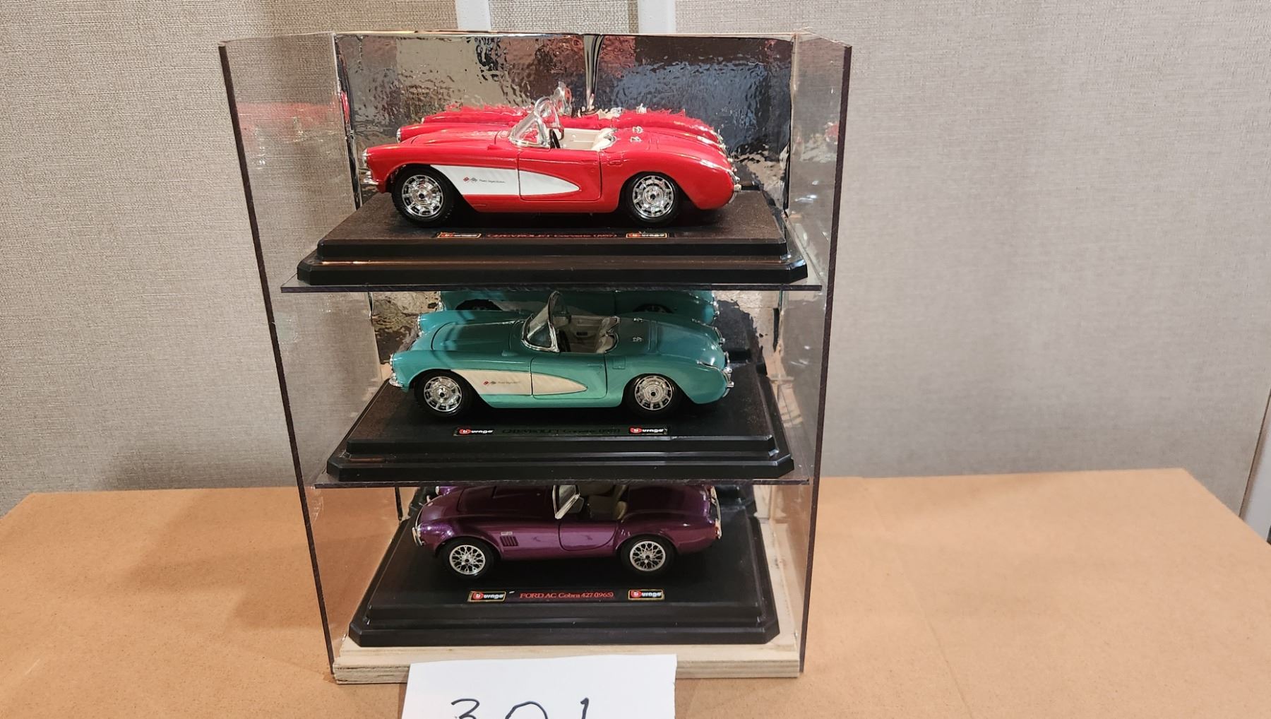 3 TIER CAR DISPLAY 1/24TH, 2 B BURAGO 1957 CORVETTES, 1 1965 FORD AC COBRA