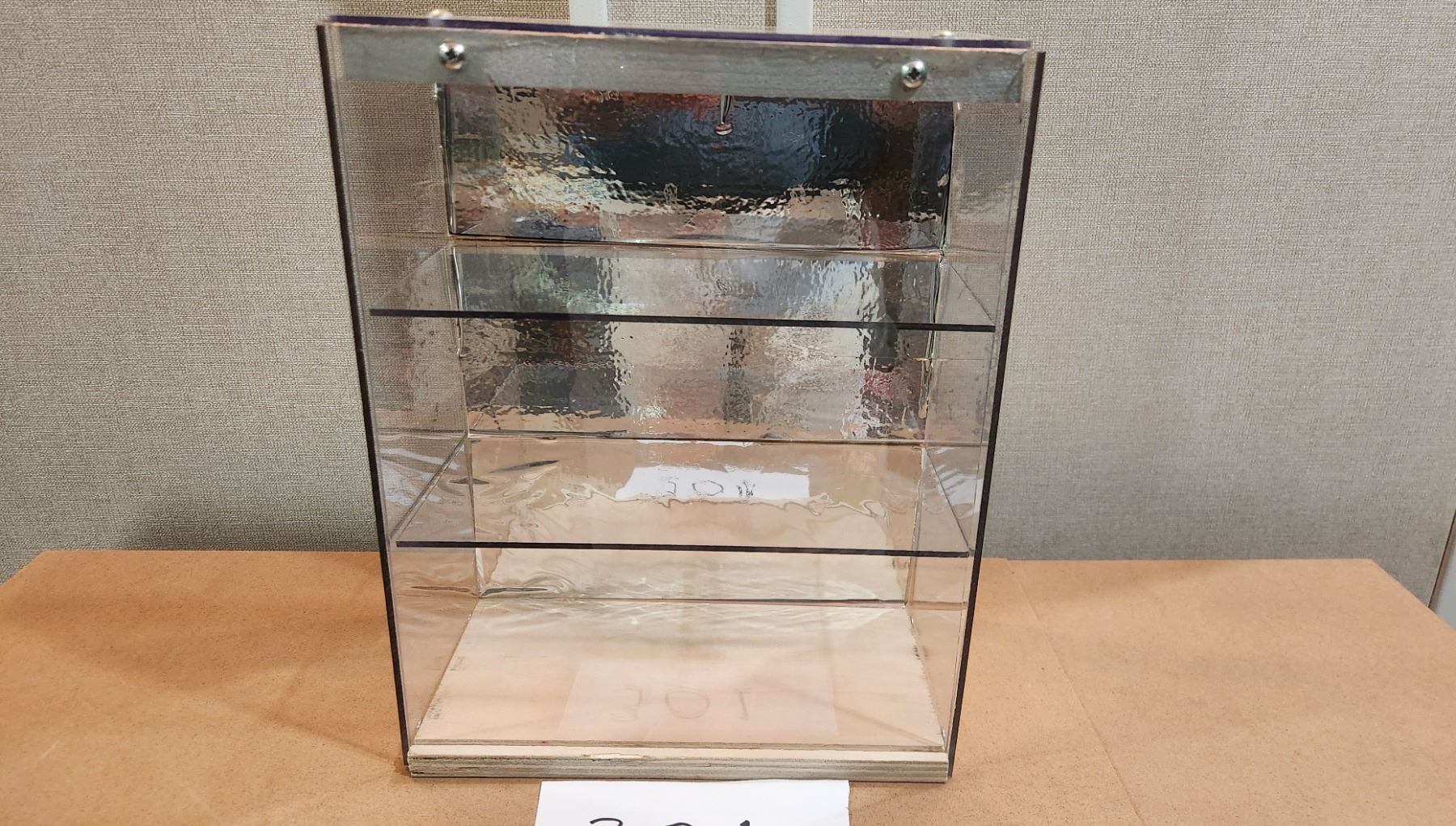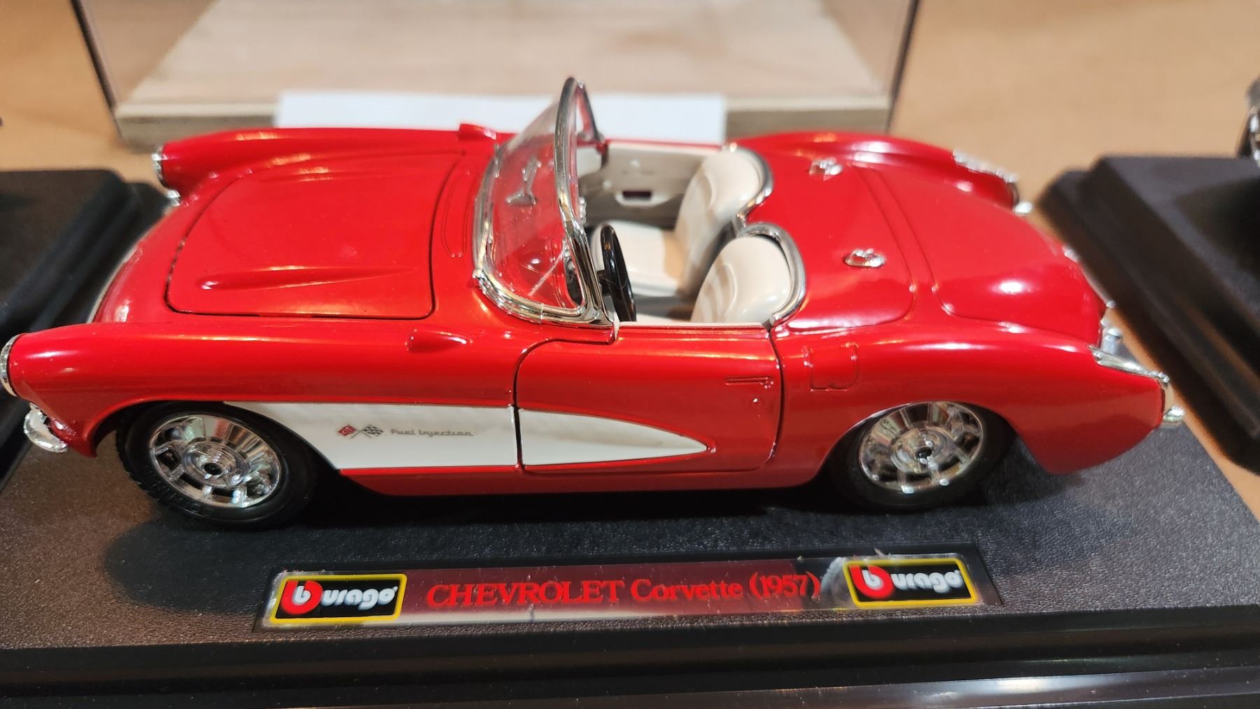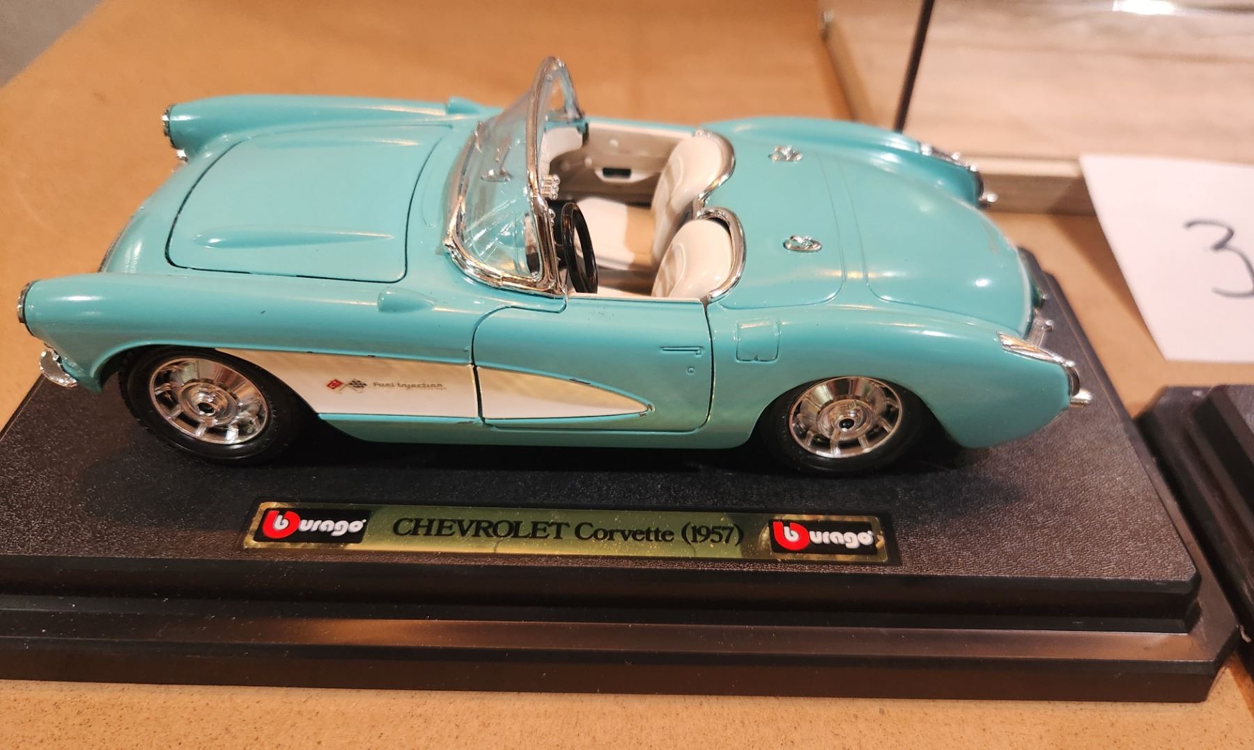 3 TIER CAR DISPLAY 1/24TH, 2 B BURAGO 1957 CORVETTES, 1 1965 FORD AC COBRA