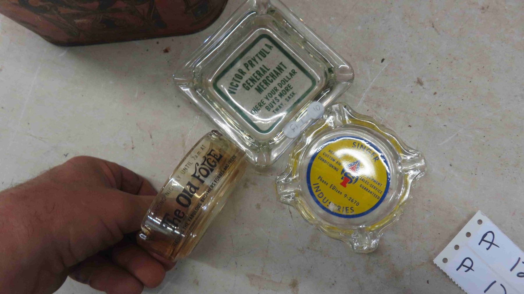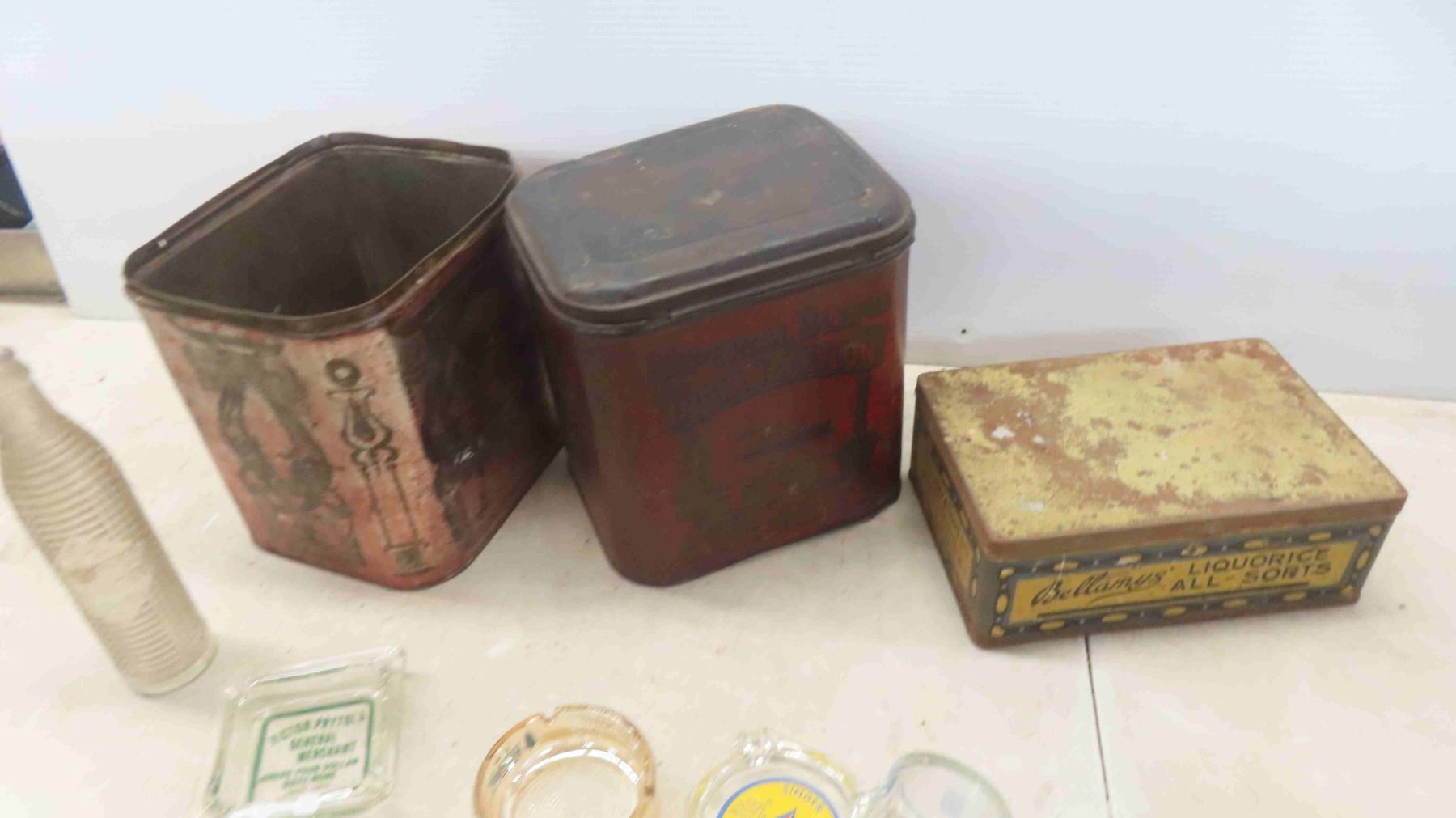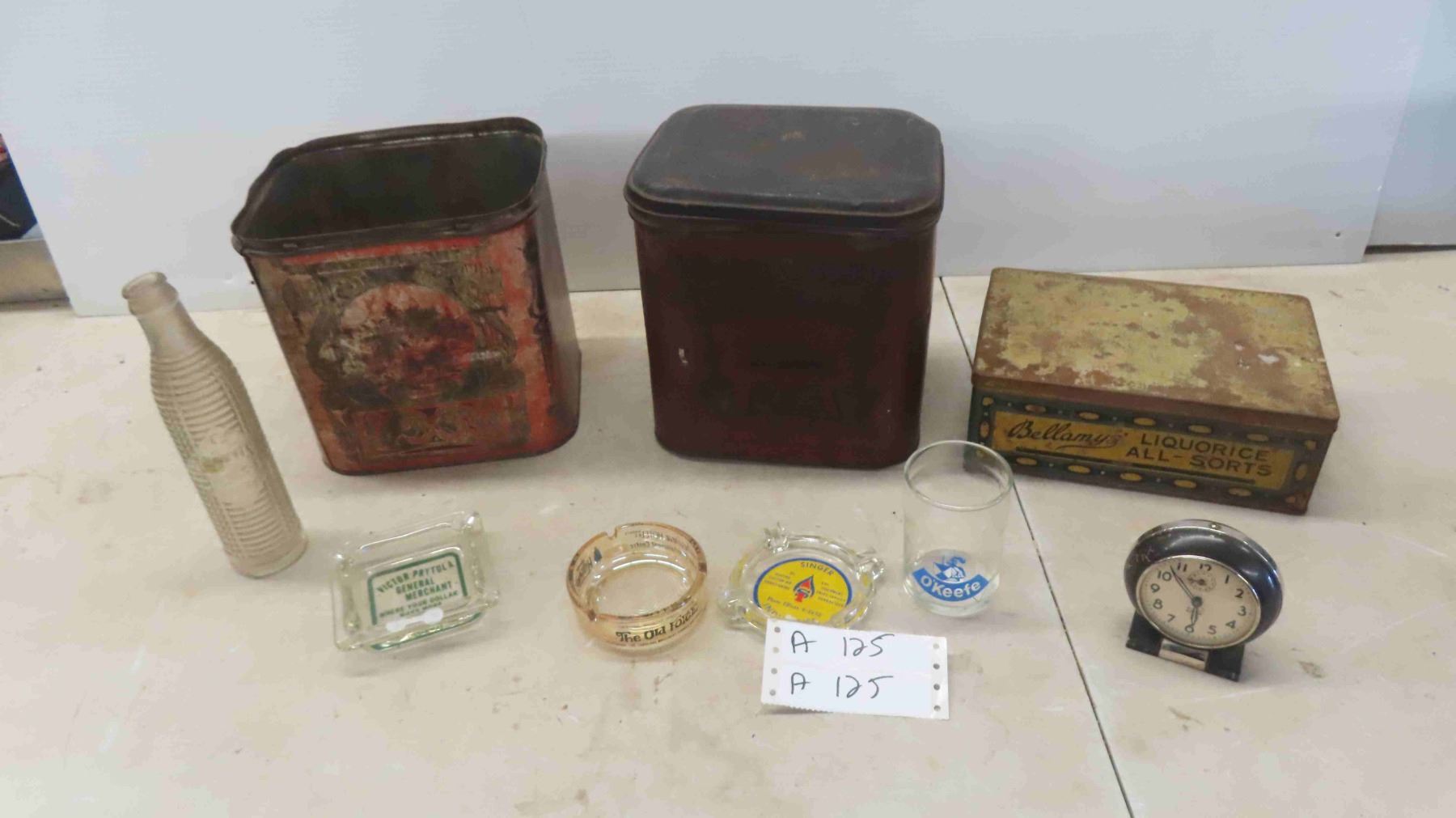 3 Tins, Ashtrays with Advertising, Glass Bottle, Beer Glass, Plus