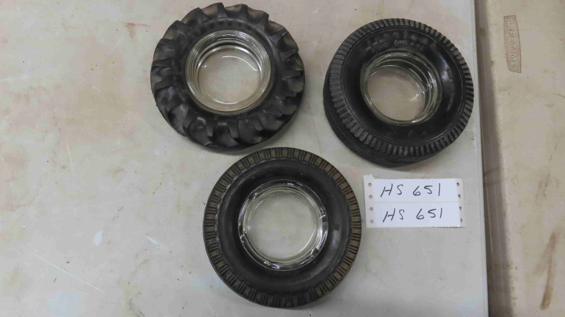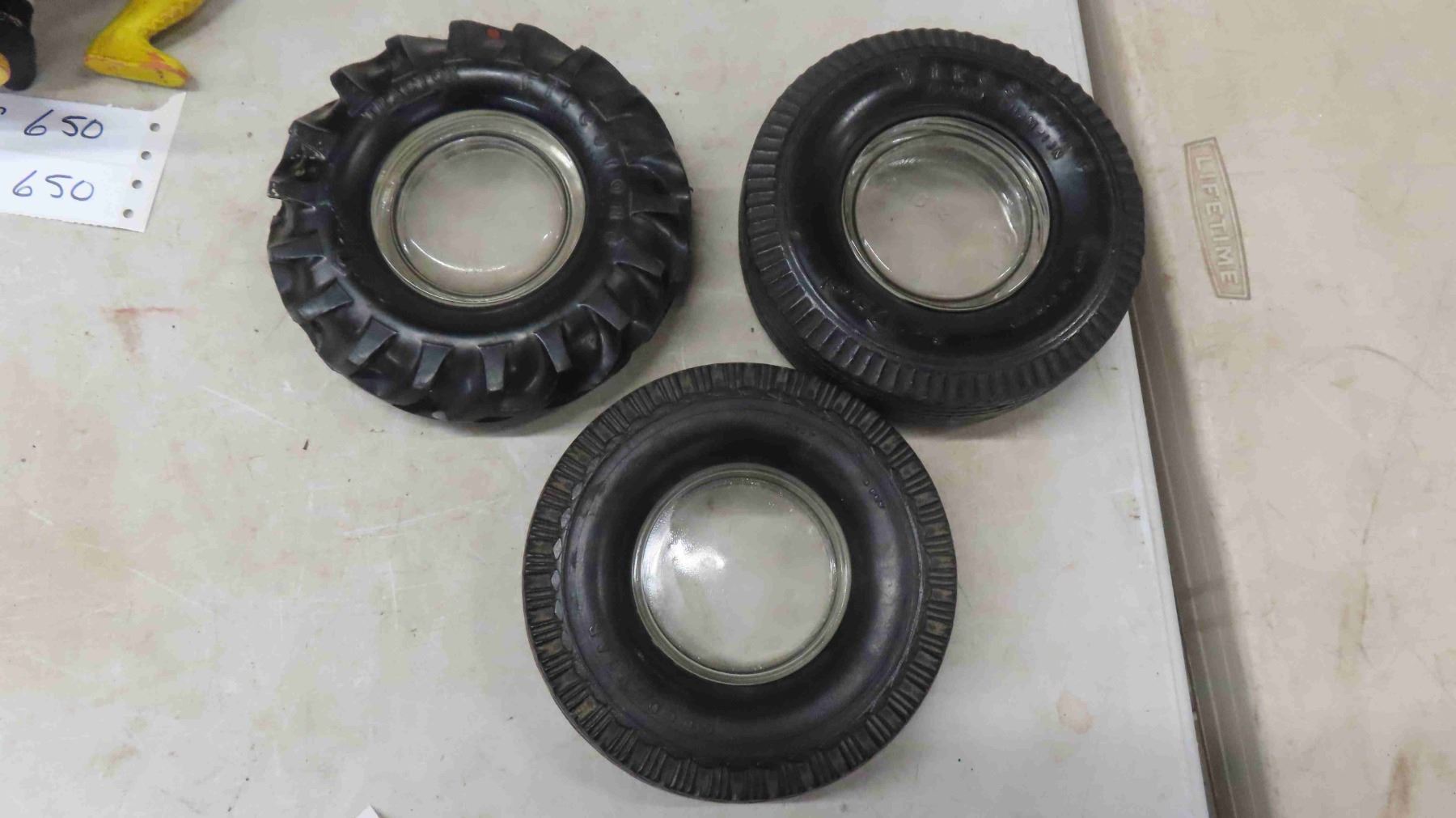 3 Tire Ashtrays ; (2) Firestone Rubber + Glass Insert, (1) Goodyear Rubber - No