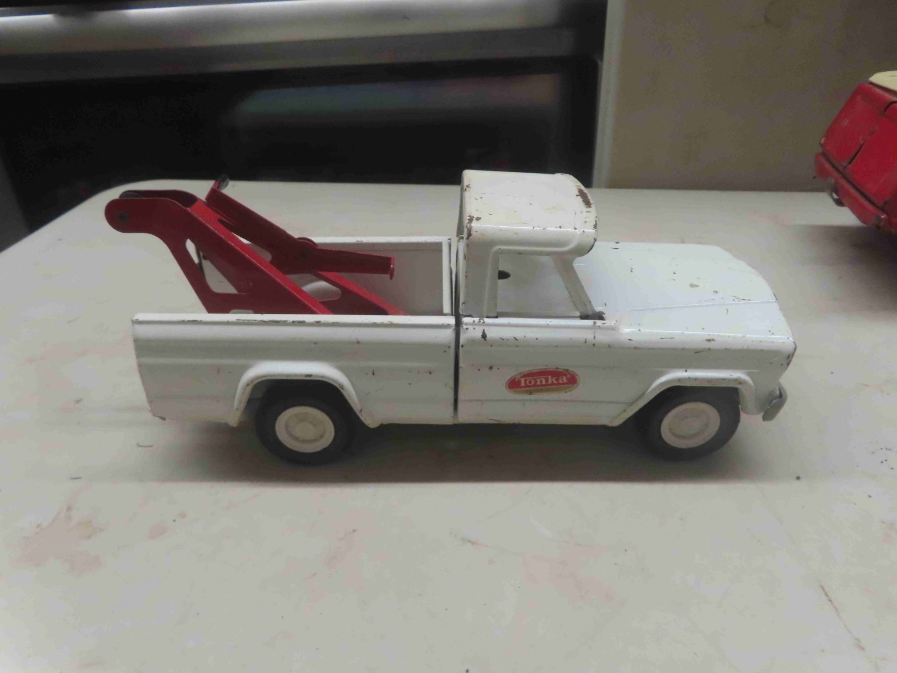 3 Tonkas; Jeep - Metal 5.5" x 5.5" x 12", Tow Truck - Metal 3.5" x 3.5" x 9", Truck ( no trailer)