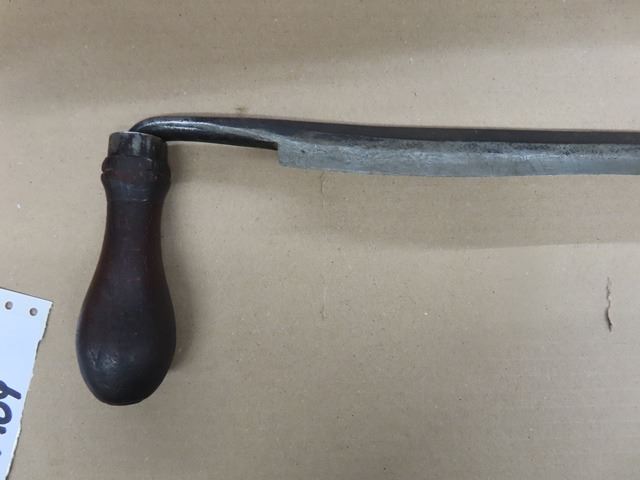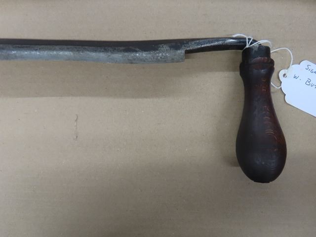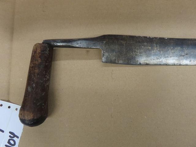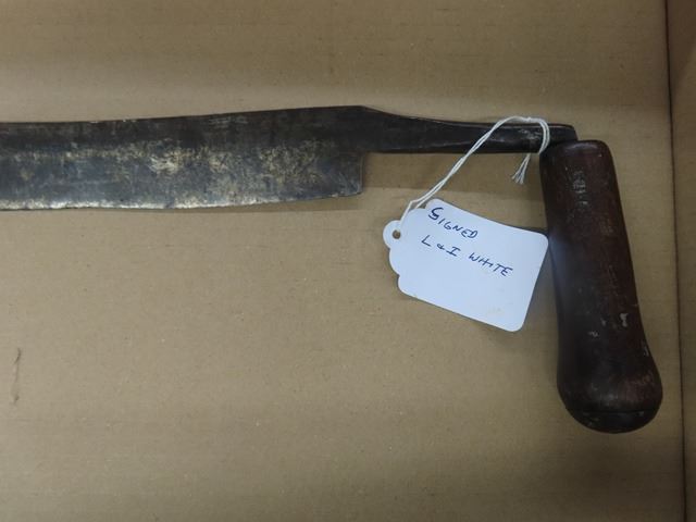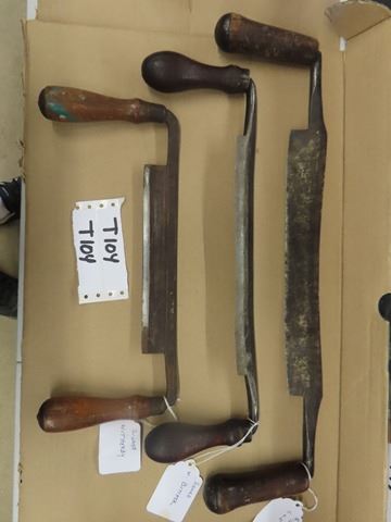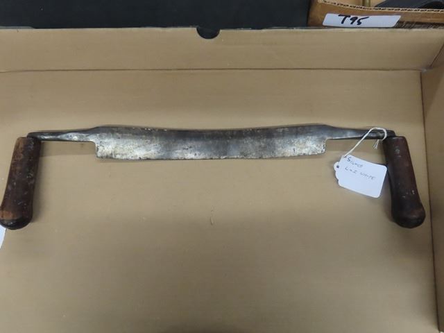 3 Vintage Antique Draw Knives: Largest is 21” long The blade is 12” wide -appears to be in good original condition- marked L & I White + (2nd) draw knife is 17” in length. - appears to be in great original condition- marked W. Butcher & 3rd draw knife is14” in width. The knife is 8” in length and in great condition except for a bit of rust but no pitting. All seems to be in original condition. There is a little green paint on the one handle to give it a little patina. Wonderful specimen.
