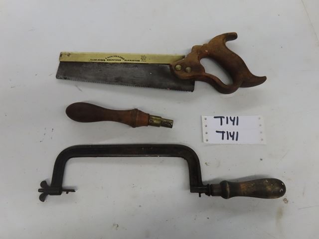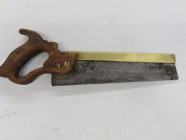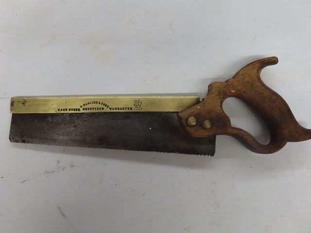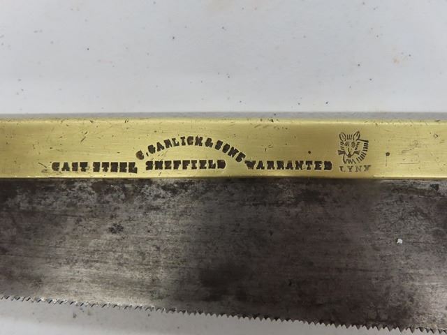 3 Vintage Antique Saws: (1) 7” keyhole Pad saw made of wood + brass without the blade. It no longer has a maker’s mark + (2nd) is a No. 40 – 8” hacksaw without blade - made in U.S.A. +(3rd) 15” G. Garlick & Sons Brass Back tenon saw - made in Sheffield England - well used but still has years left in it. It is complete with a slight notch out of the handle.