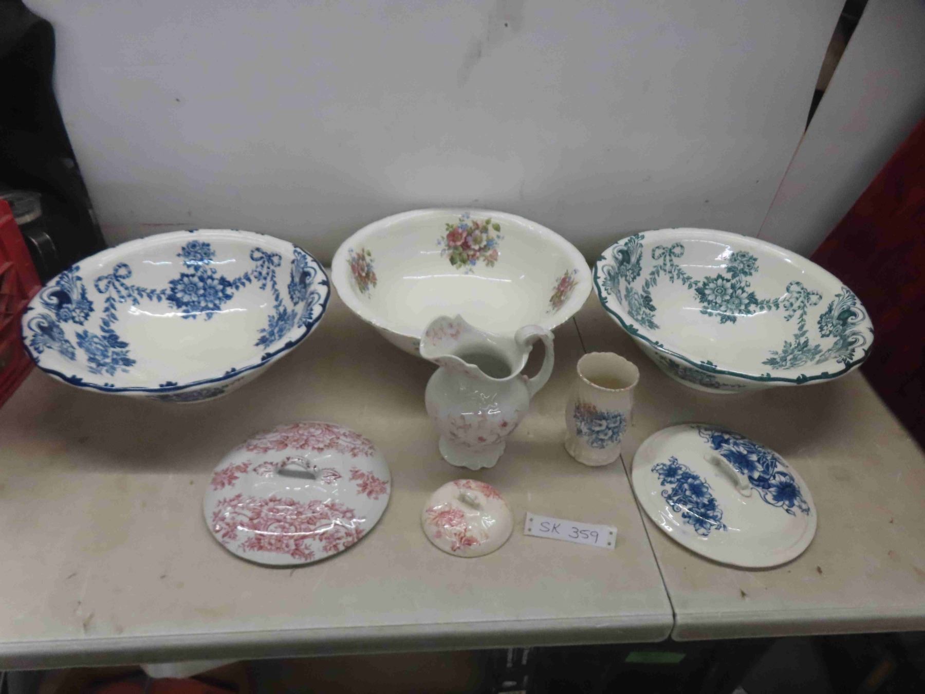 3 Vintage Basins, Pitcher, Vase & 2 Lids