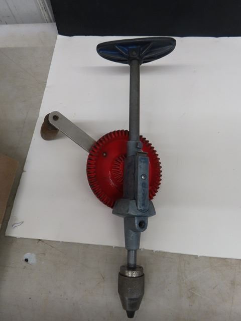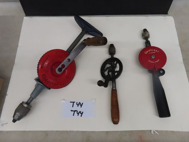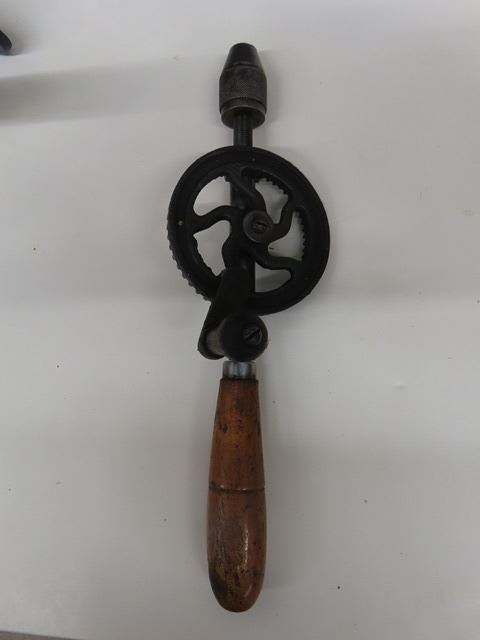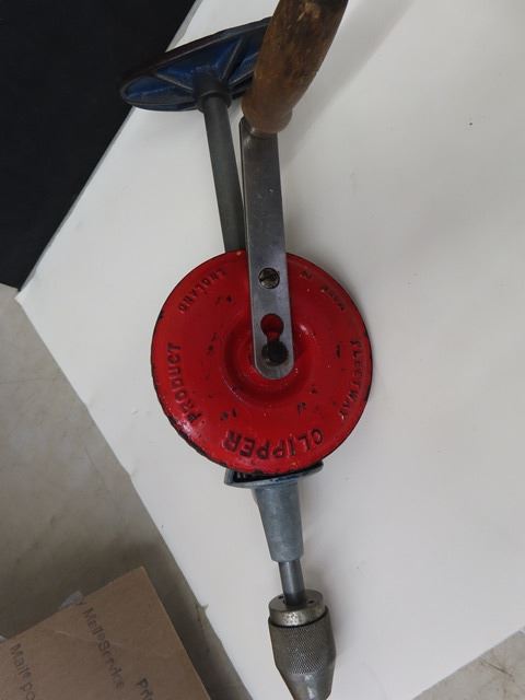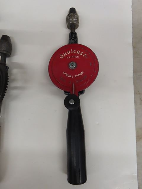 3 Vintage Egg Beater Drills; Smallest at 10.5"- marked Jordon Germany + 12.5"is Qualcast clipper double pinion- made in England + 16" large shoulder drill by Fleetway CLIPPER product - made in England.