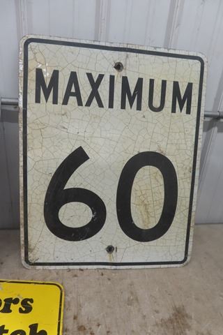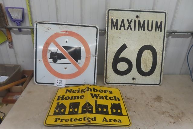 3 Vintage Traffic Signs ; Maximum 60, No Heavy Trucks, Neighbourhood Watch - Largest 24" x 29.5"
