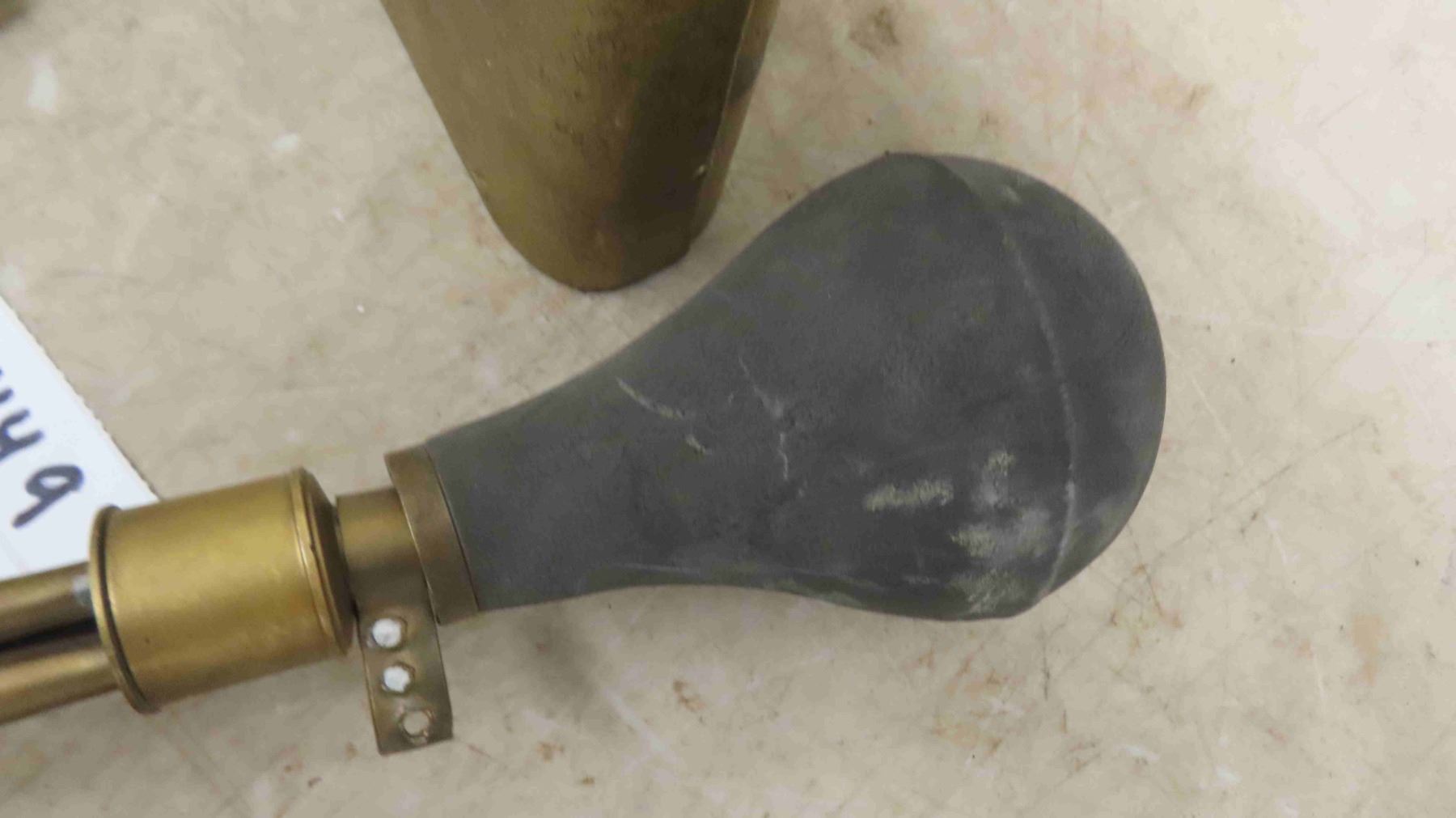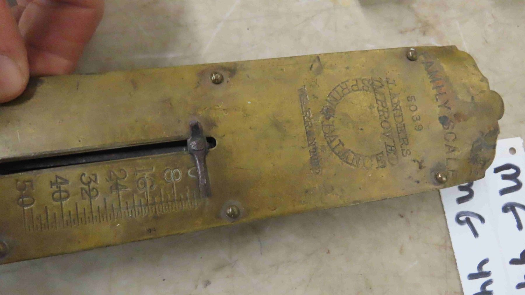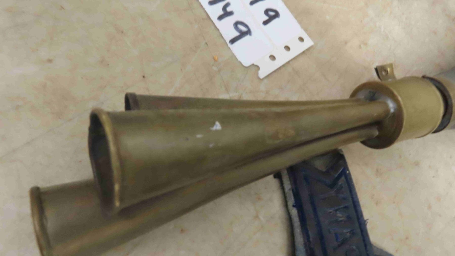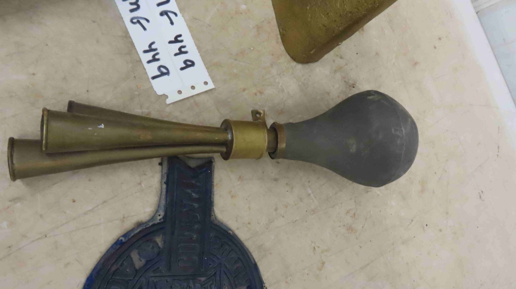 3 Way Squeeze Horn, Open Cow Bell, Hanging Scale, 3 Quart Oil Can Funnels, Winnipeg Lake of the Woods Company Stamp