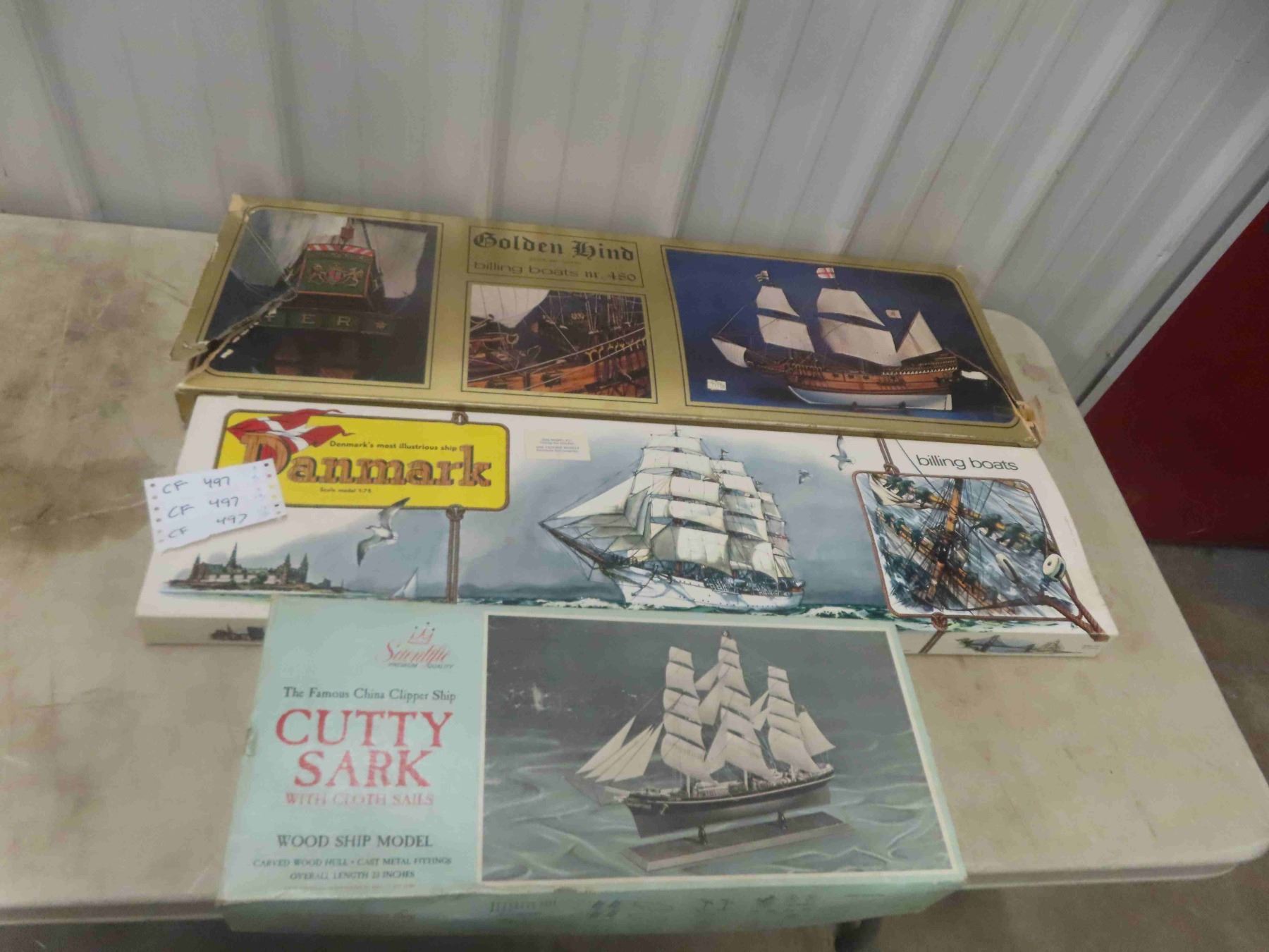 3 Wooden Ship Models: Danmark 1:25 Scale, Cutty Sark 23" Long, Golden Hind 480