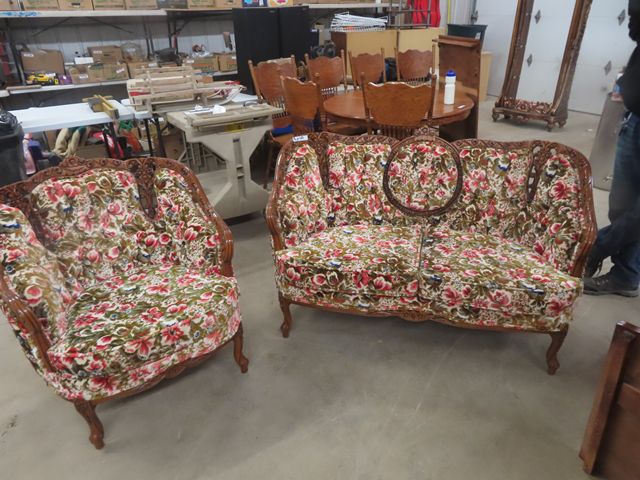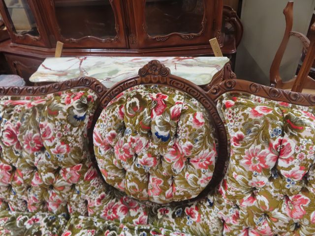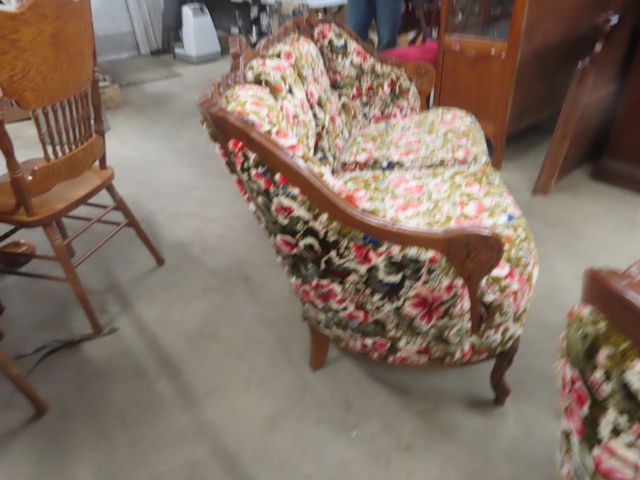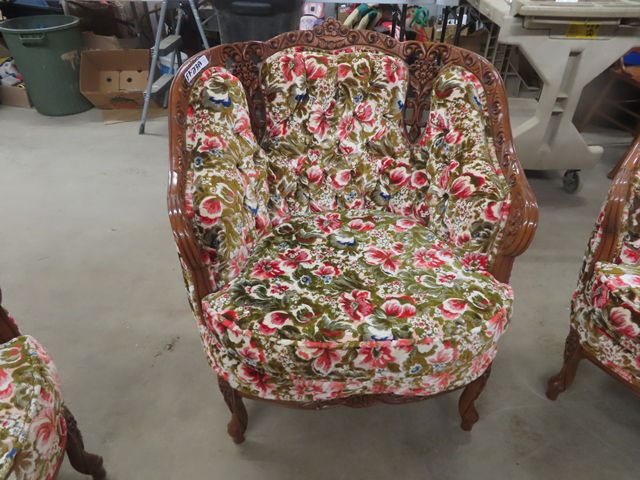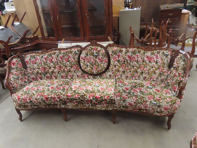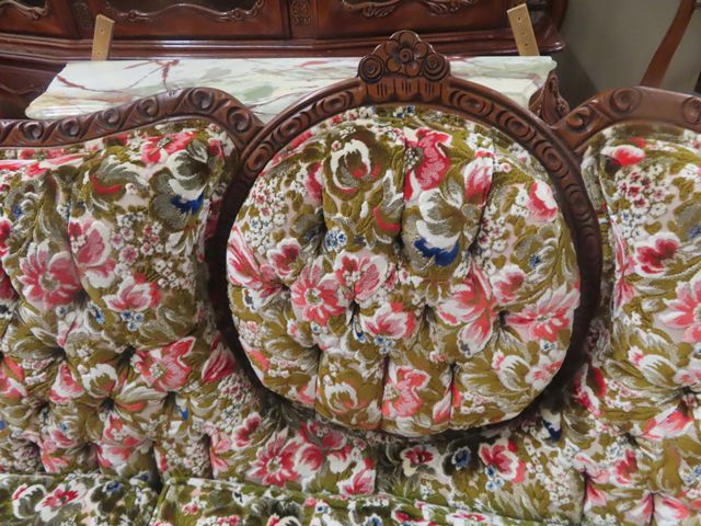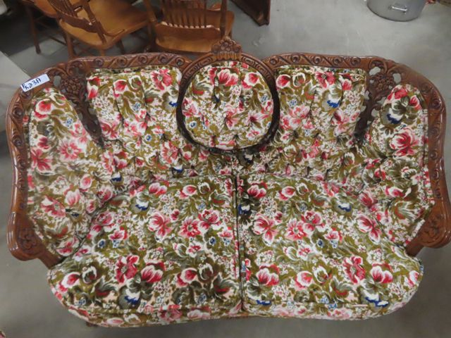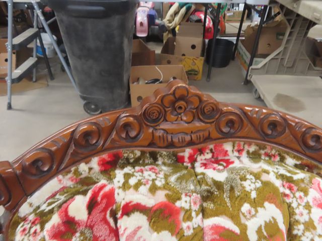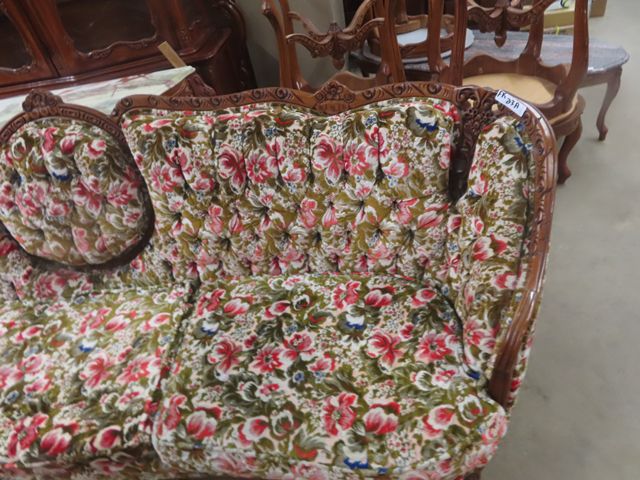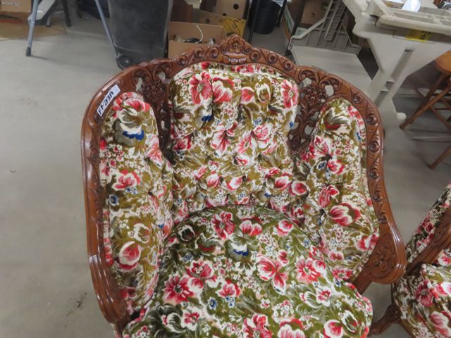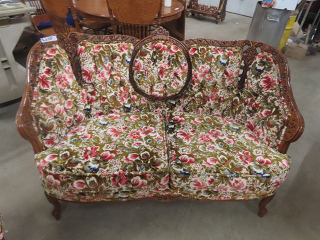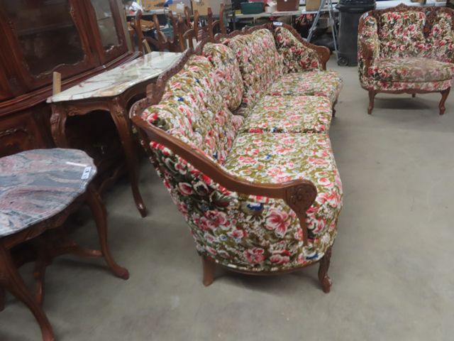3 pc Vintage Couch, Love Seat, Chair - Nice Carved Wood + Fabric in Good Condition