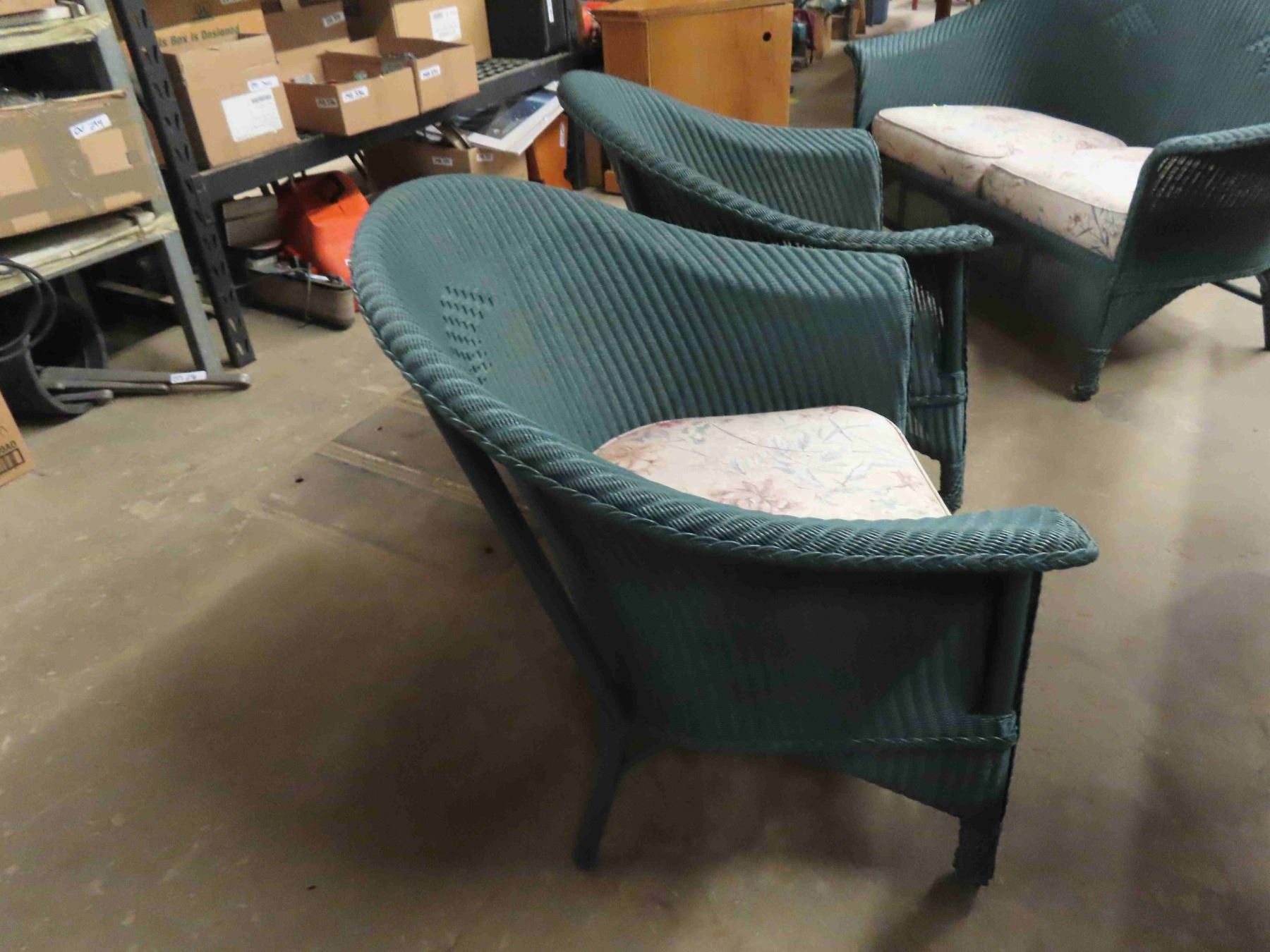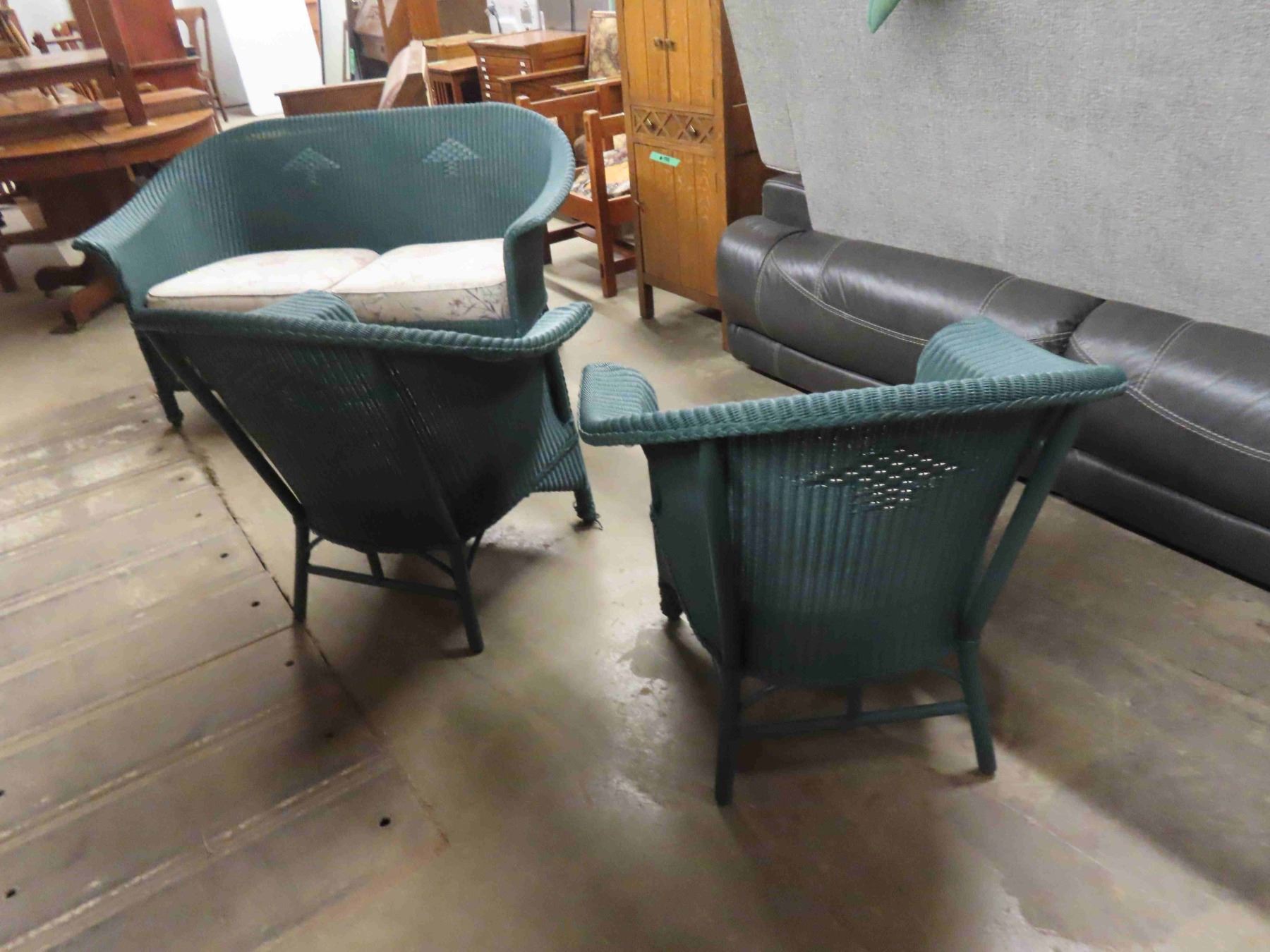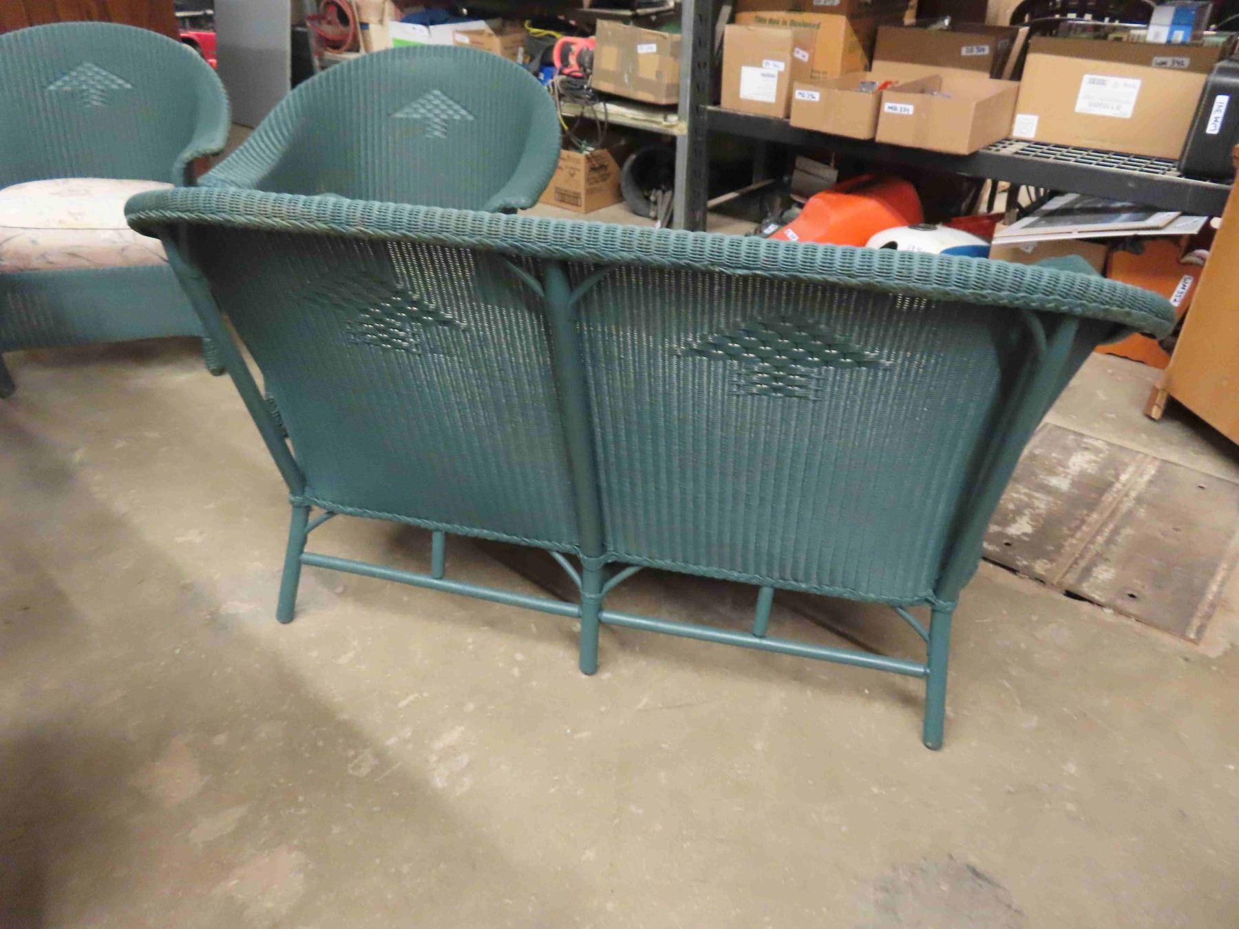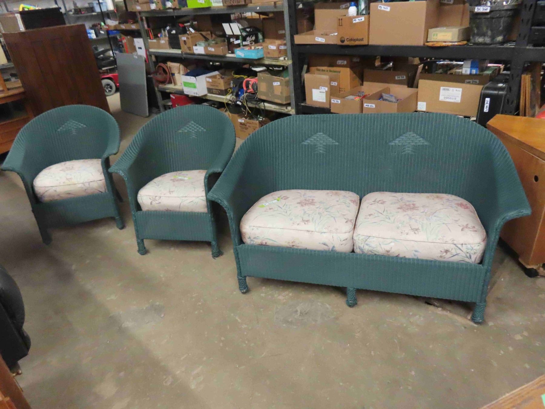 3 pcs of Wakefield Wicker Furniture - one settee and two matching chairs - some restoration and are now painted an era appropriate vintage green colour - one small rip on the side of one of the cushions which are spring filled. A beautiful set for old or new homes.