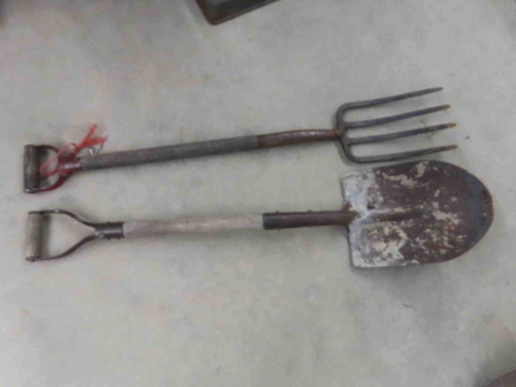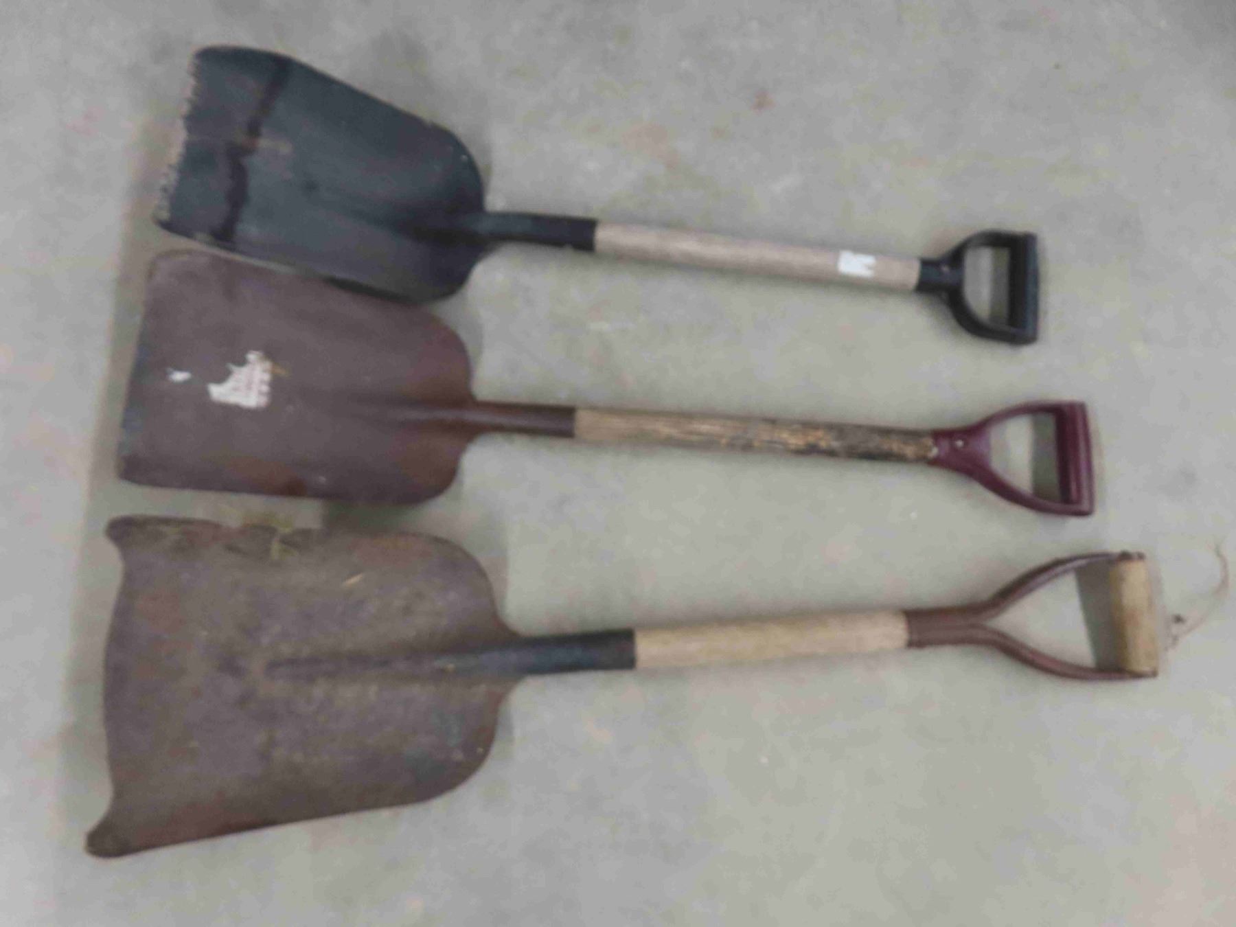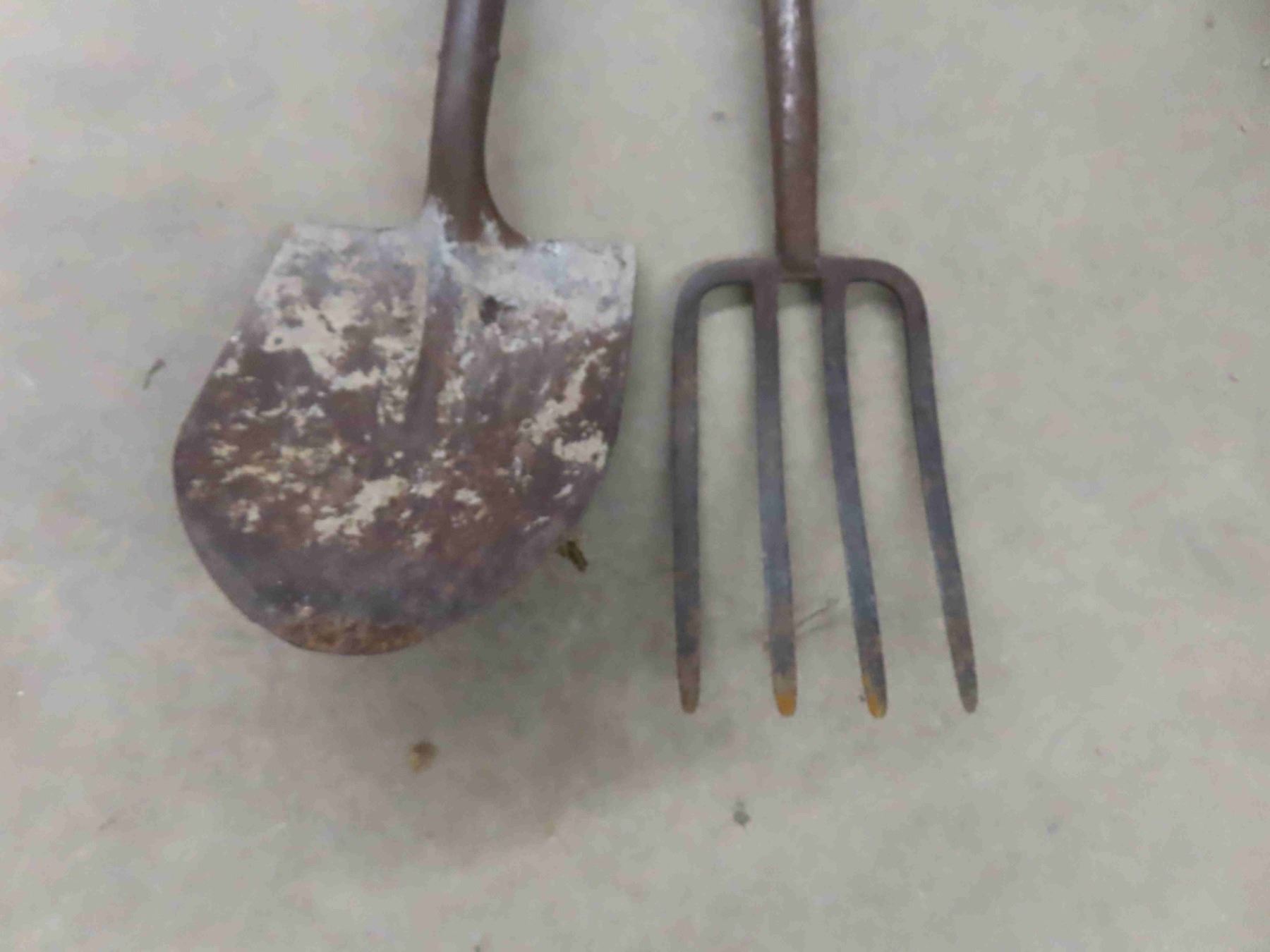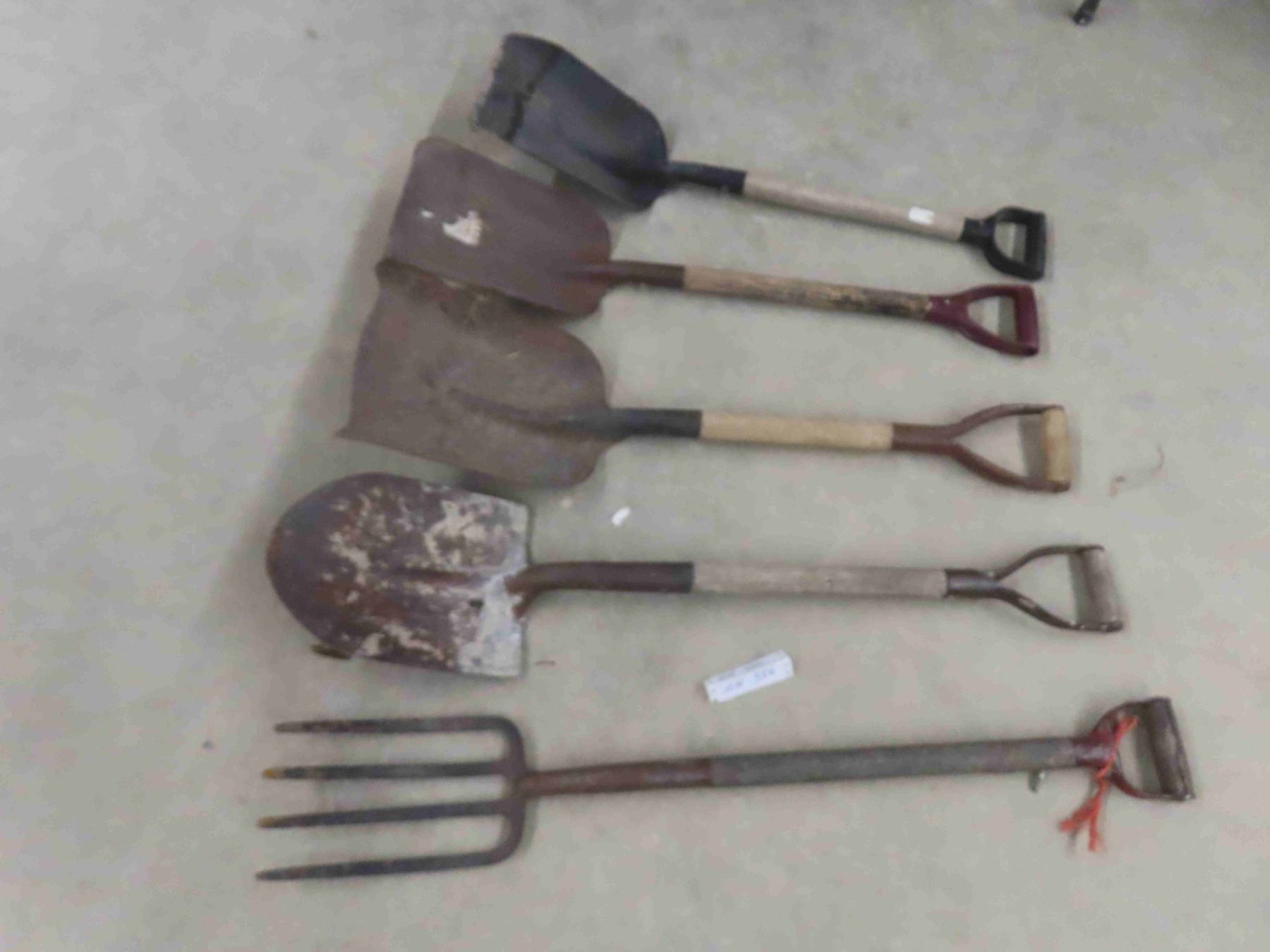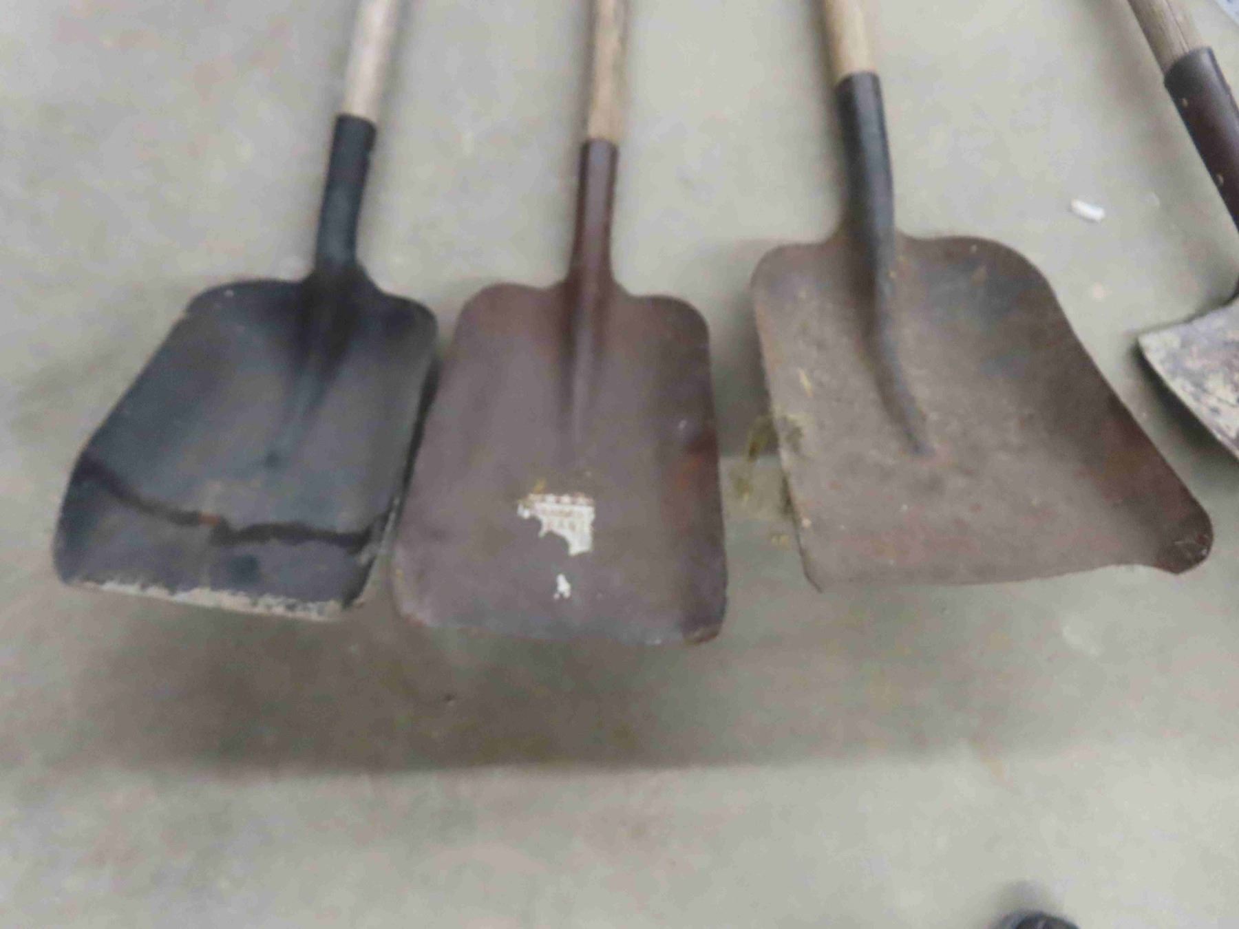 3 yard tools; scoop shovels, spade and potato forks.
