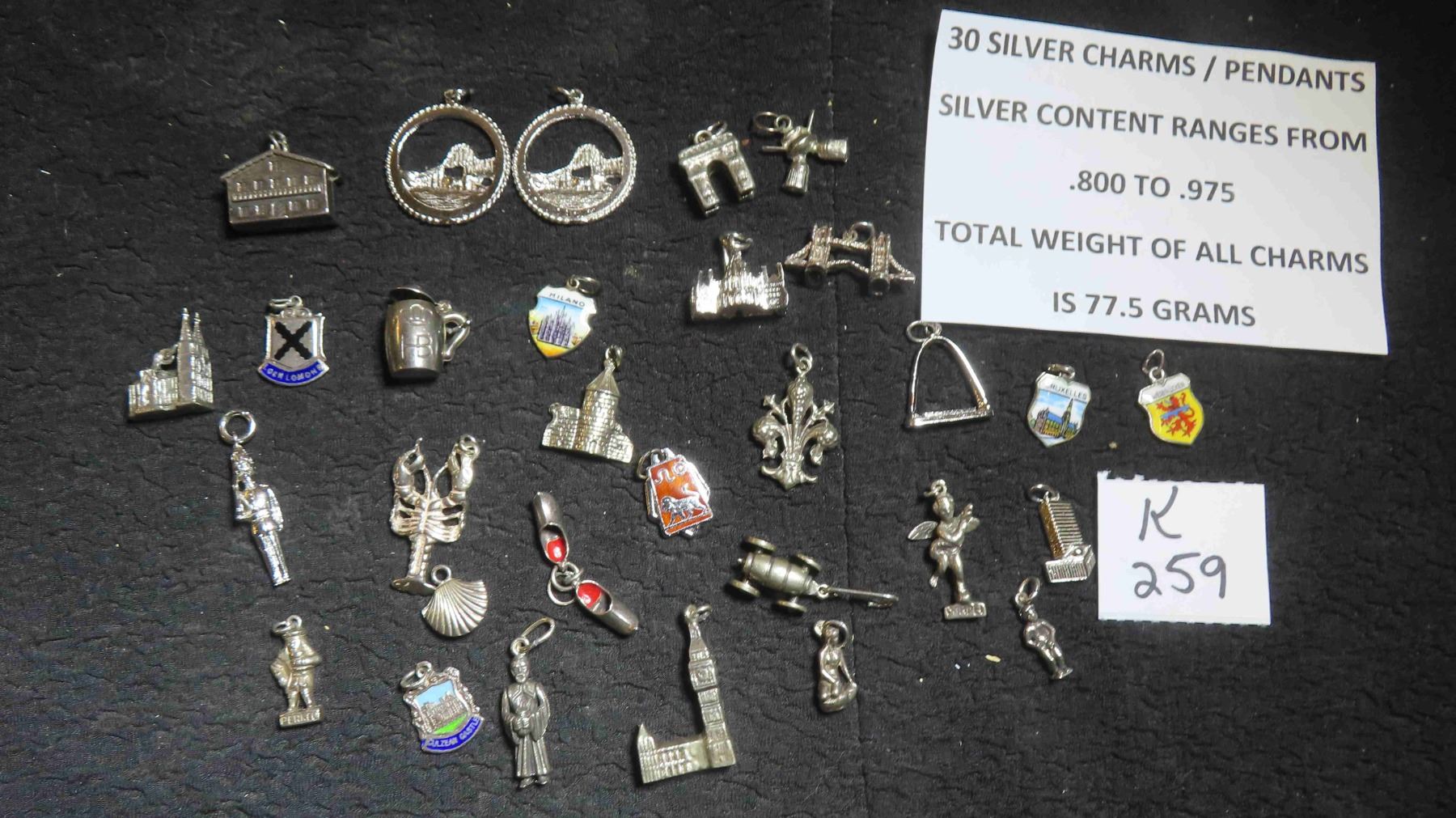 30 Silver Charms/Pendants - Silver Content Ranges from .800 to .975 Total Weight (For All) 77.5 Grams