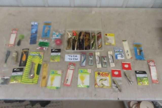 30 Vintage Fishing Lures + Hooks in Packages, Plastic Tray with Many Used