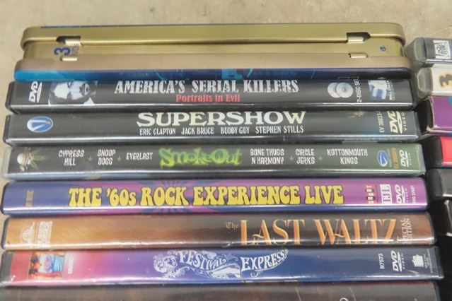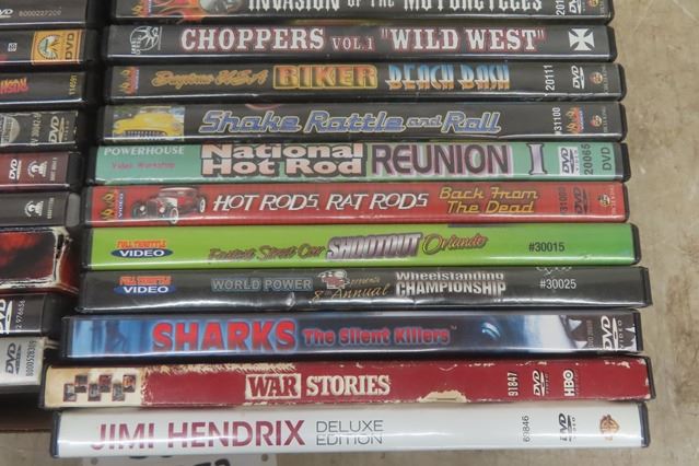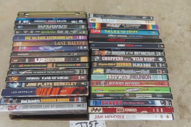 34 Assorted DVDs ; Jimi Hendrix, 60's Rock, Hot Rods, Robot Chicken, WKRP plus more