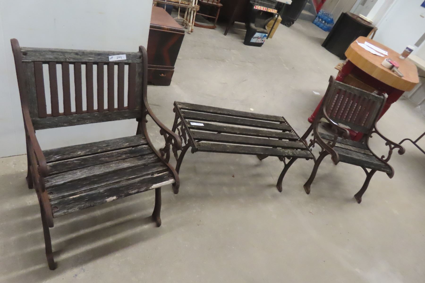 3pce Yard Furniture: Weathered Wood and Cast (2) Seats 23'' Wide & Bench/Stand 16'' x 36'' x 18''