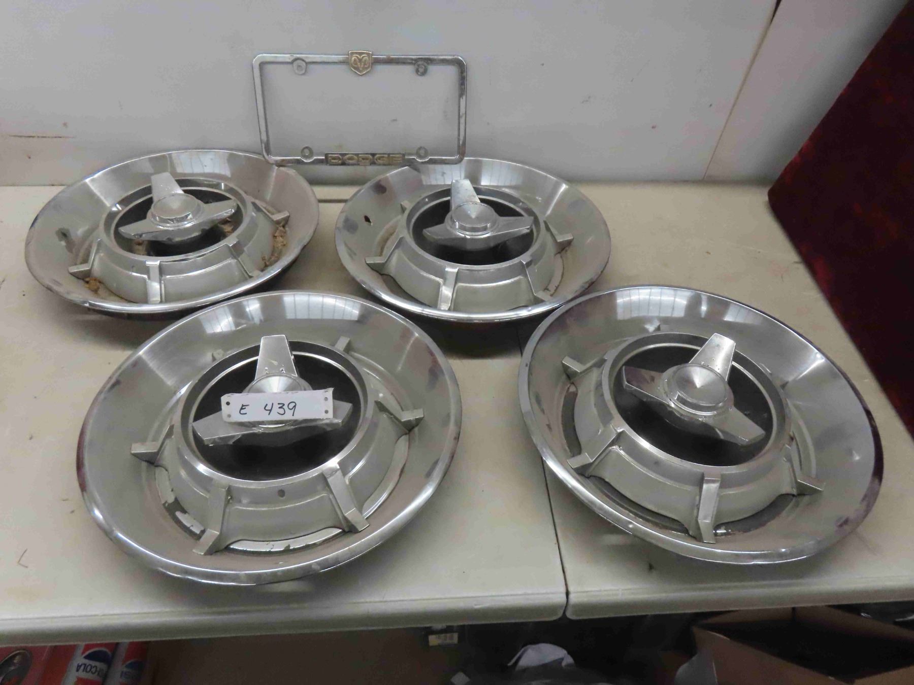(4) 1966 Dodge Charger , Superbee, Coronet Hubcaps, Chrome Dodge License Plate Holder