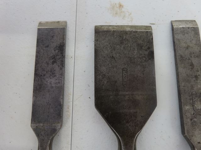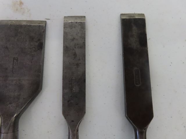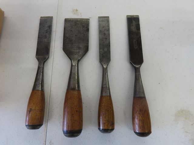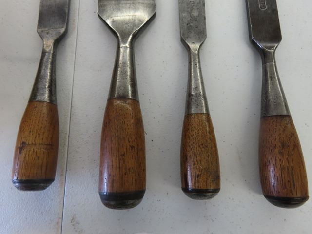 4 Antique Vintage Woodworking Stanley “Everlasting “Chisels. All 4 have a square edge: Largest is 2” wide with Stanley Sweetheart of New Britain Conn. Mark. There are 2 others: 1” & 7/8”- have a Stanley mark in the middle of the blade. They have the same patent 1493176. The 4th chisel is also 1” in width- mark illegible