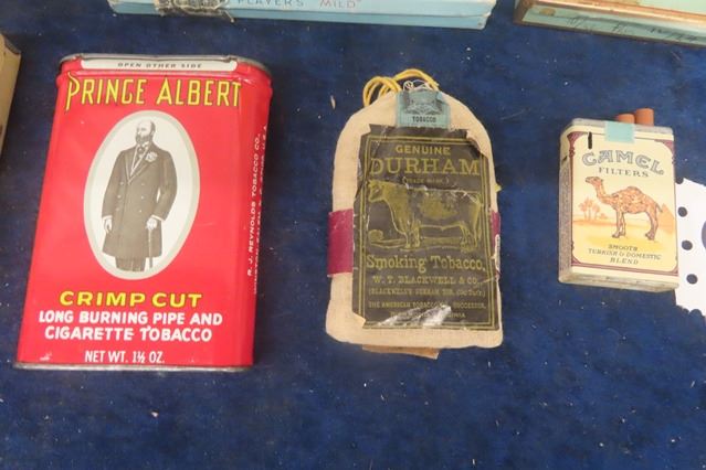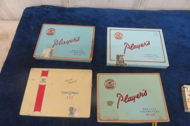4 Cigarette Tins; Players, Three Threes, Prince Albert Pocket Tin, Durham Tobacco Pouch, Camel Advertisement Lighter