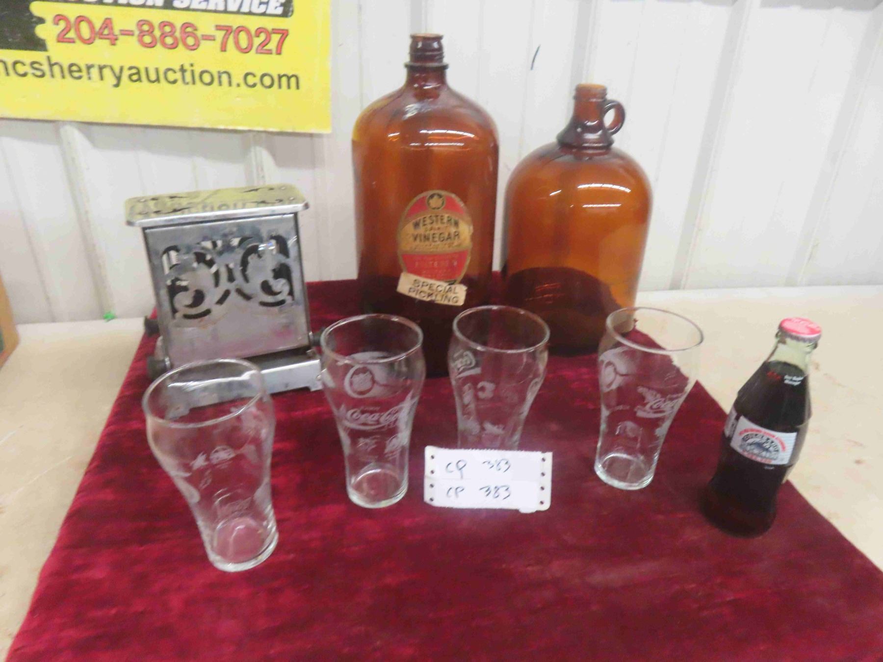 4 Coca Cola / NHL Glasses , Coke Bottle, Rockies Vinager Jug, Drop Side Toaster