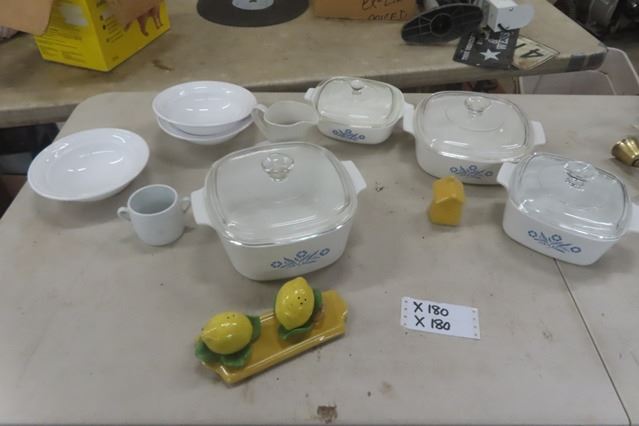 4 Corningware Covered Serving Dishes, Bowls, Lemon Salt + Pepper Shakers