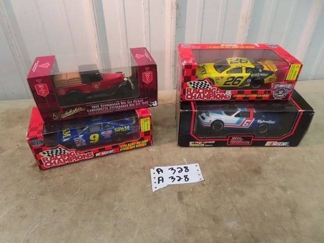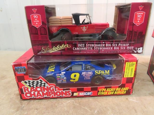 4 Die Cast Toy 1/24 Scale Vehicles 1) Canadian Tire 1922 Studebaker Big Six Pickup & 3) Race Cars